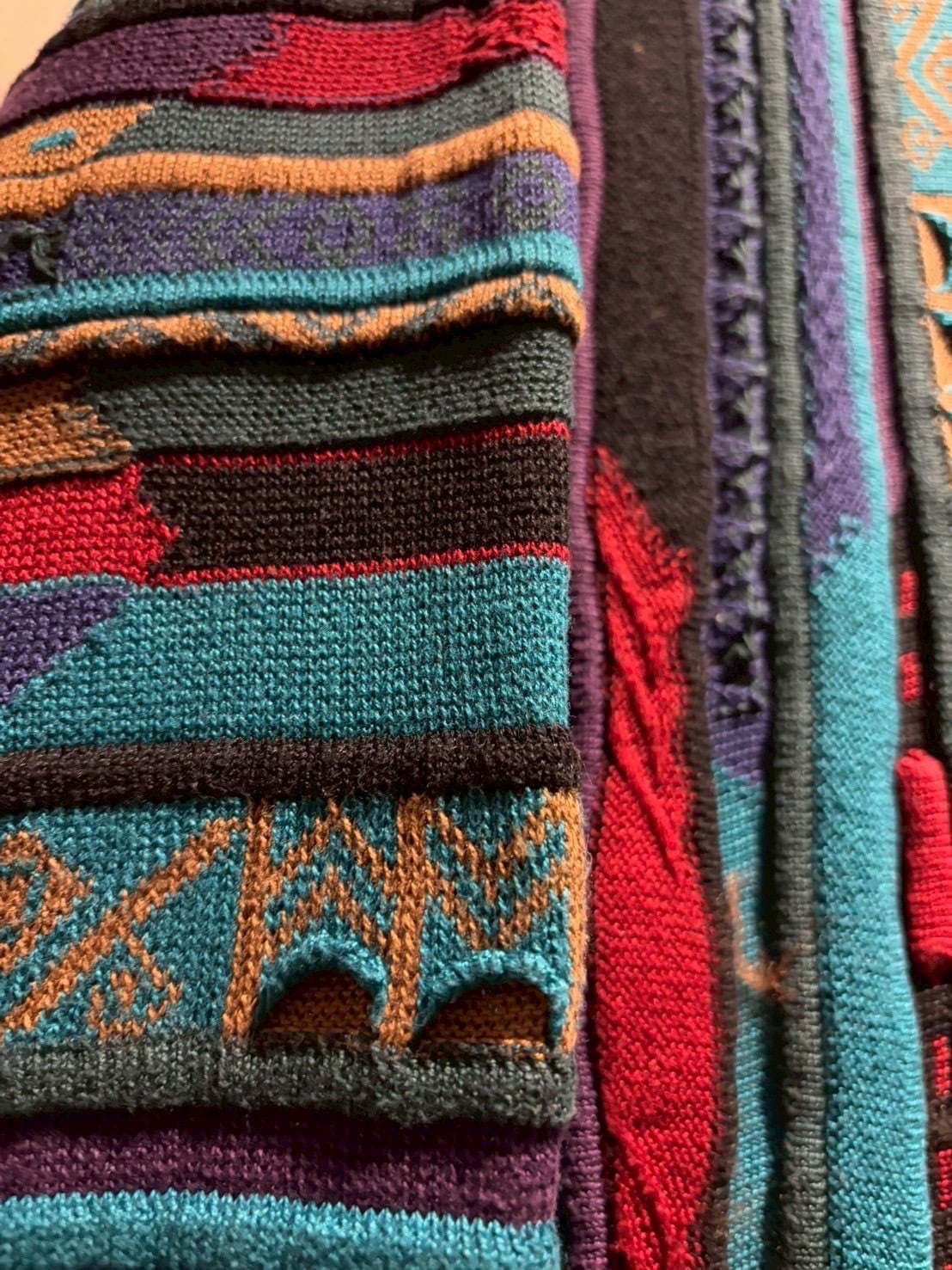 これぞ3Dニットといったランダムな配色が◎多色使いながらも、まとまりのあるカラーバランスに柄模様を組み込んだ高いニッティング技術、さすが"TOSANI"の一言に尽きます。