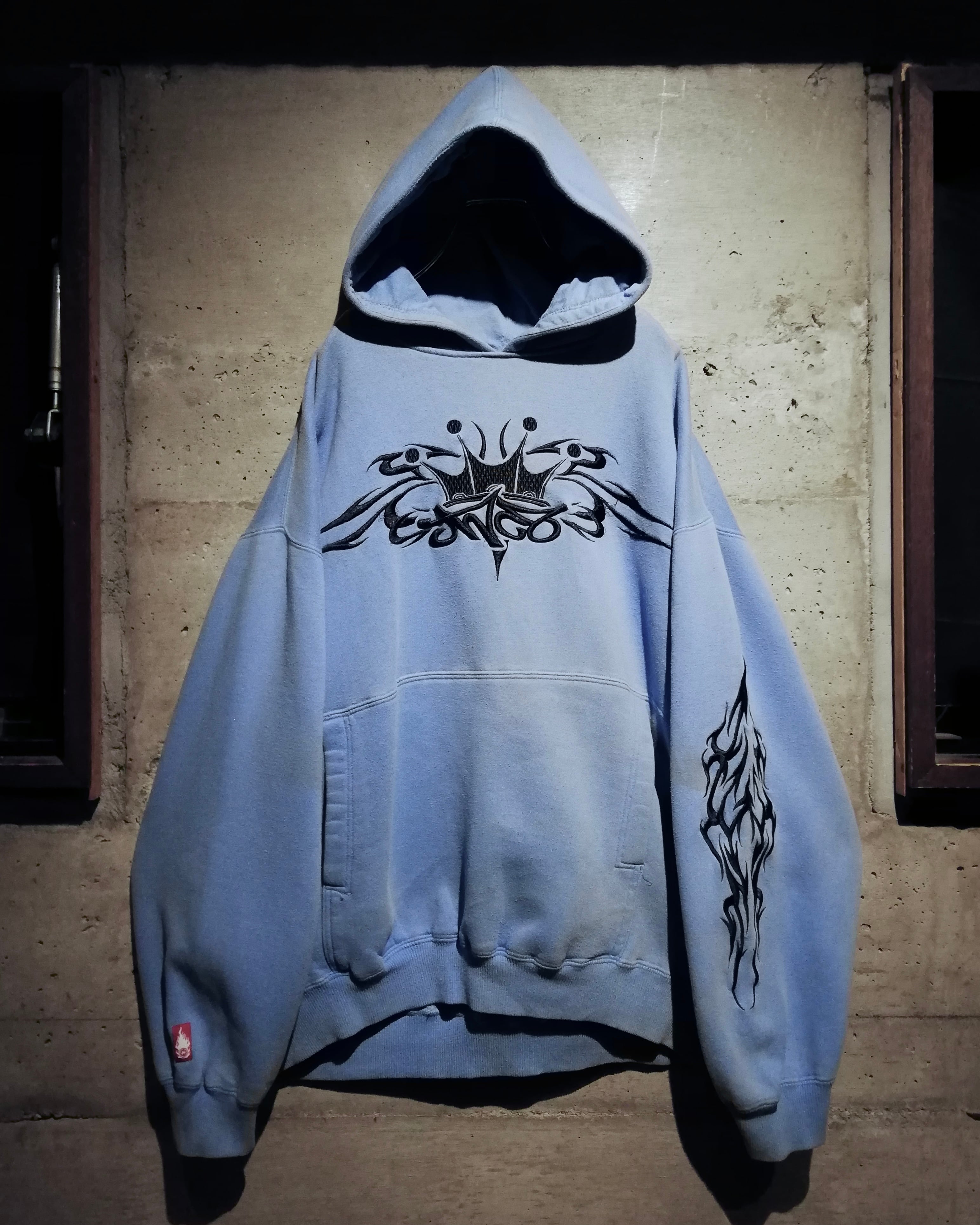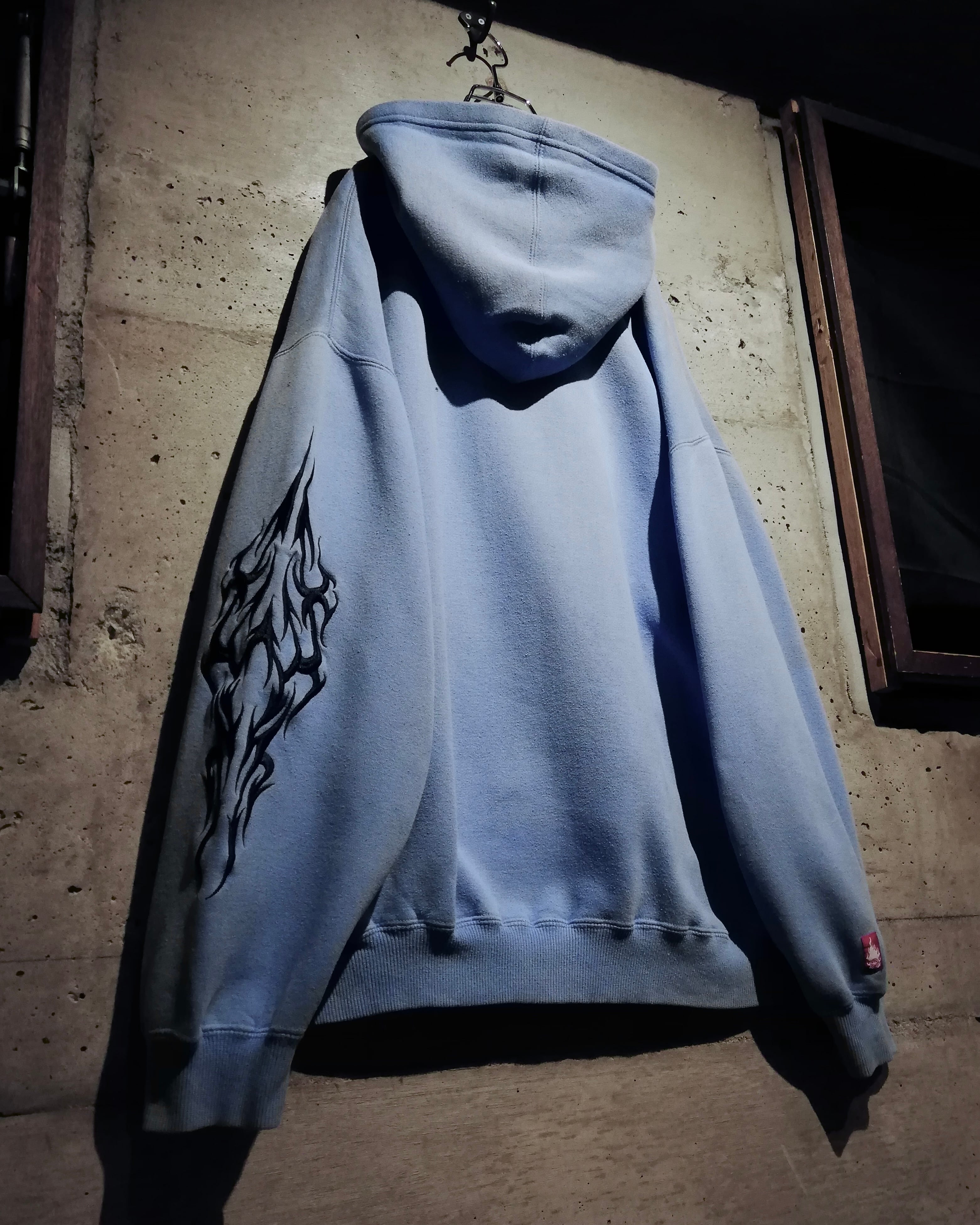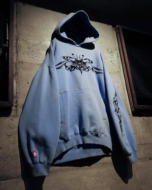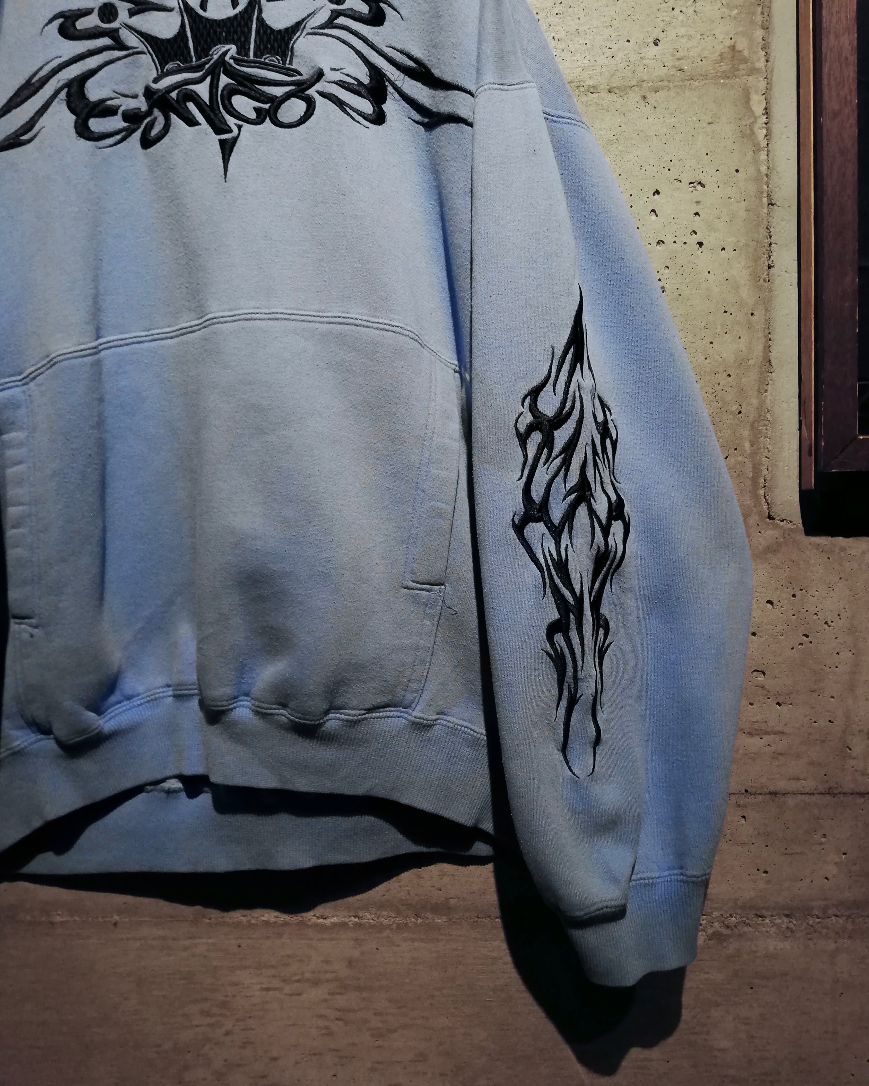 フェードの効いたアイスブルーのボディをベースに、フロントにはトライバル調のロゴ刺繍、左袖にトライバルモチーフの刺繍を施したプルオーバーフーディー。