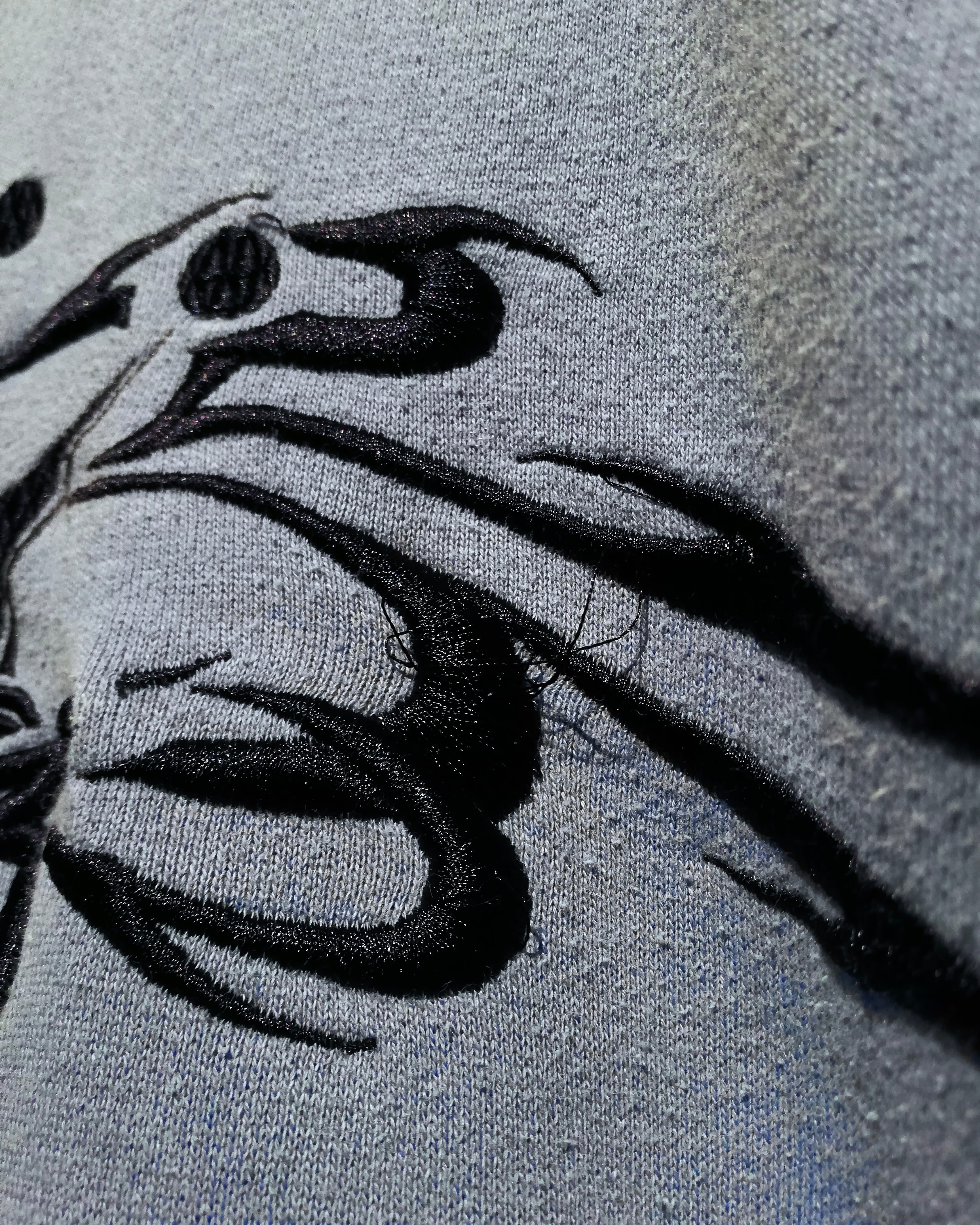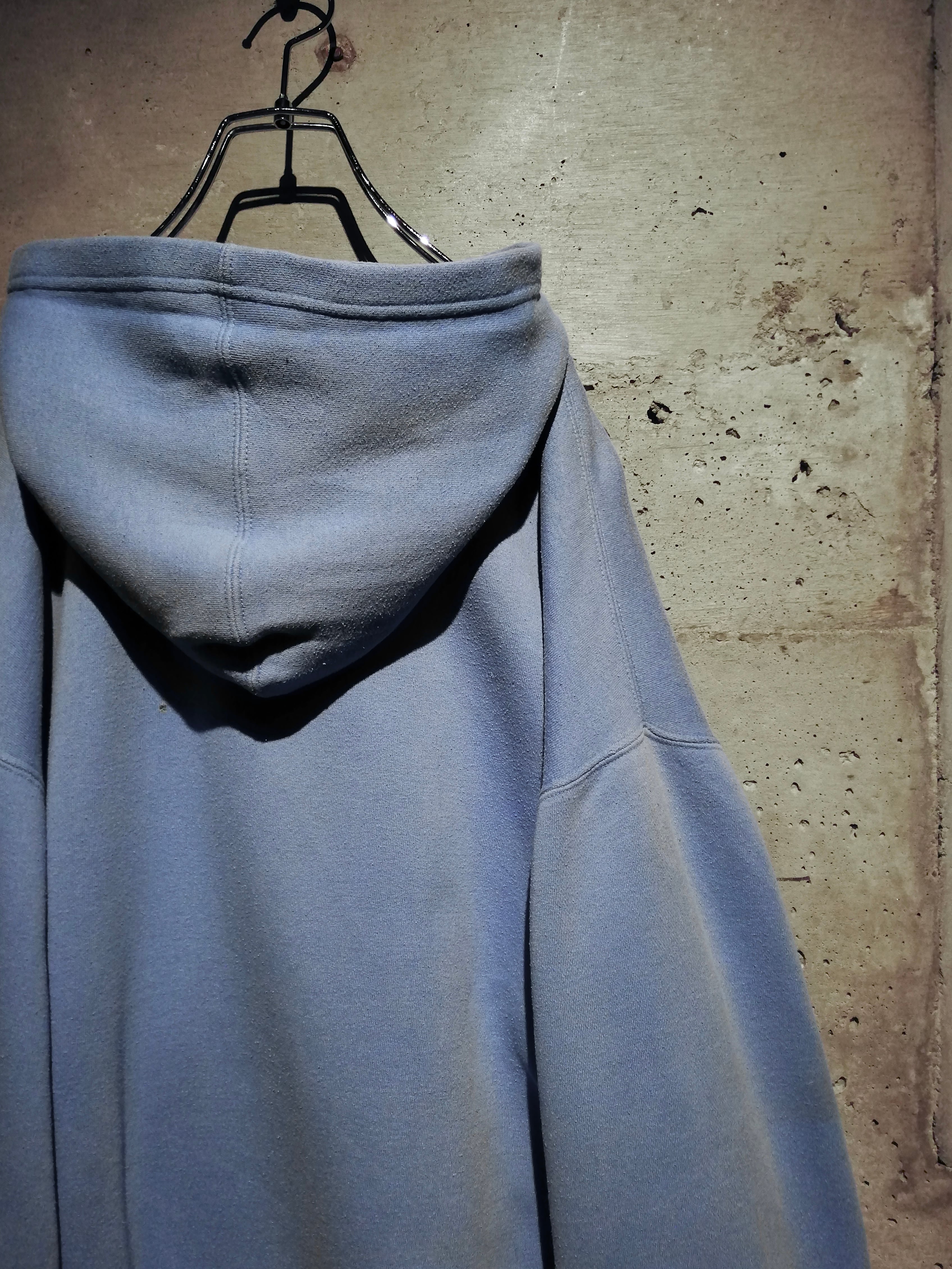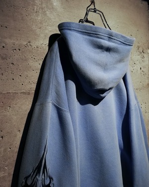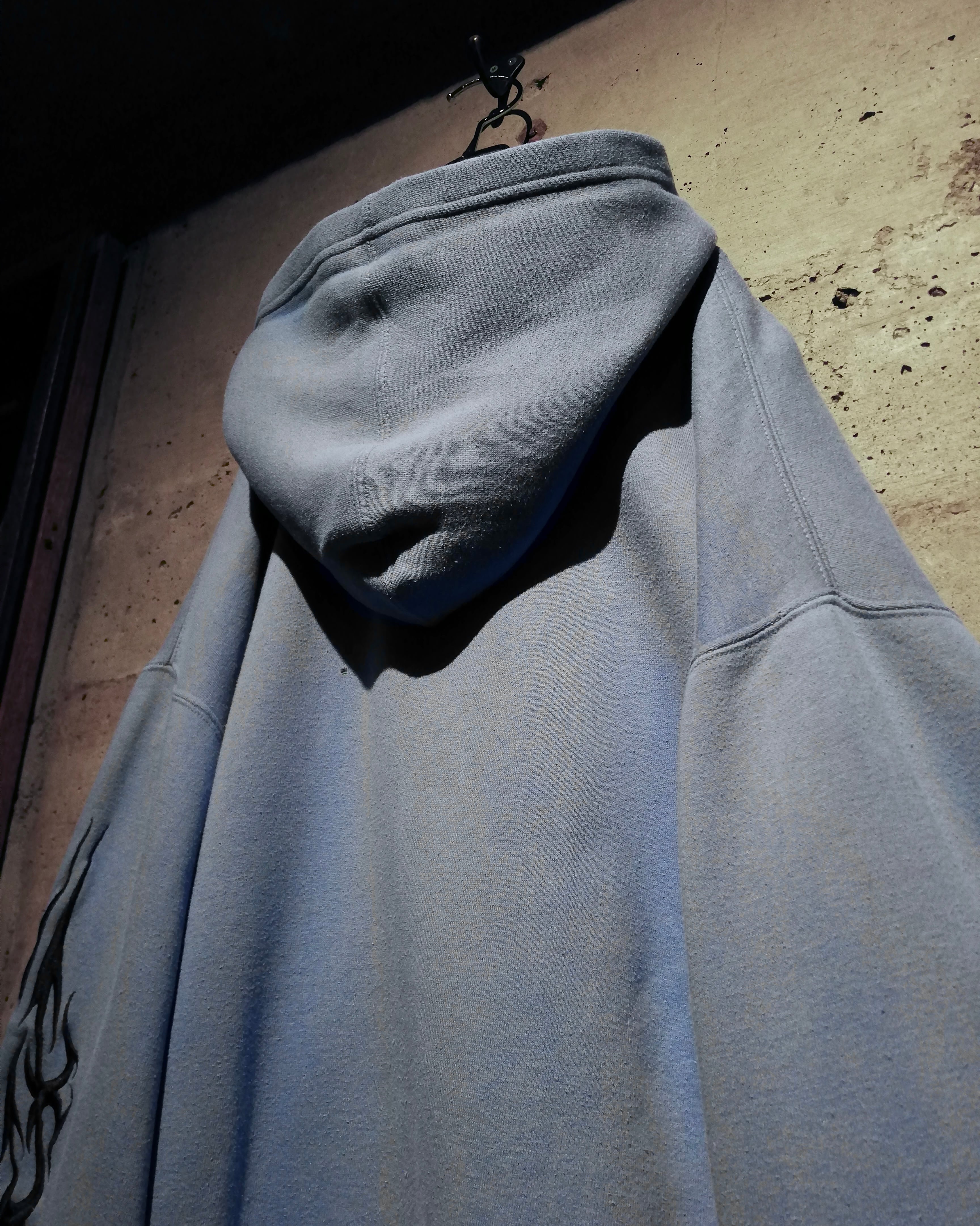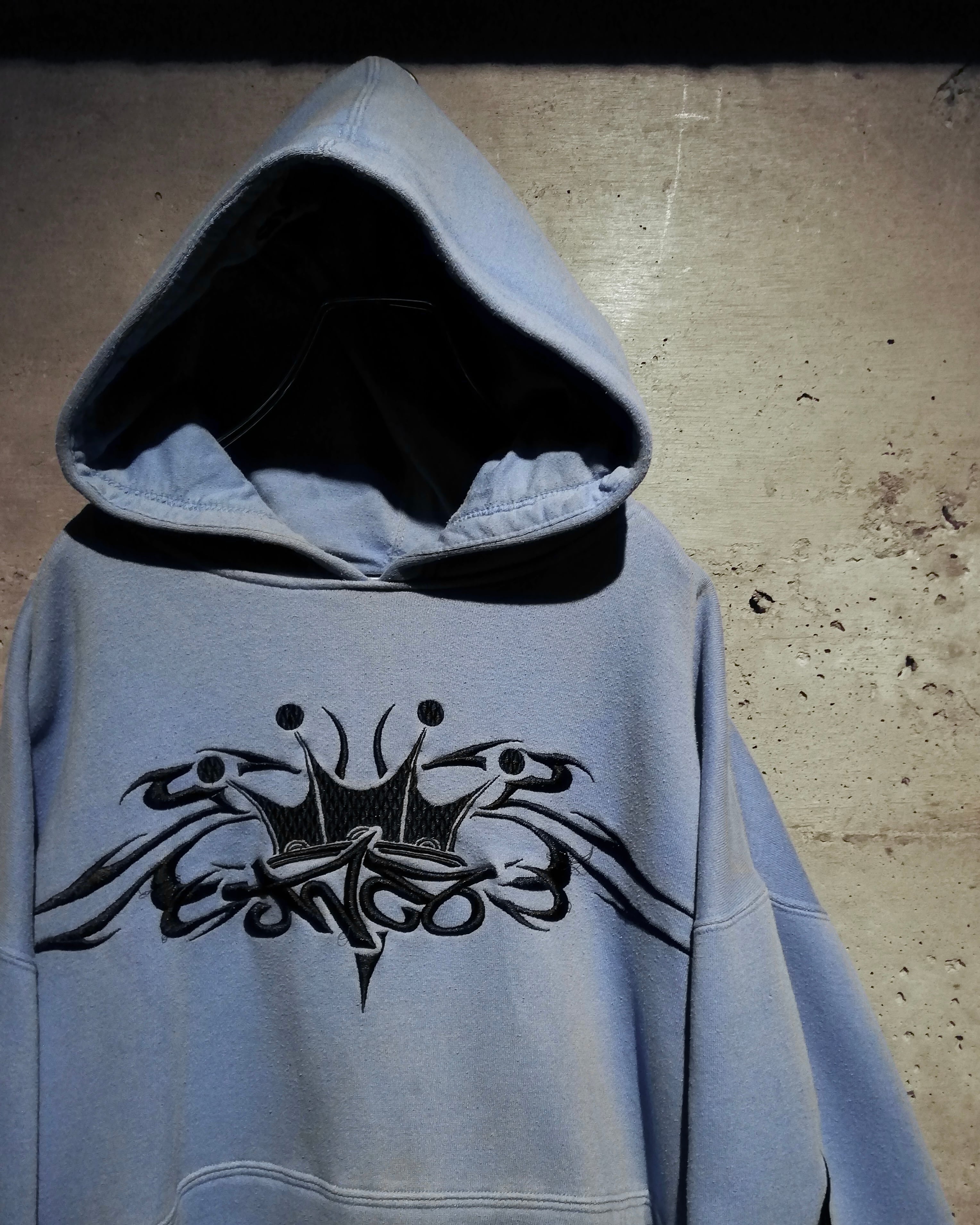 フェードの効いたアイスブルーのボディをベースに、フロントにはトライバル調のロゴ刺繍、左袖にトライバルモチーフの刺繍を施したプルオーバーフーディー。
