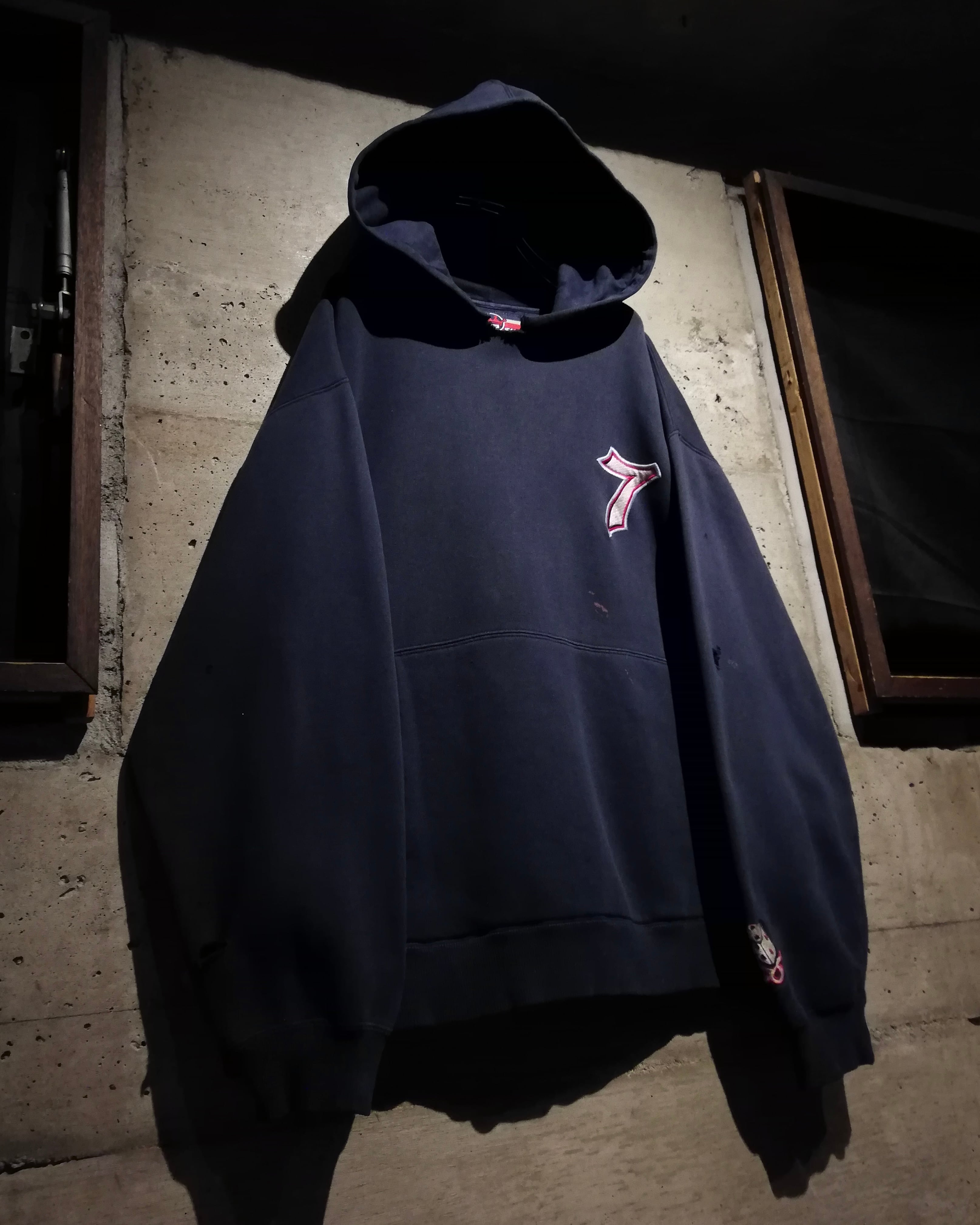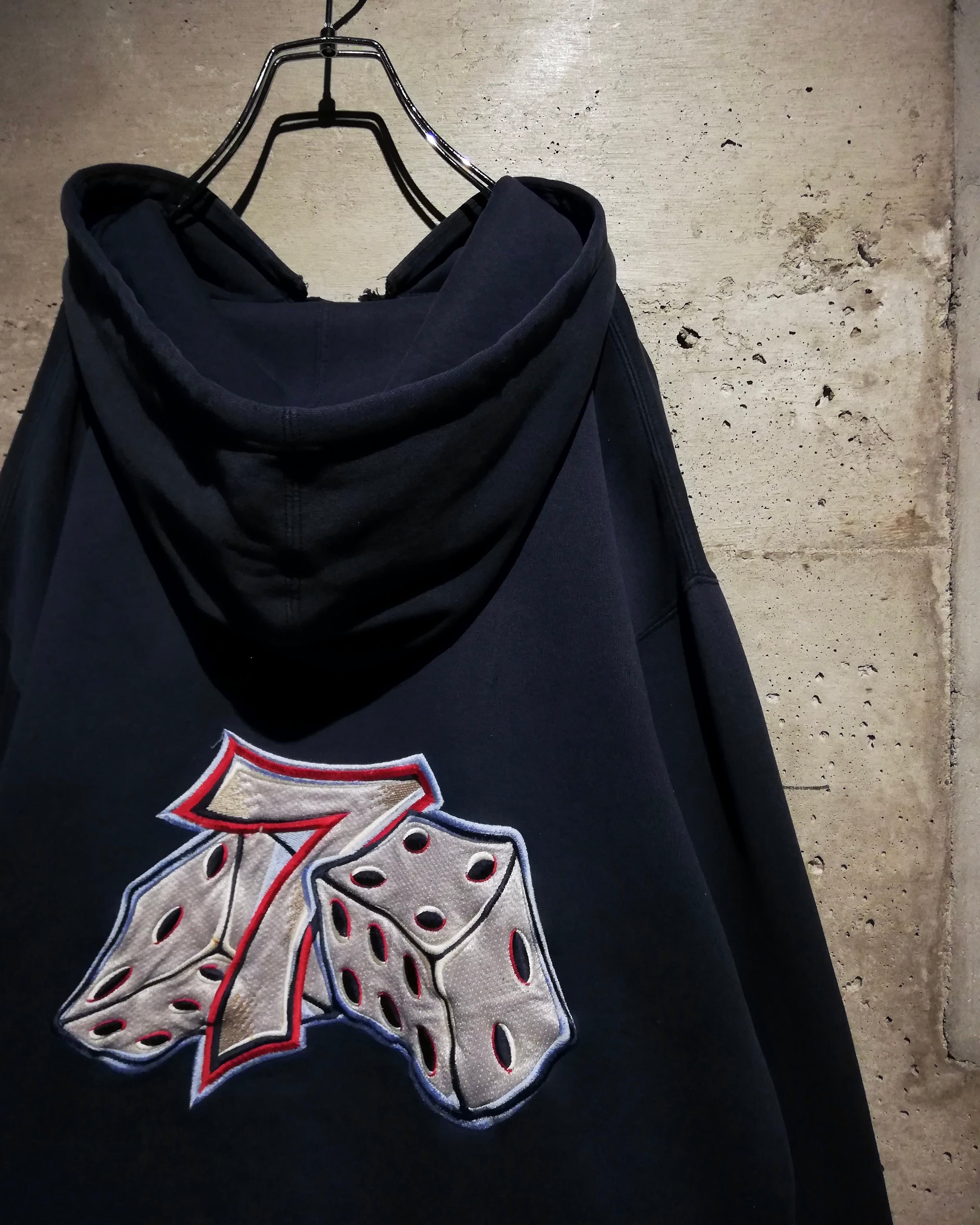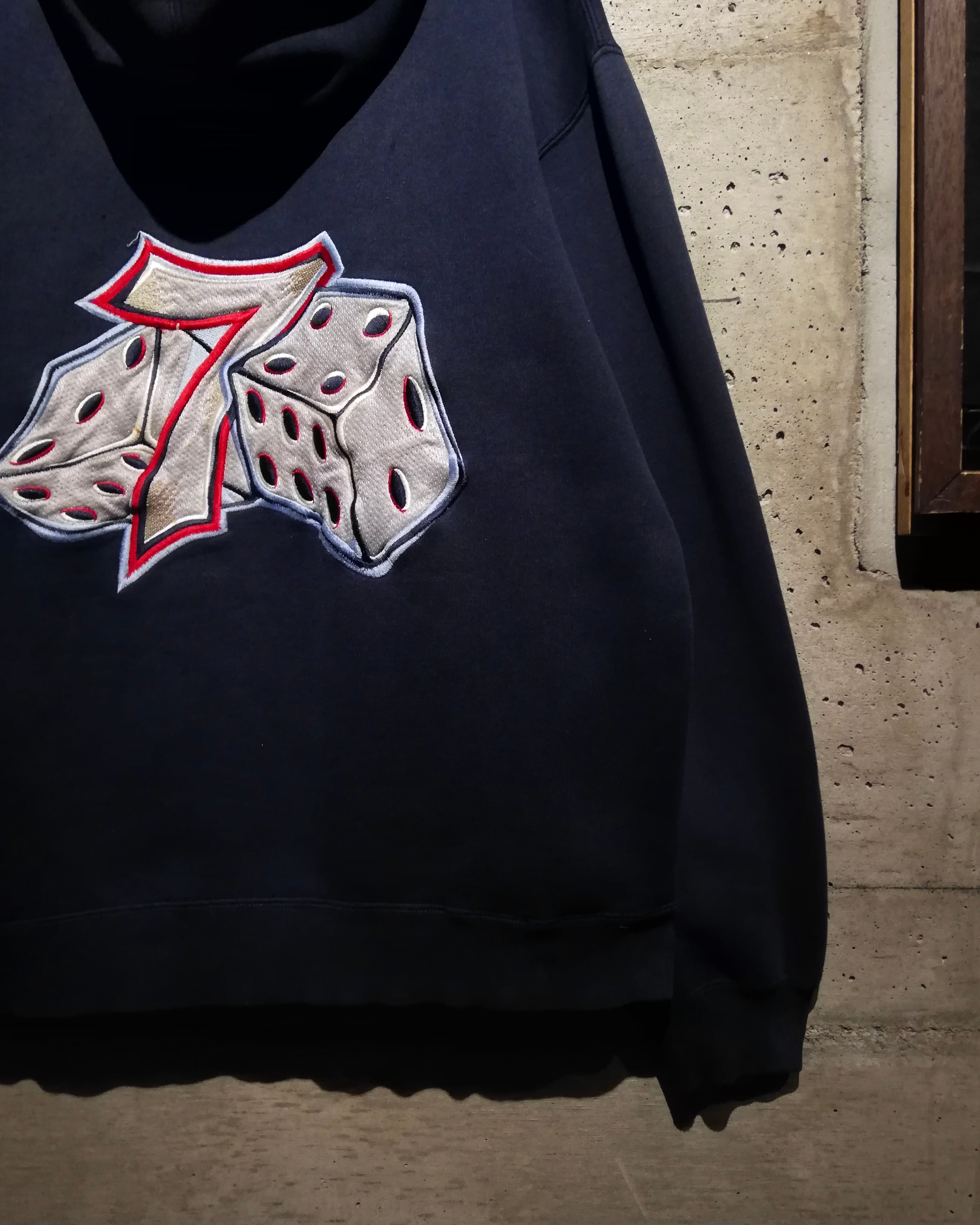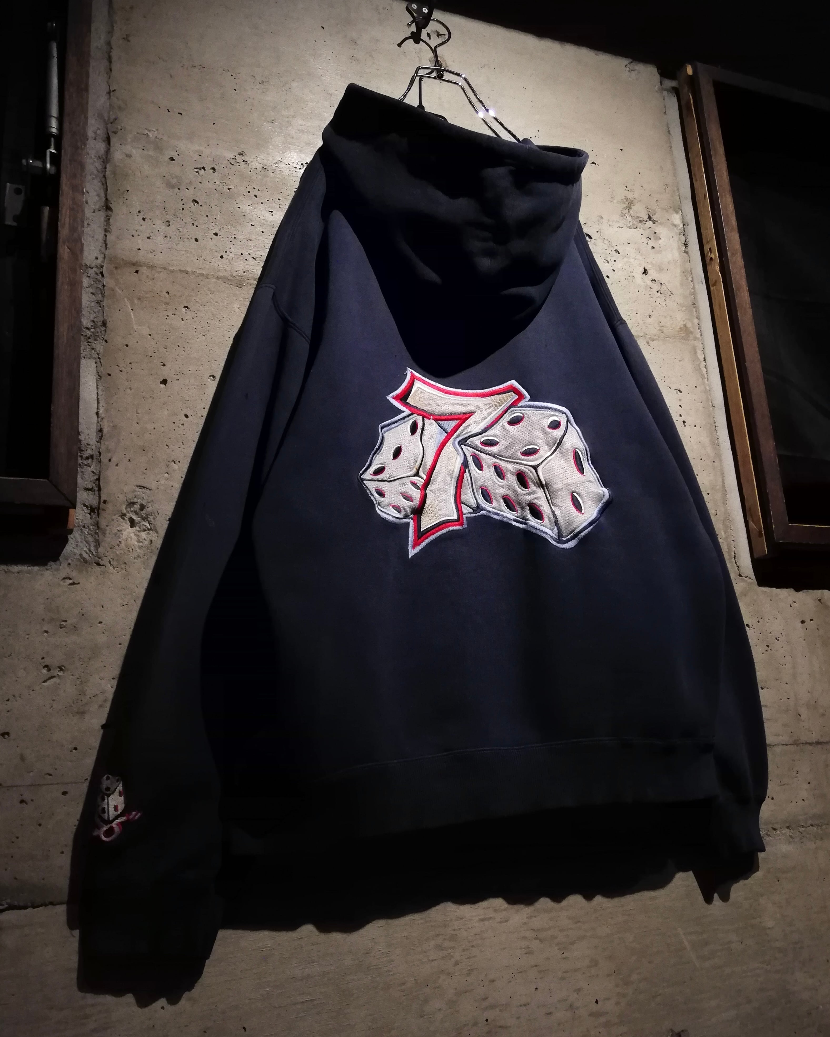 肉感のあるネイビーカラーのボディに、背面にダイスの刺繍を刻み込んだプルオーバーフーディー。