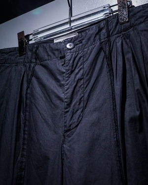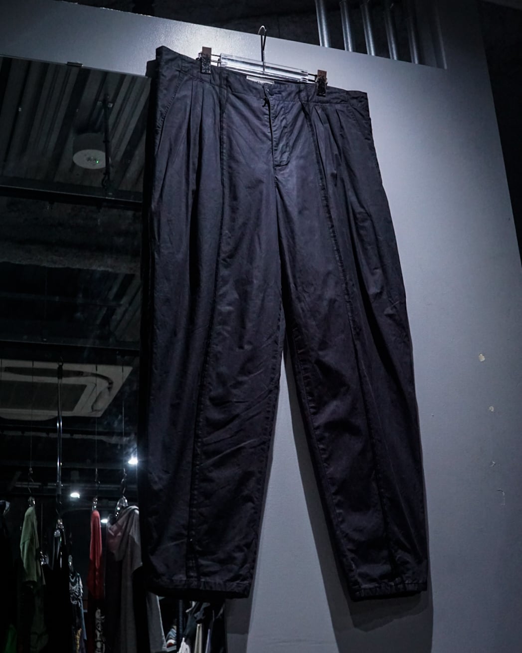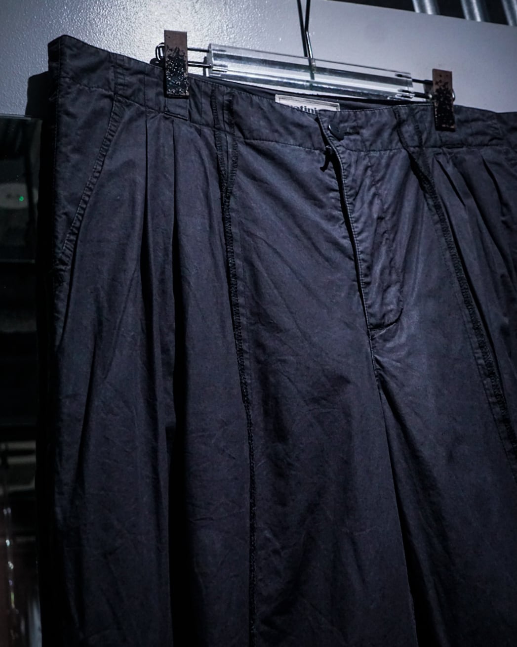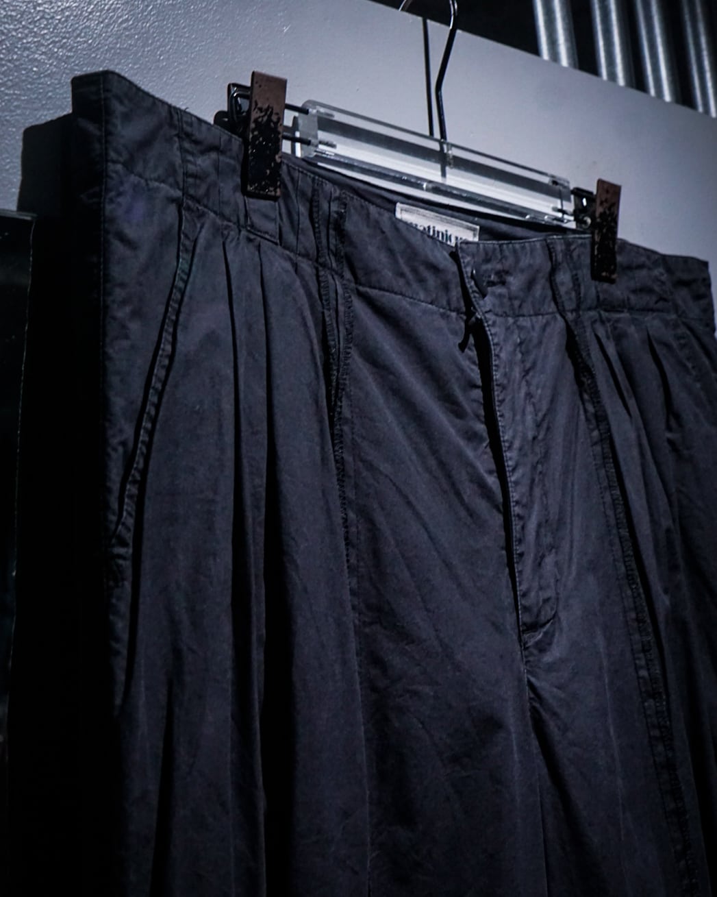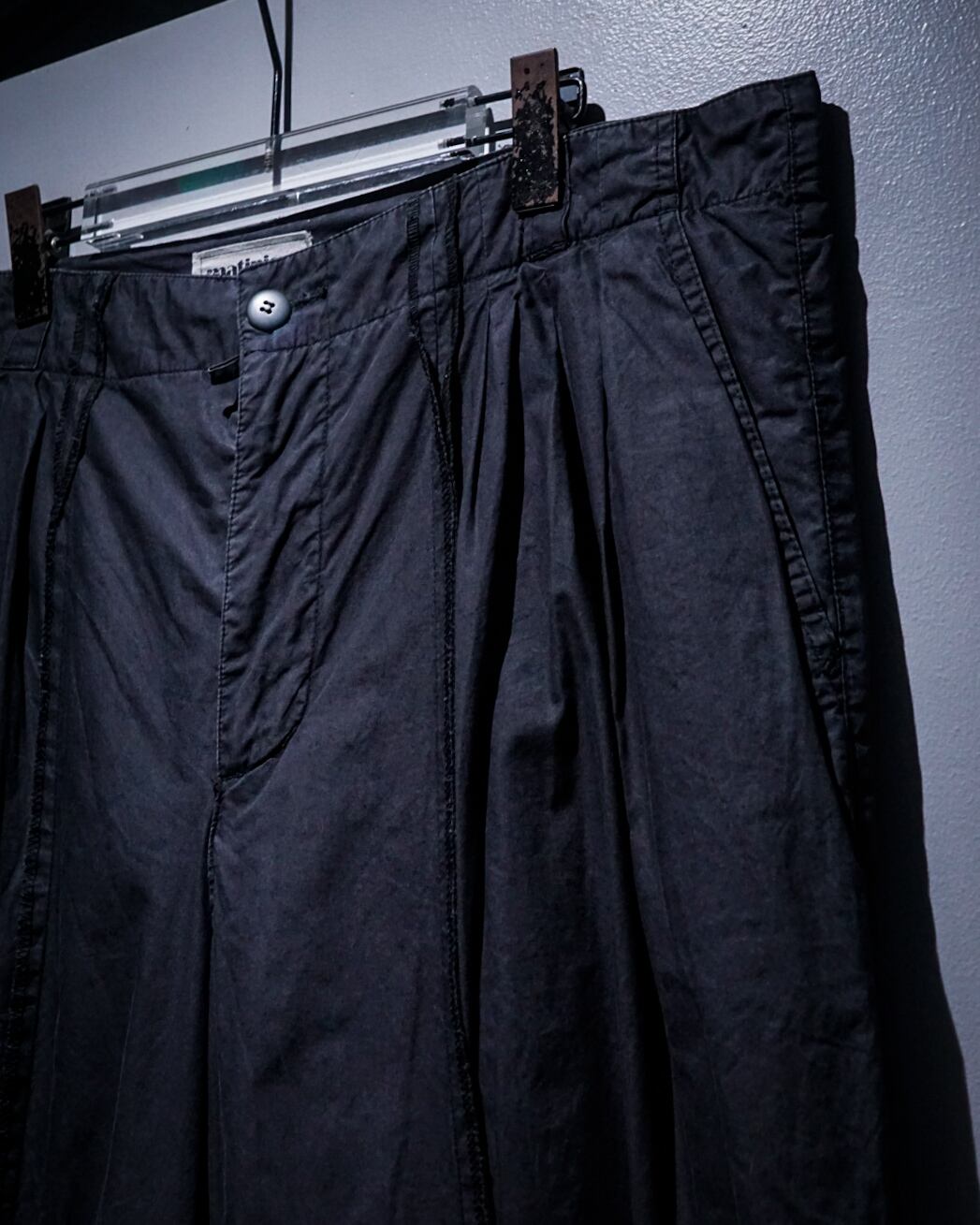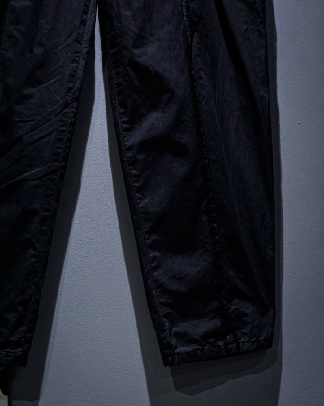タックの腰回りがワイドで、裾に向かって緩やかに細くなるテーパードシルエット。リラックス感のあるシルエットながらしっかりと決まります。