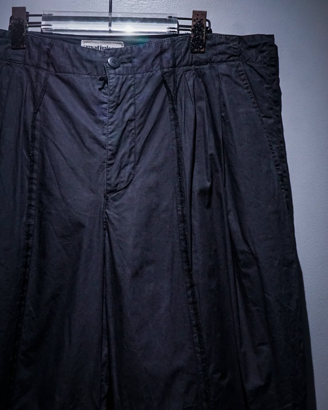 柔らかくもハリのあるナイロン素材を用いたボディに、切り替えのデザインを施したパンツ。