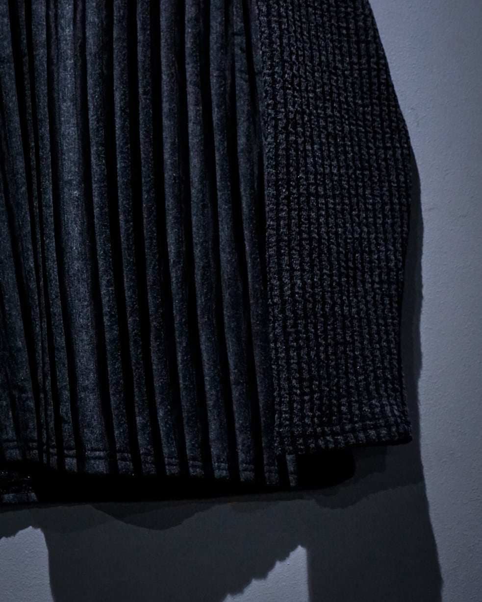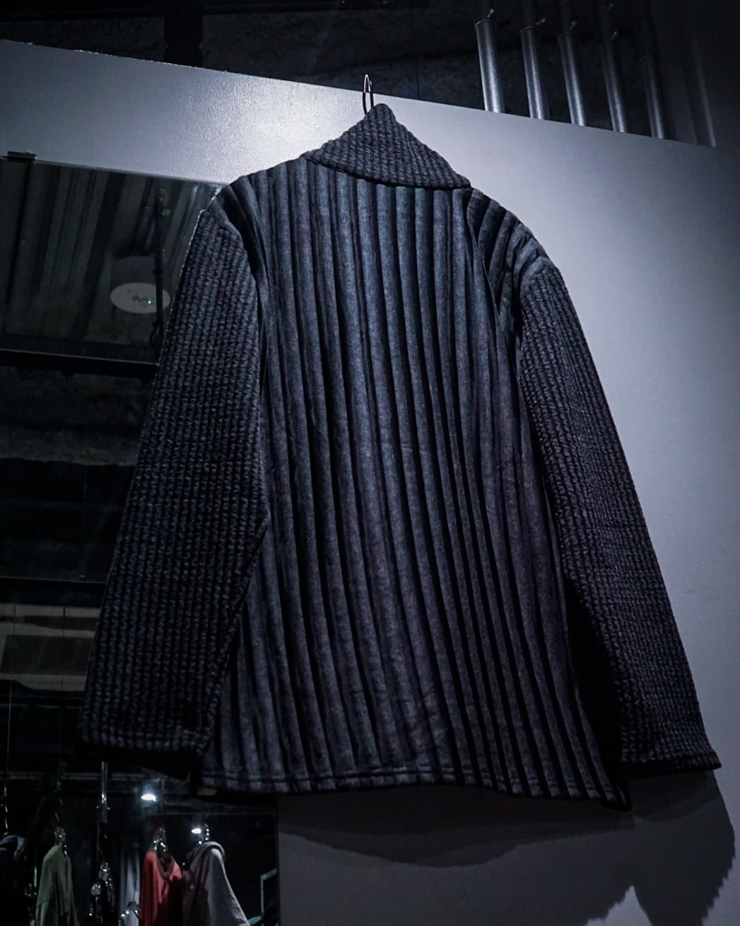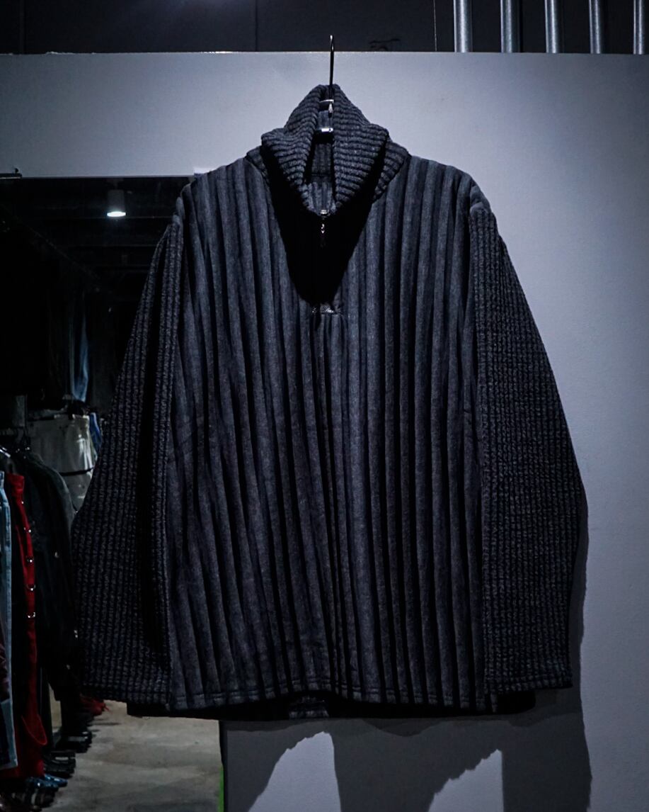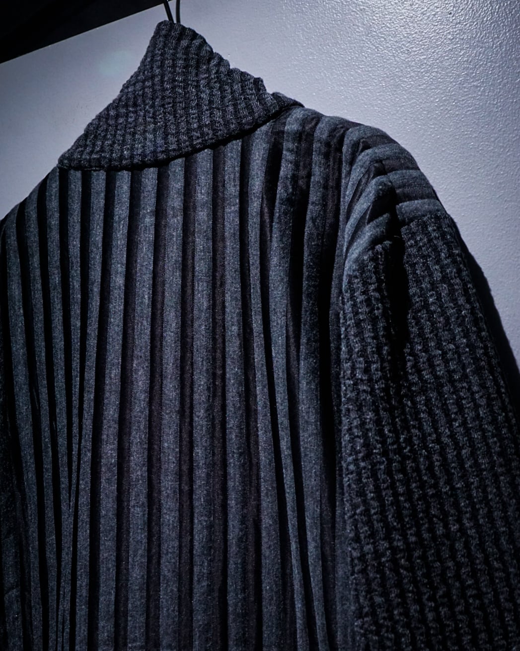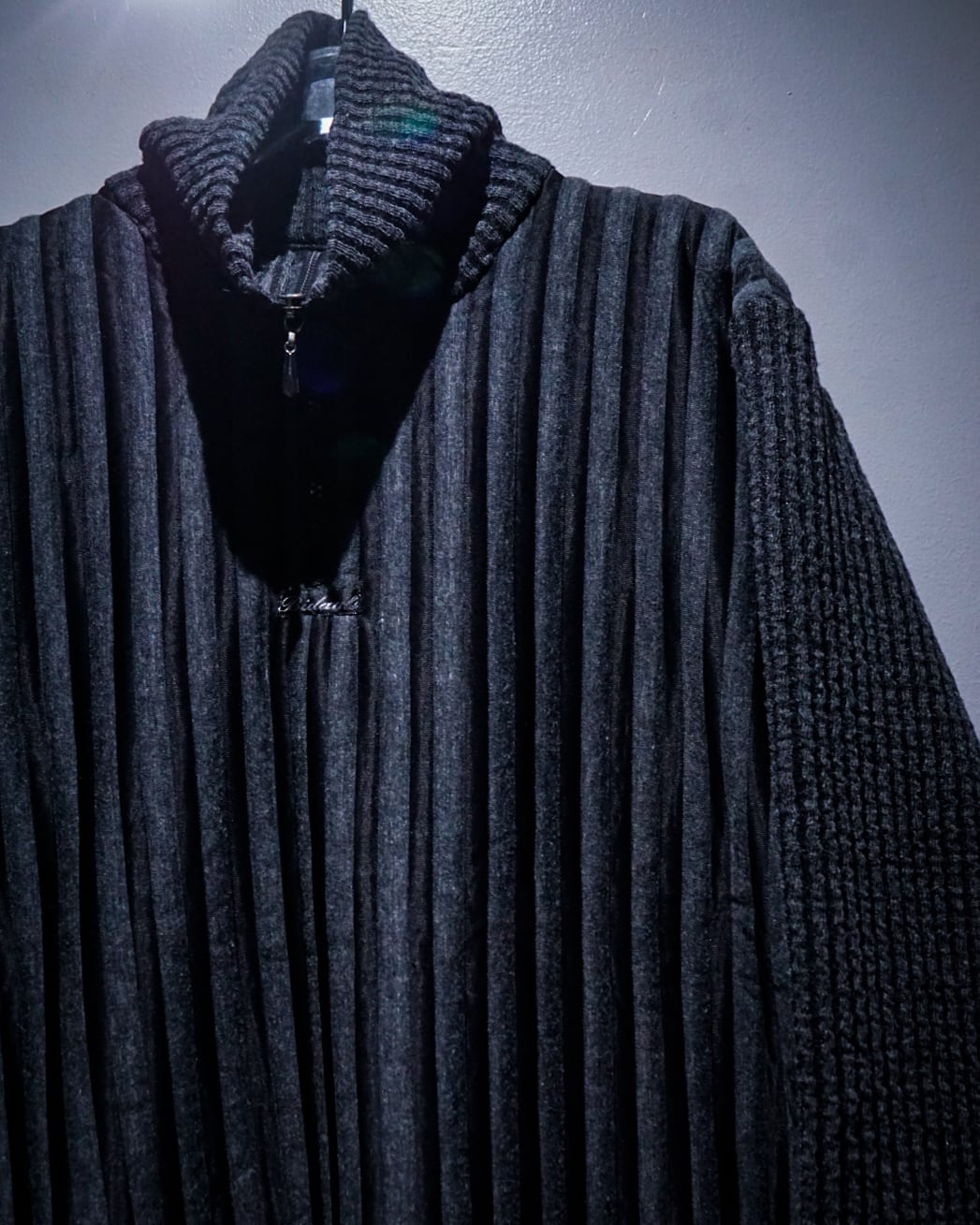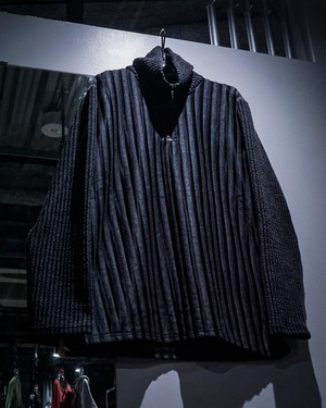 光沢のあるブラックとグレーのストライプデザインを前後身頃に、アームにはブラックのニットを切り替えたスペシャルなニットジャケット。