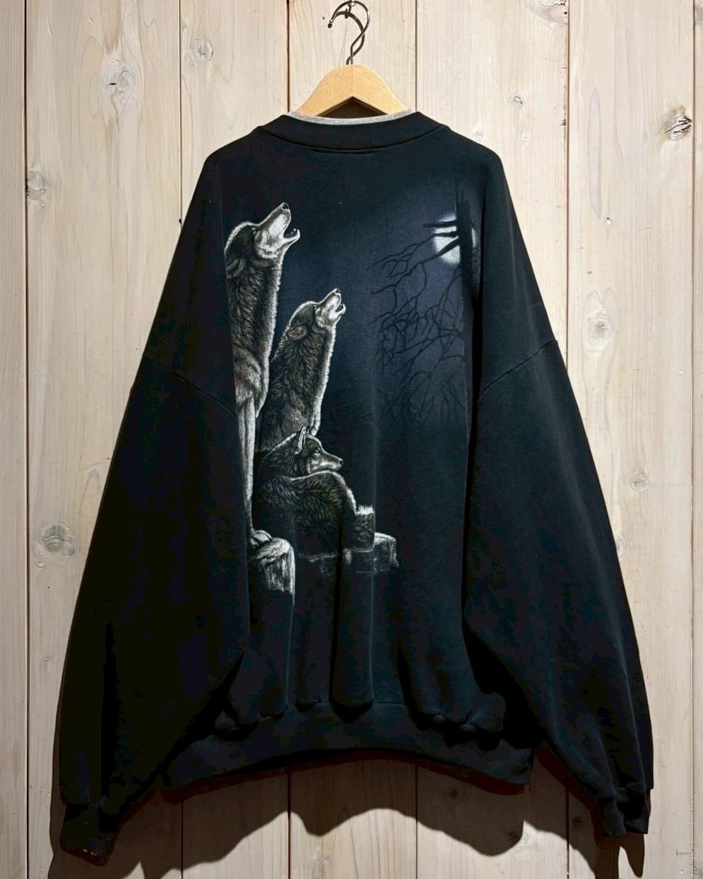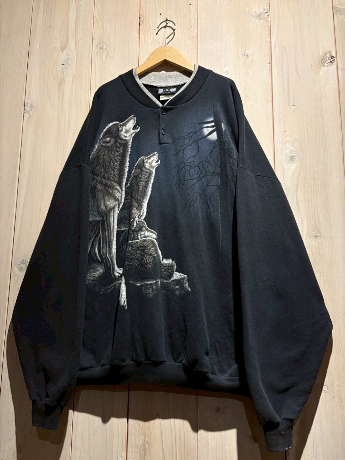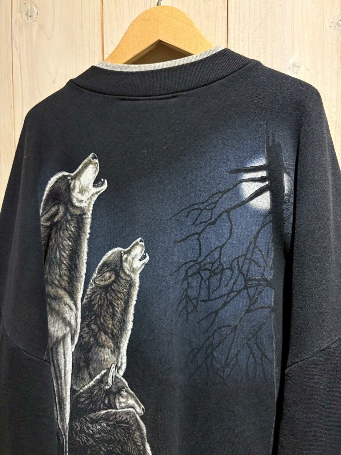 黒をベースに、月に向かって遠吠えするオオカミを表現したスウェット。