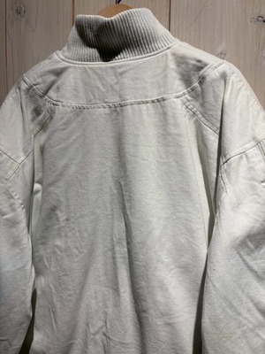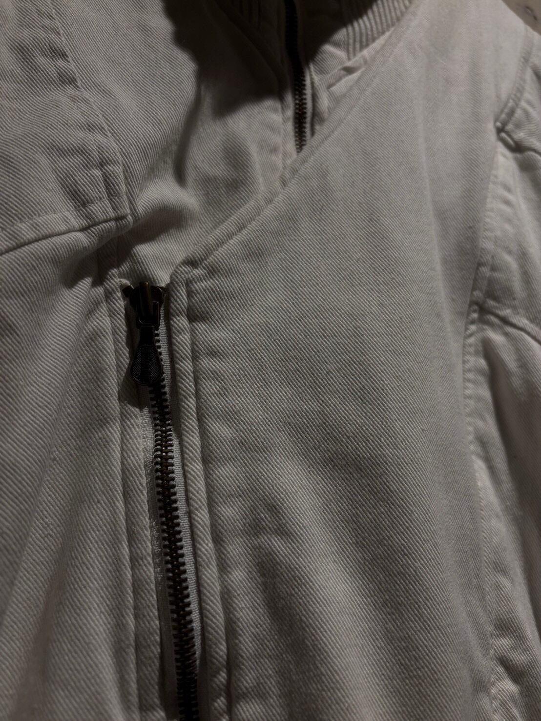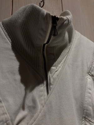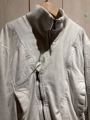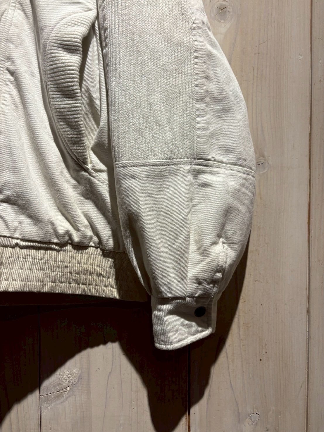 コットンツイルにニットを切り替えたボディに、フロントにダブルライダース風のジップギミックを載せたジャケット。