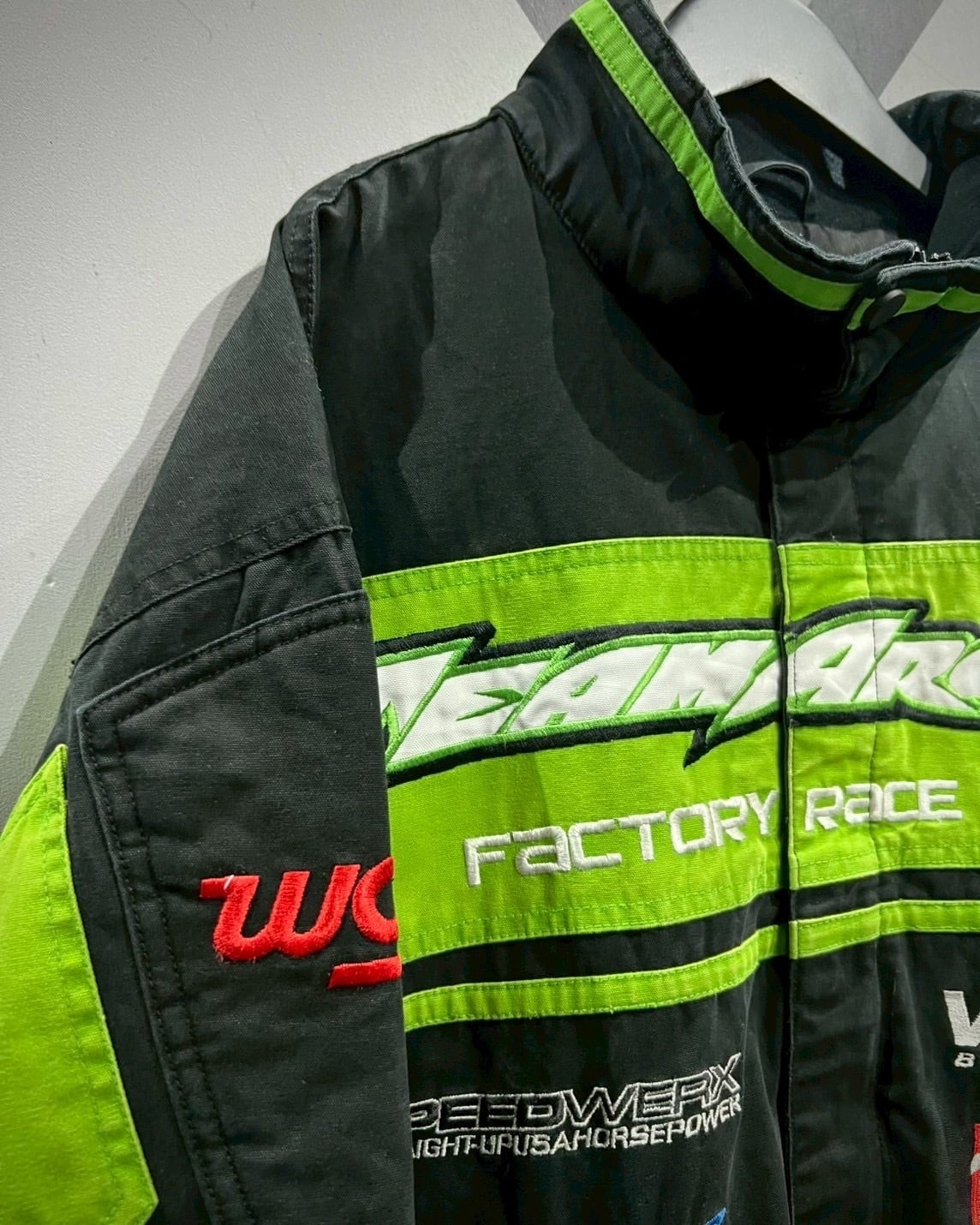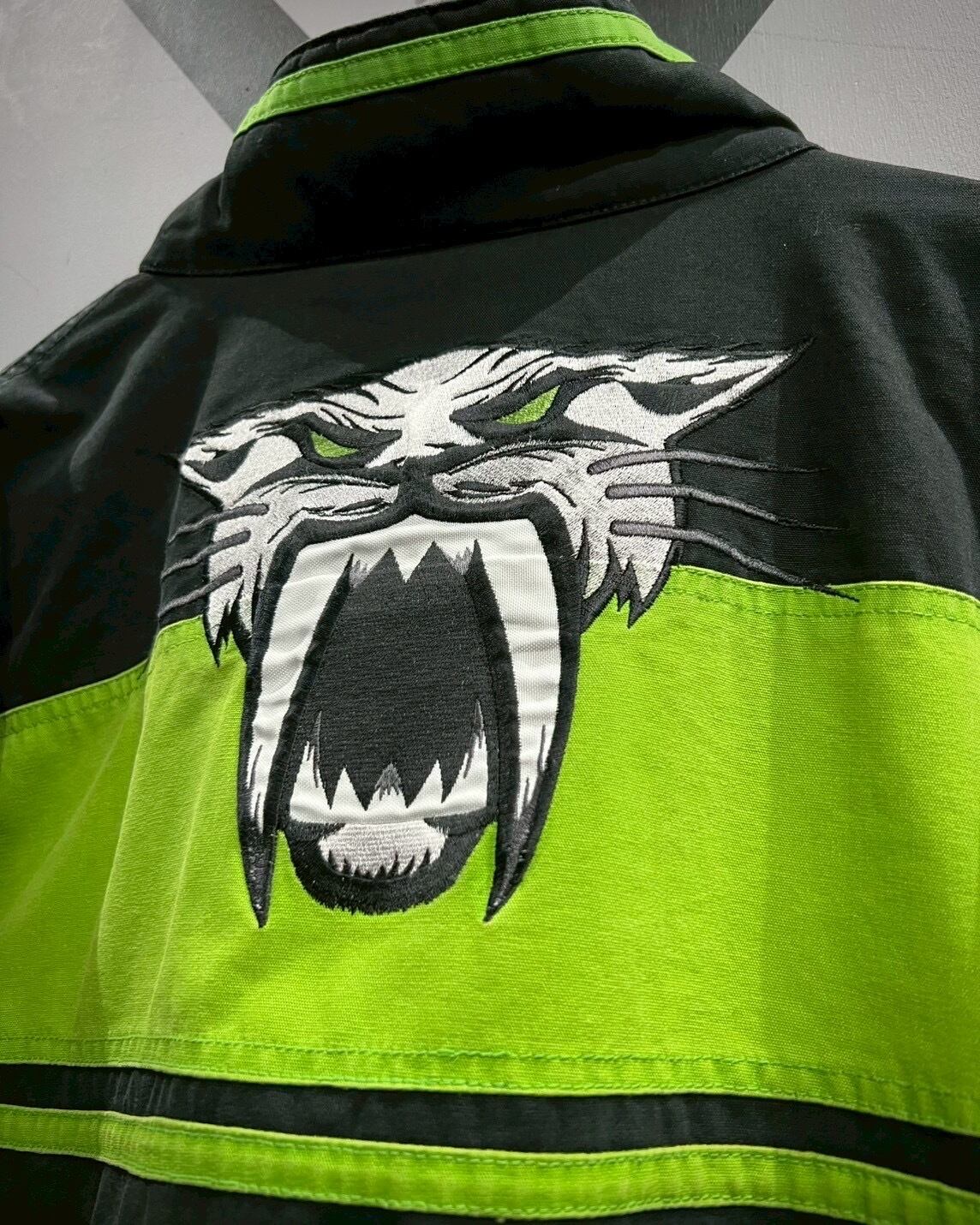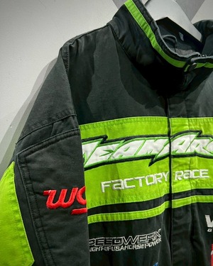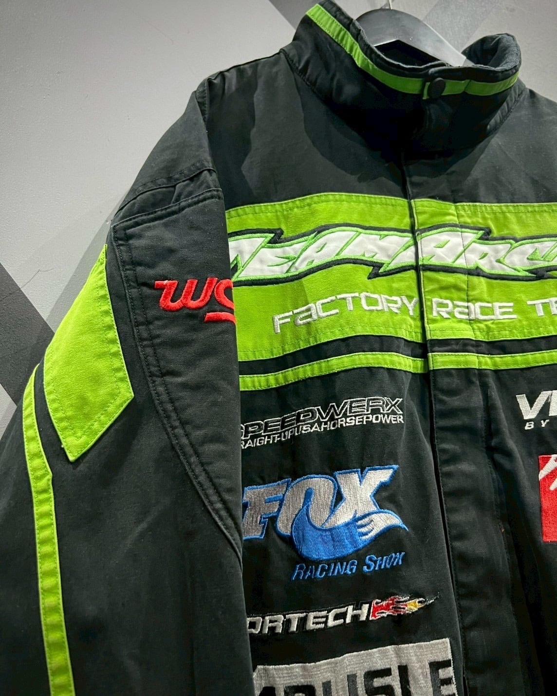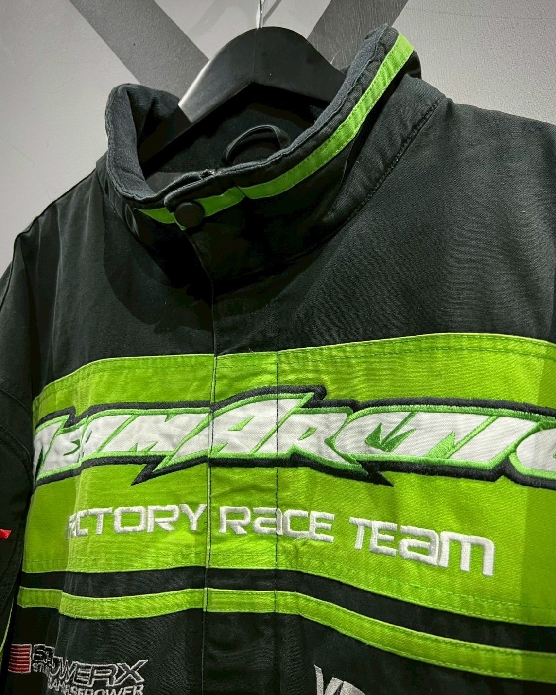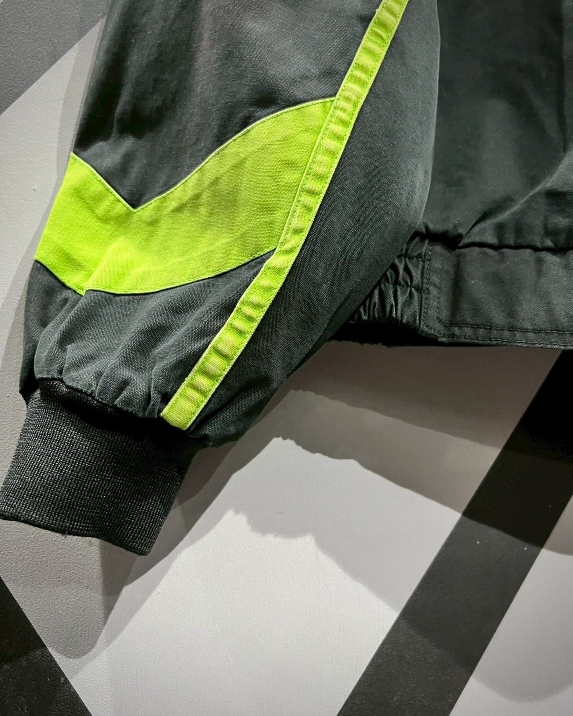 フロントには企業ロゴ、背面にはブランドロゴ、アームにも刺繍が刻まれており、レーシングならではのデザインに加えて黒×ネオングリーンの切り替えも非常に洒落てます。