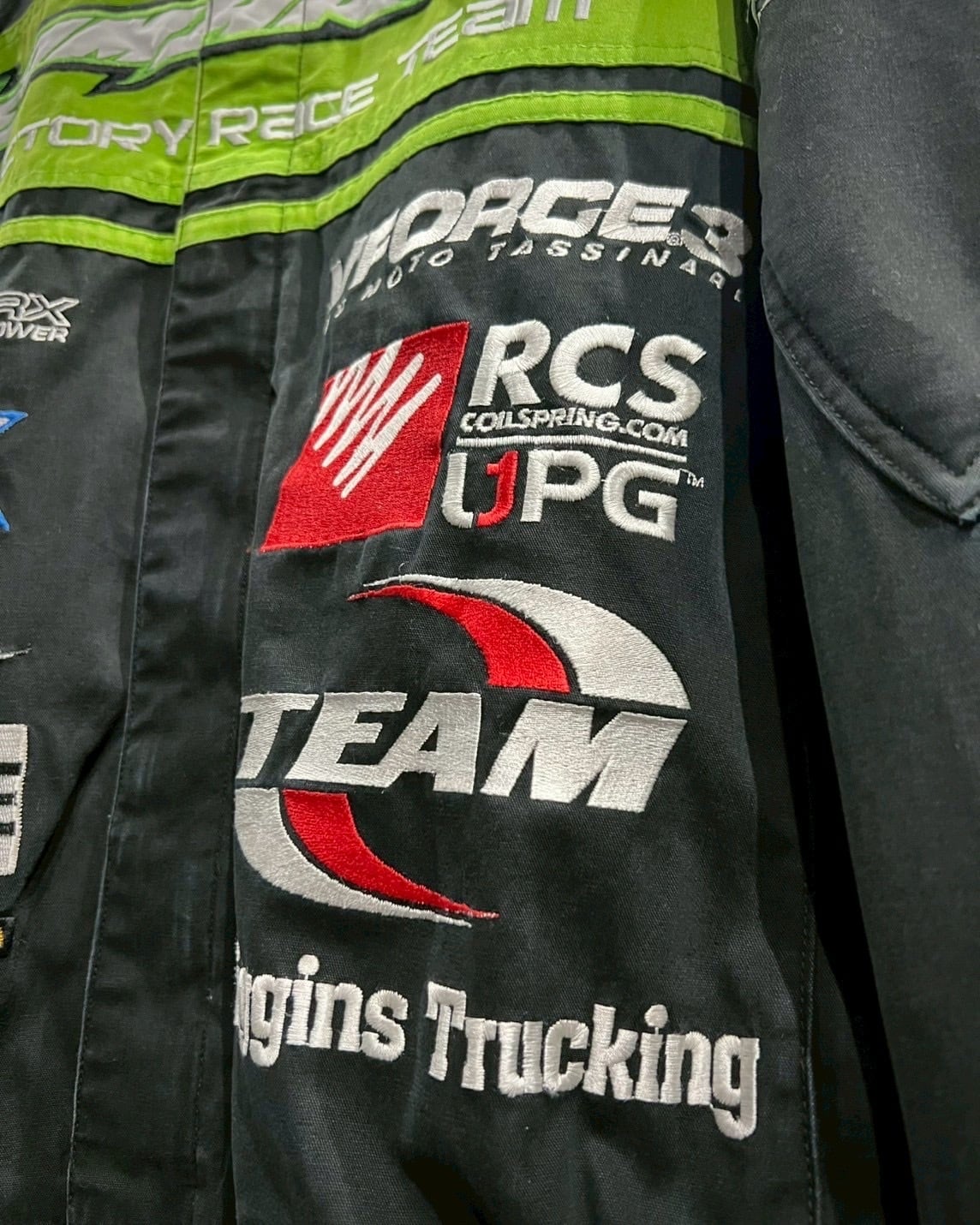 タフなブラックのコットンをベースに、様々な協賛企業のロゴを刺繍で刻んだ1着。