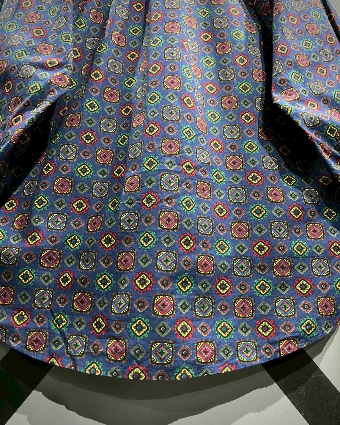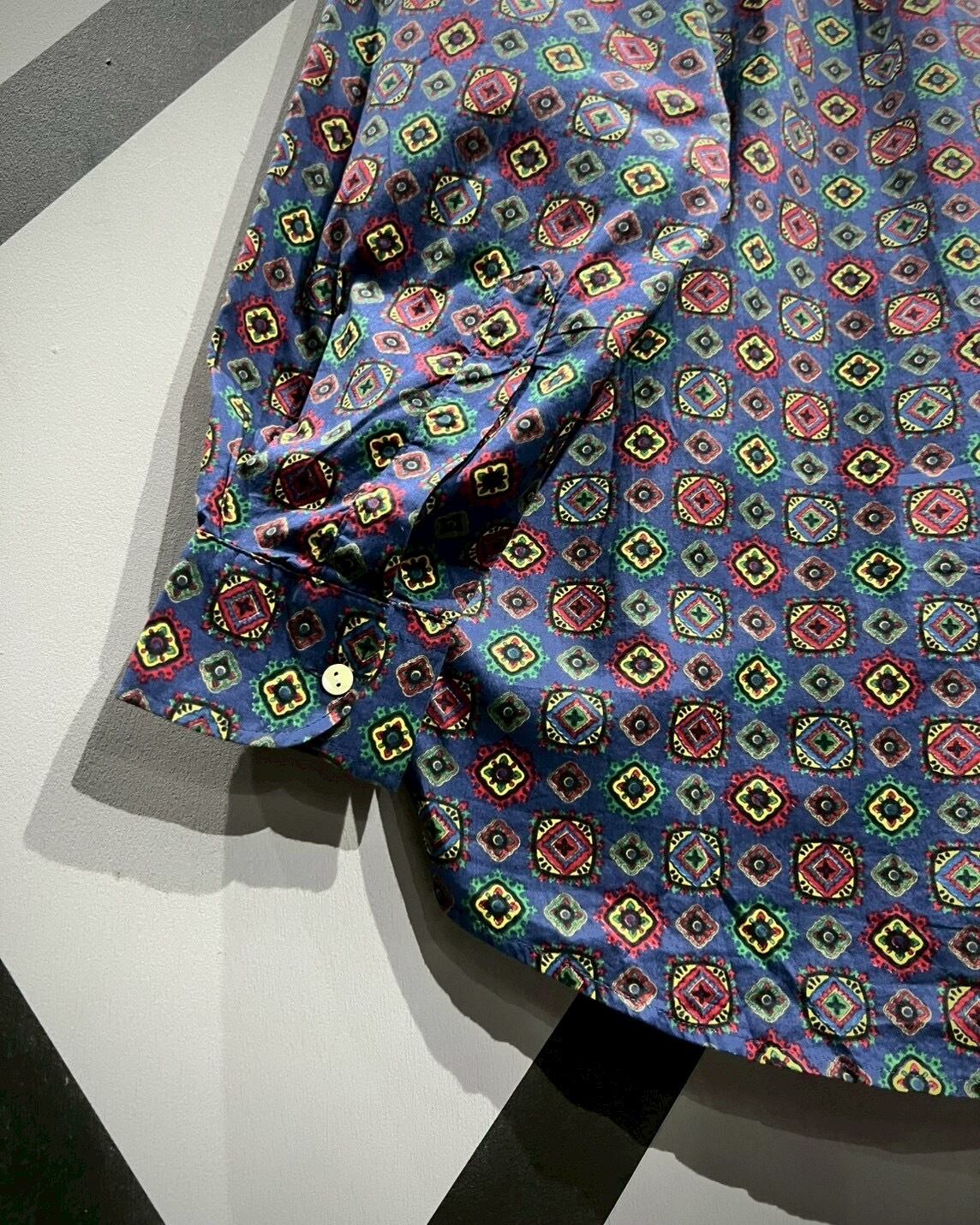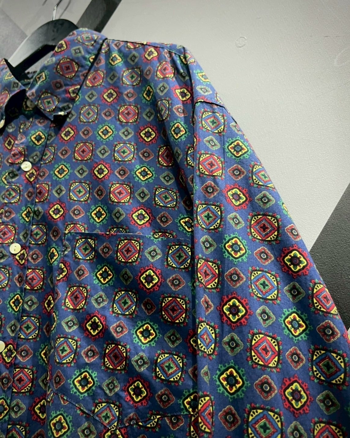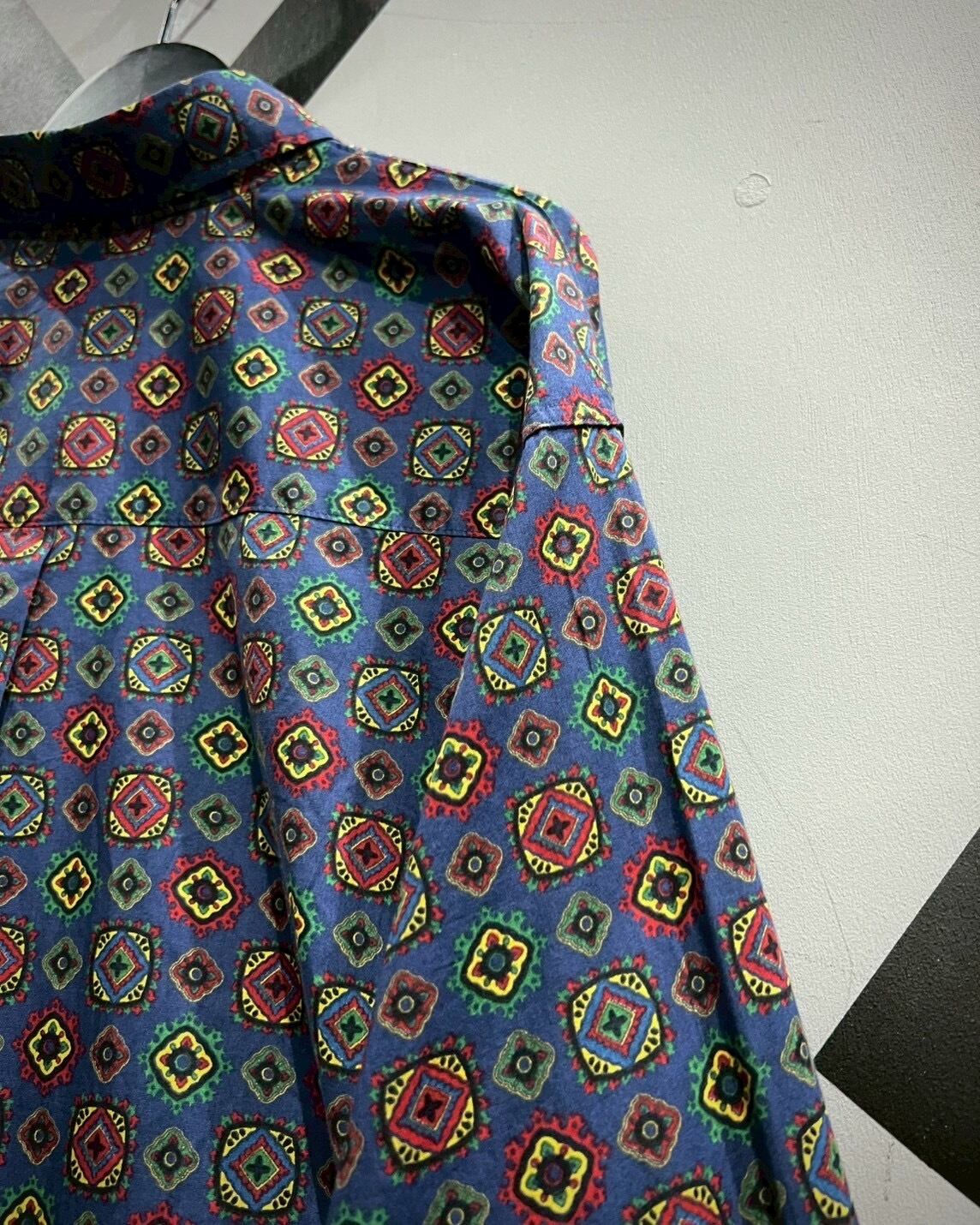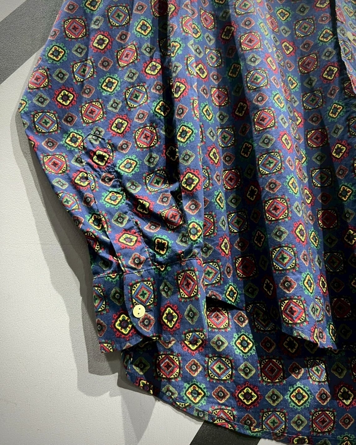 青のボディをベースに、エスニックな雰囲気漂うデザインを載せた長袖シャツ。