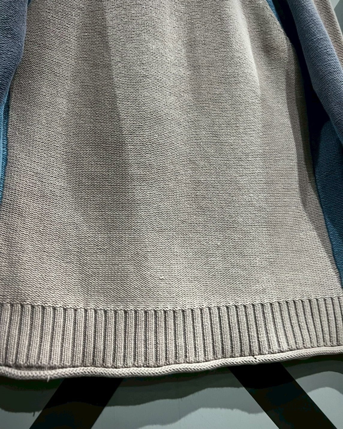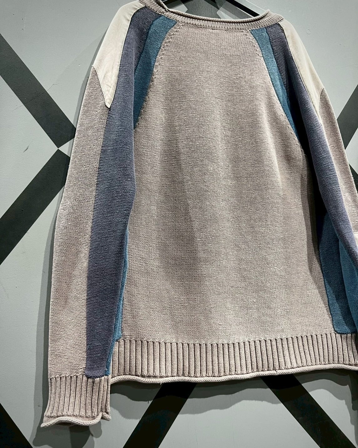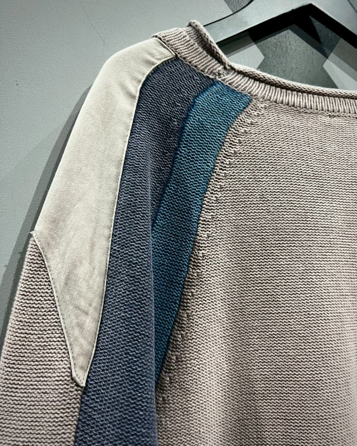 こちらはアイボリーのボディに、ラグランスリーブに沿ってネイビーとブルーを切り替え。首元、裾、袖口にはロールを効かせることで、洗練されたデザインの中に程良い抜け感を演出しています。
