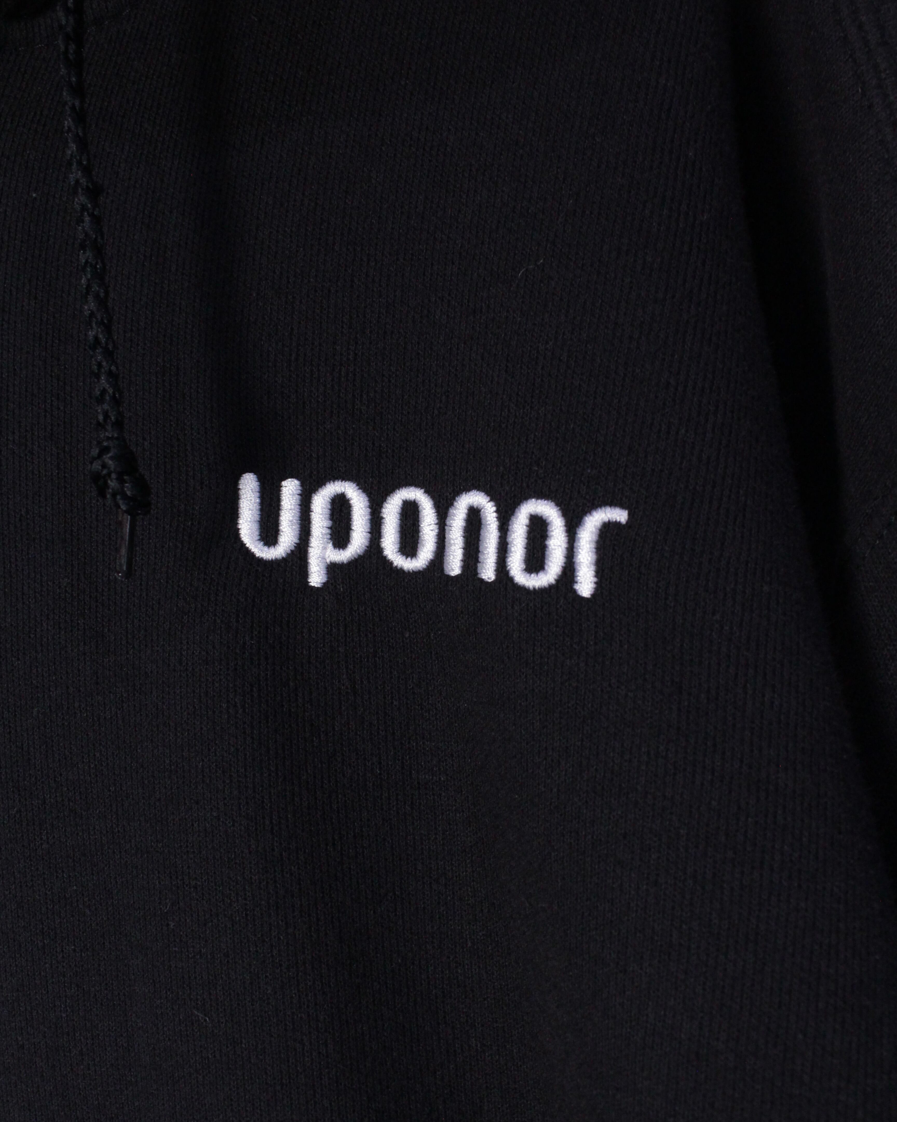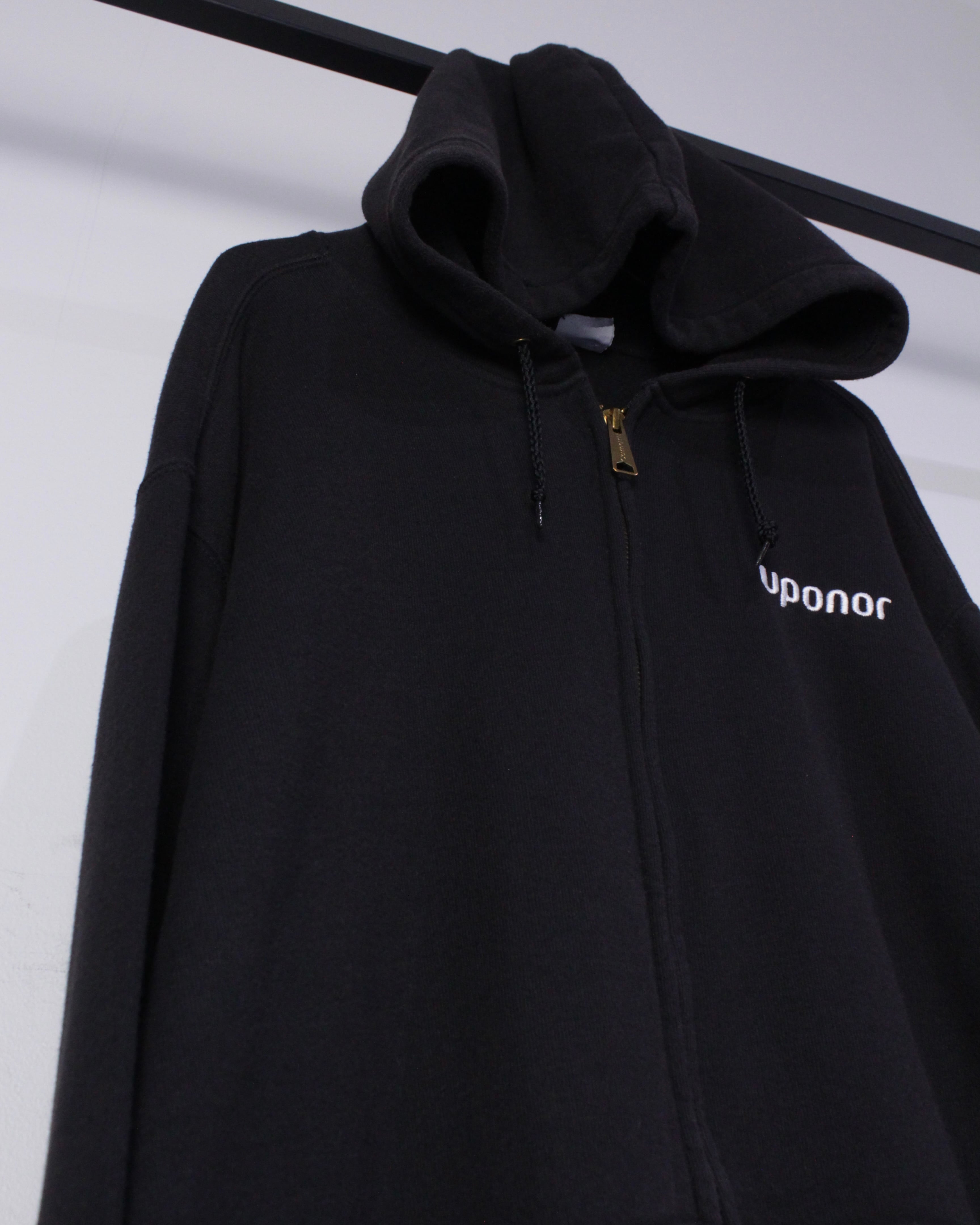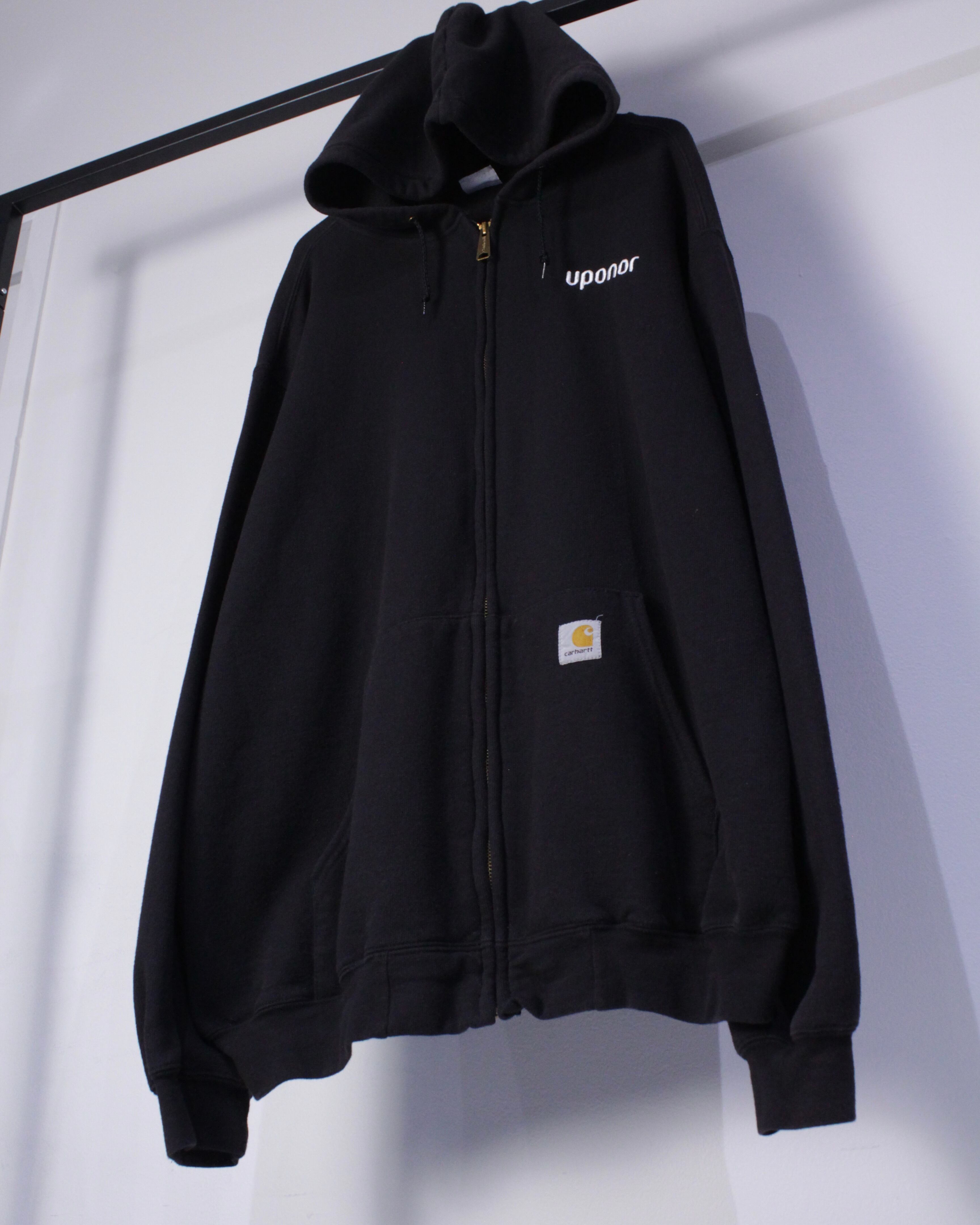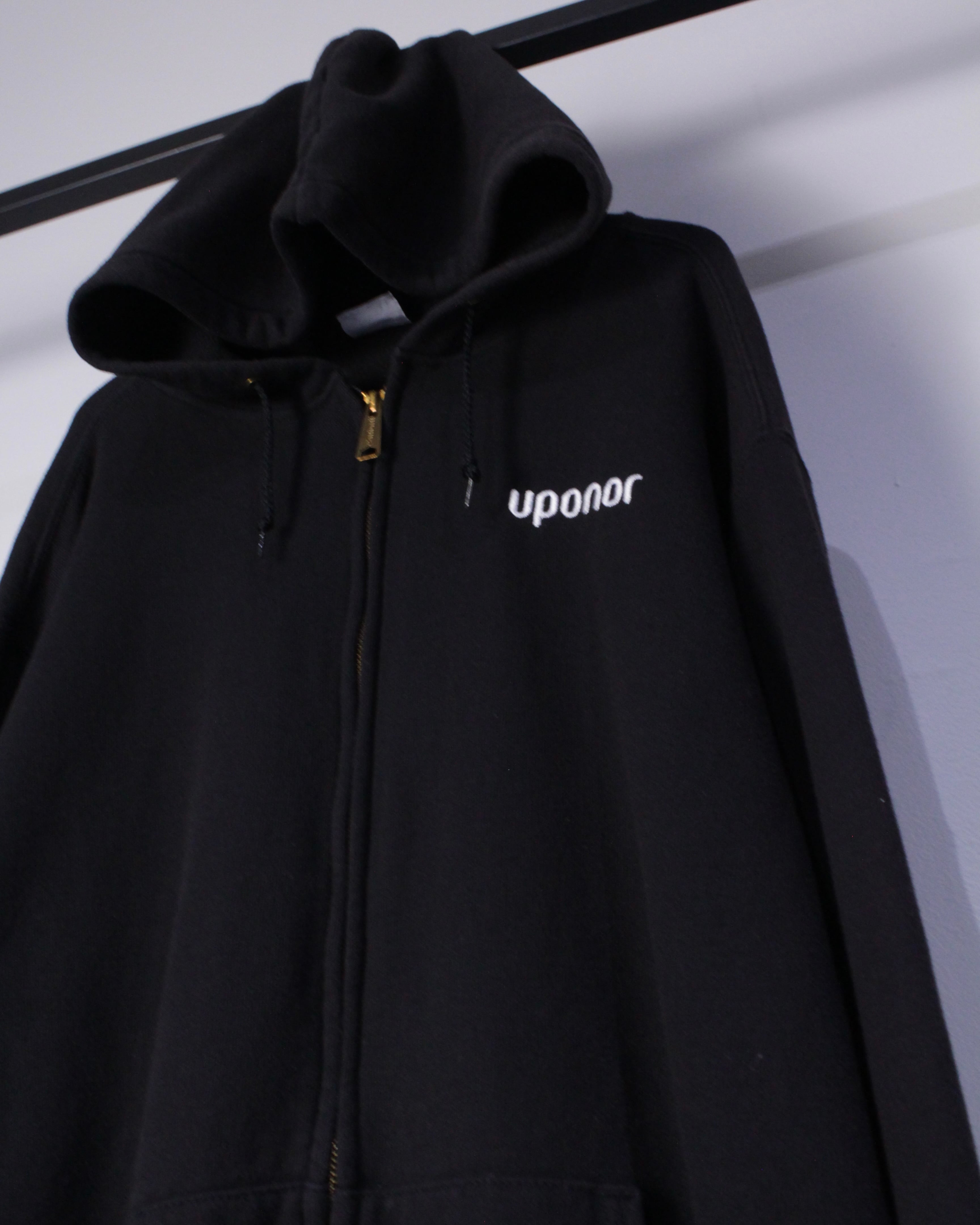 程よく肉厚で少しフェードしたブラックのスウェット生地を用いたジップアップフーディ。
