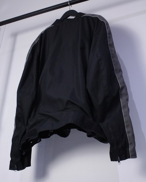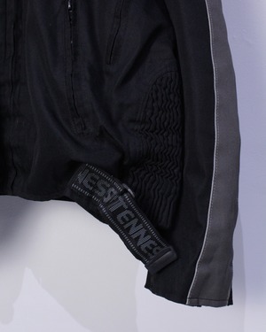 高密度に織られた、タフな素材を用いてシングルのライダース型に落とし込んだ、テクニカルな表情を見せるデザインに仕上げられたシングルライダースジャケット。
