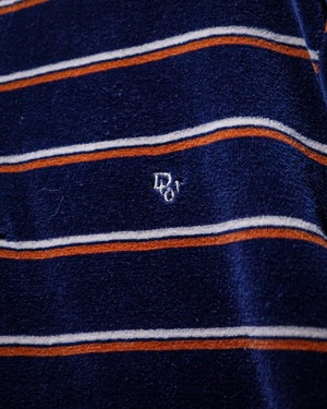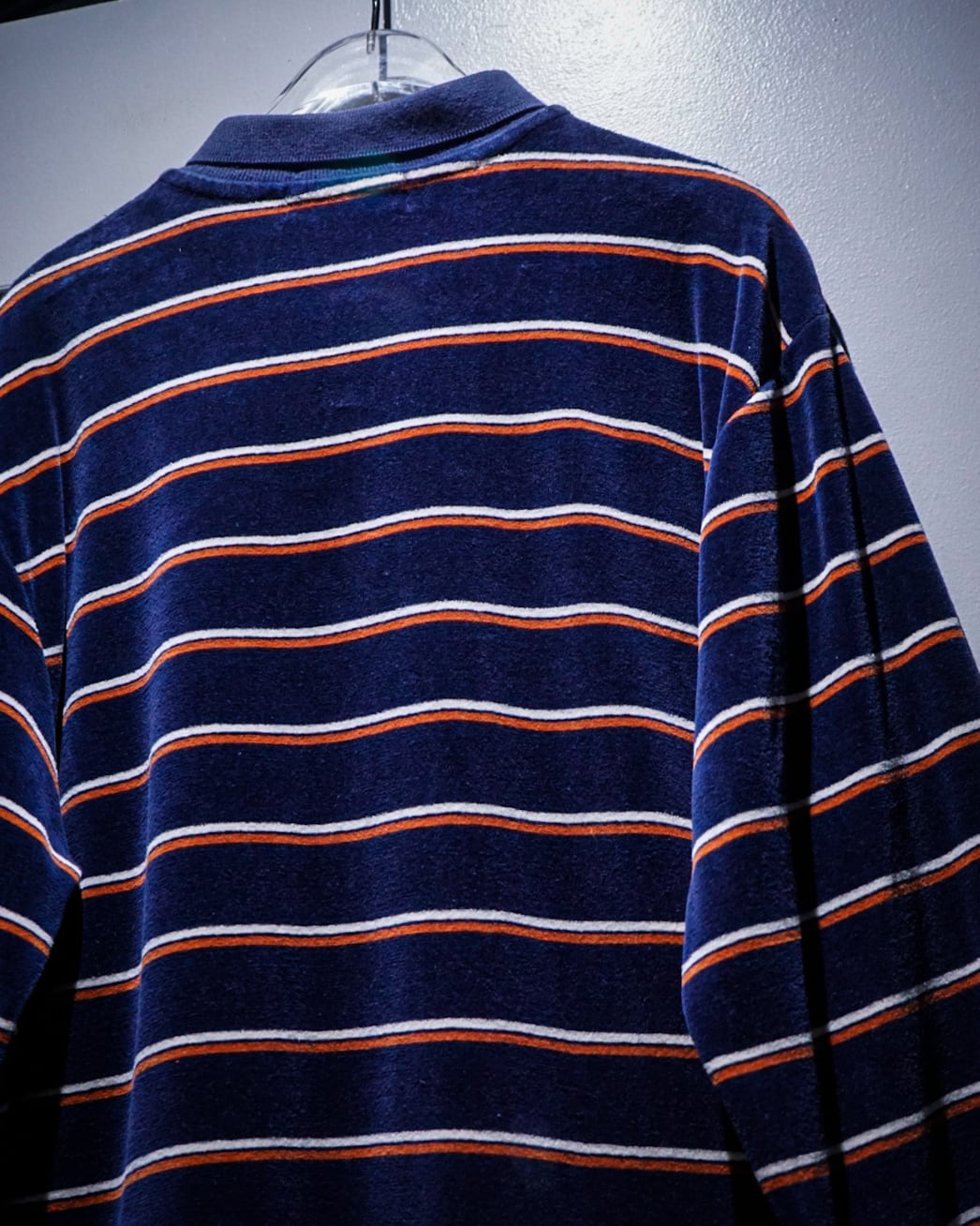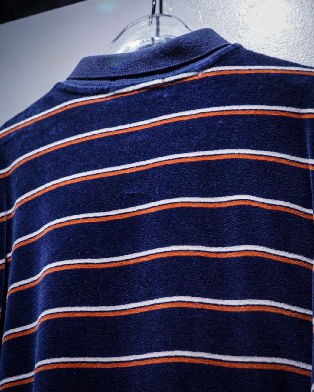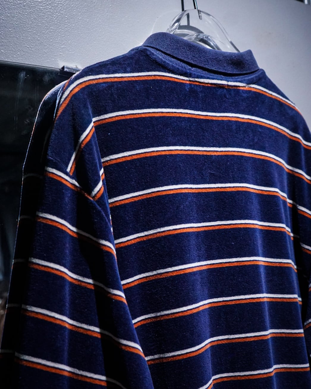 ブランドかつ、ベロアの異素材を用いたポロシャツと稀少な個体で、ボーダーの配色バランスも抜群。左胸のロゴ刺繍がワンポイントとしてアクセントになっています。