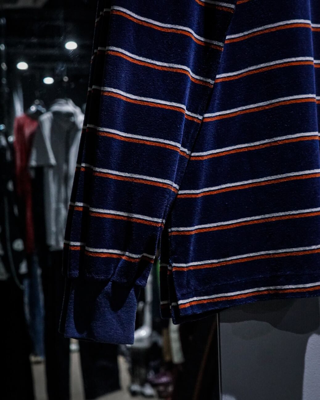 ネイビーのボディに、白×えんじでボーダーを載せたベロアのポロシャツ。