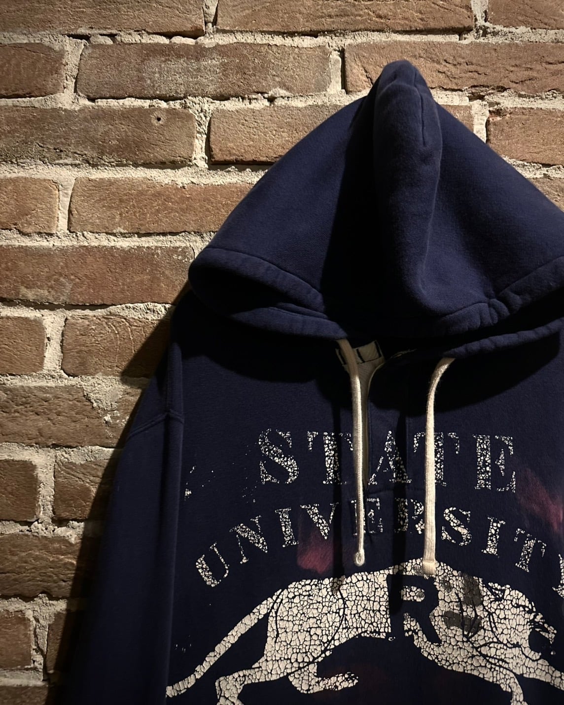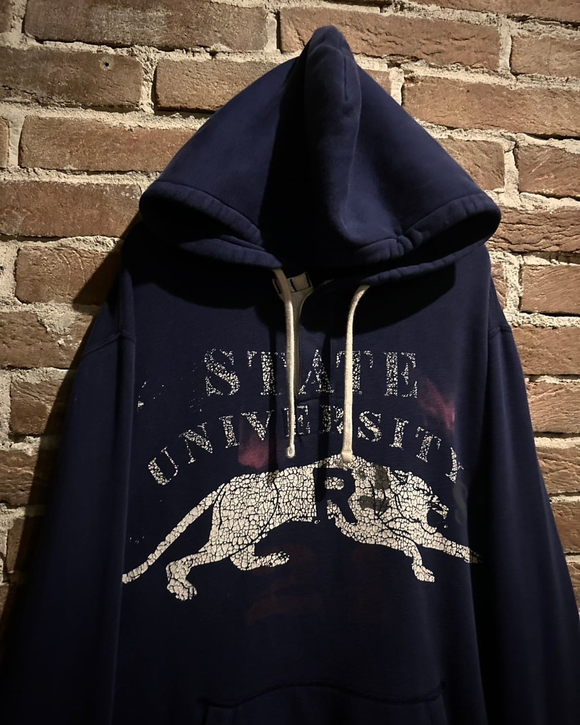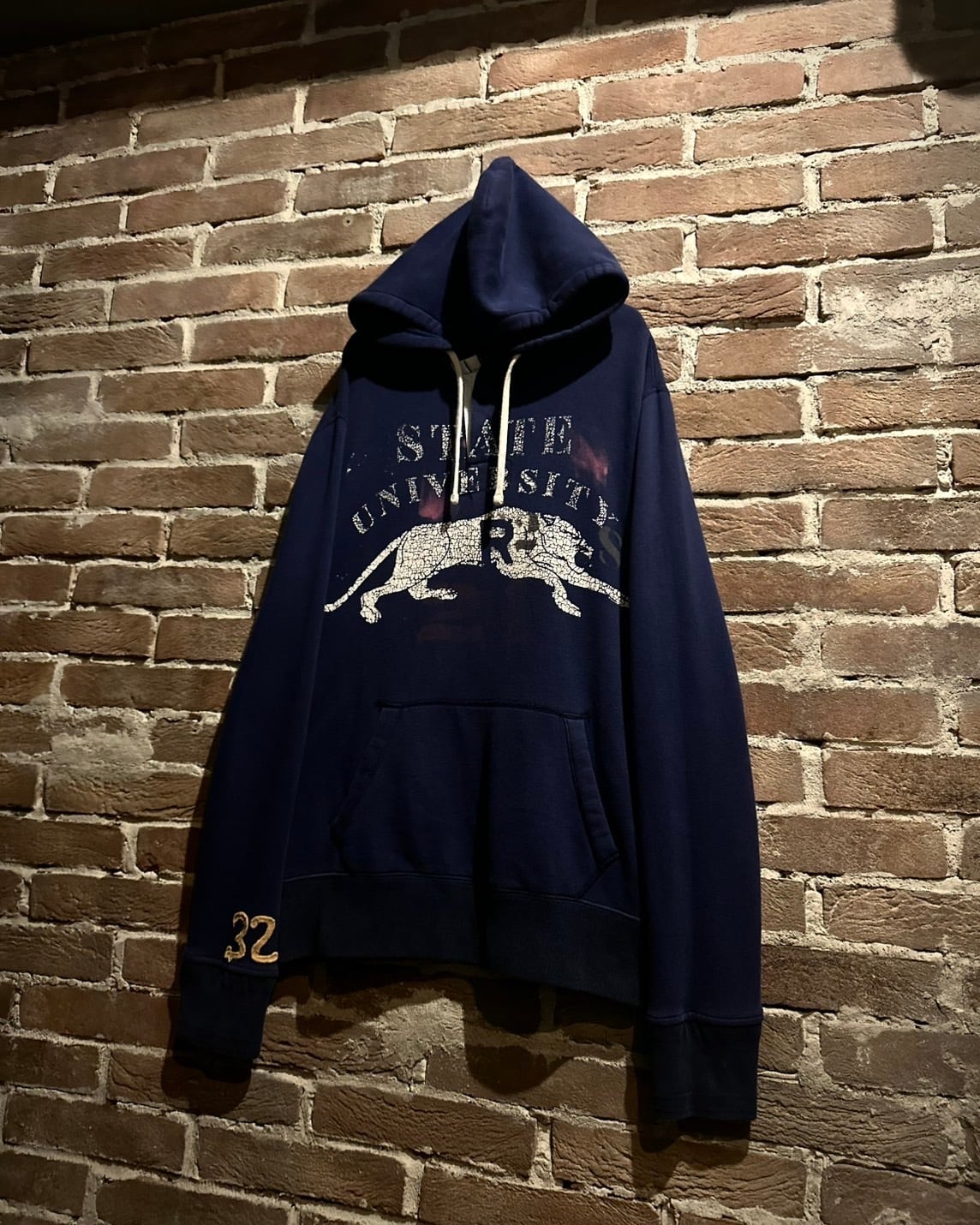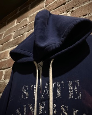 ネイビーのボディに、虎やカレッジ風のプリントをON。右袖にはナンバリングのパッチとデザインのノリが良いフーディ。