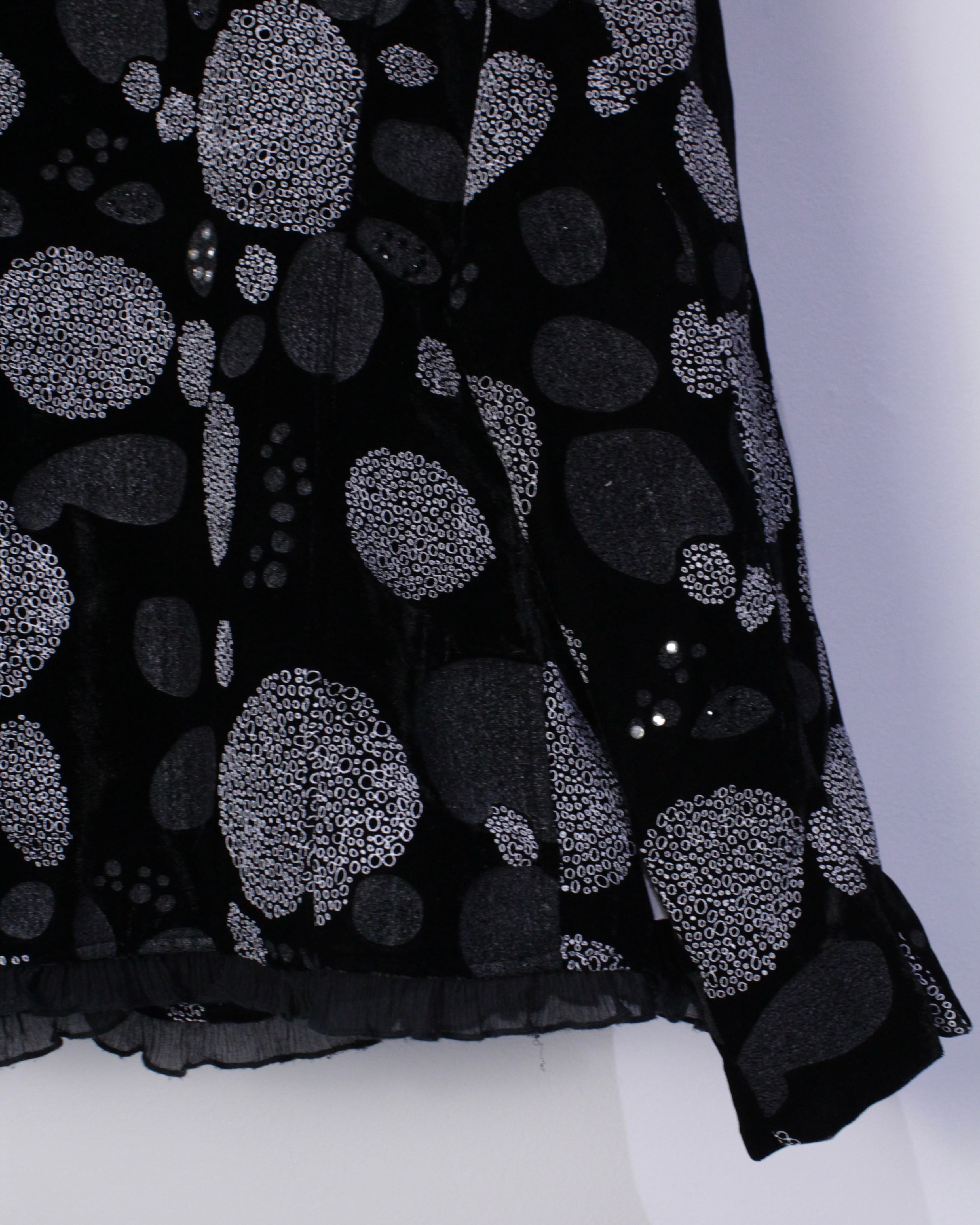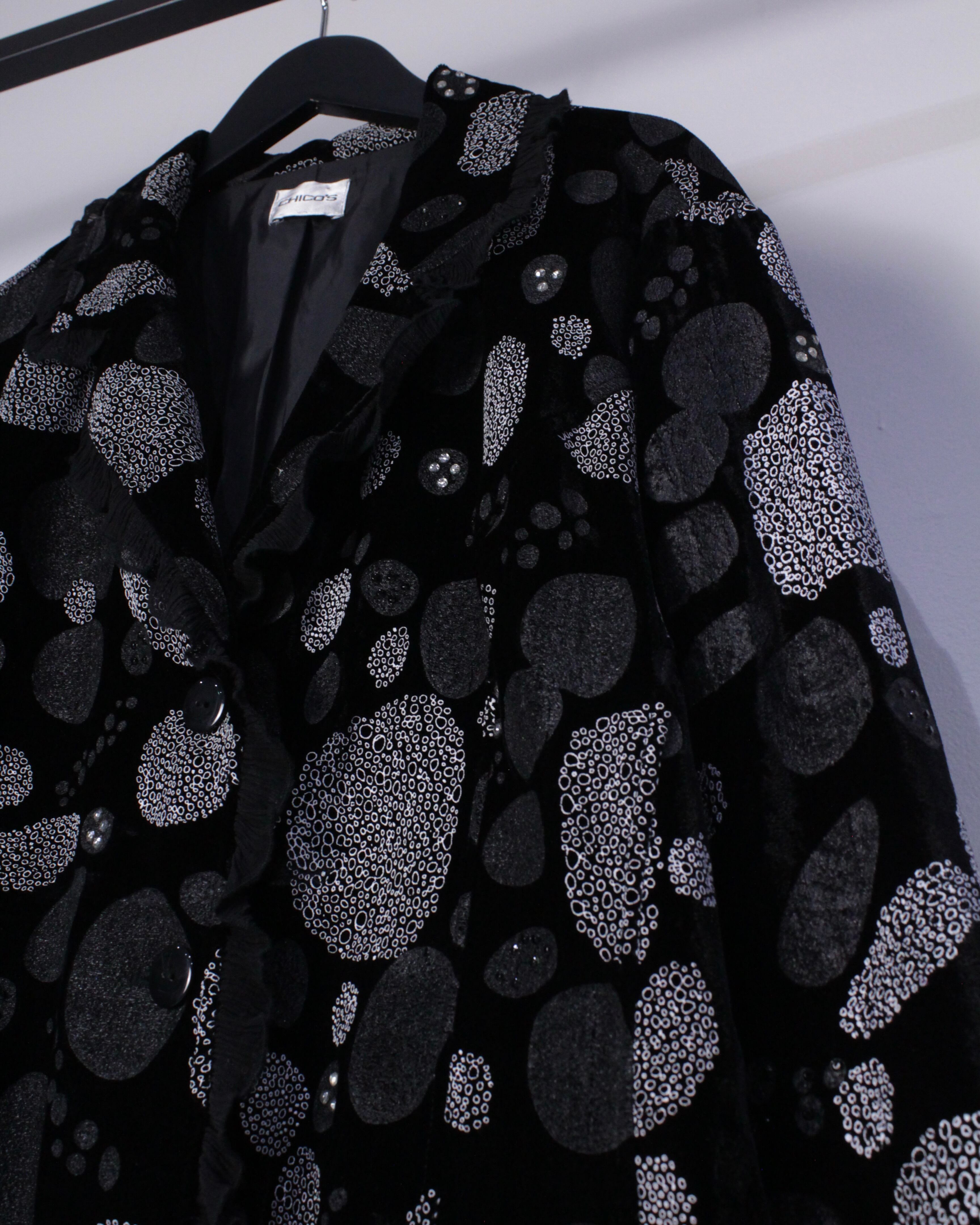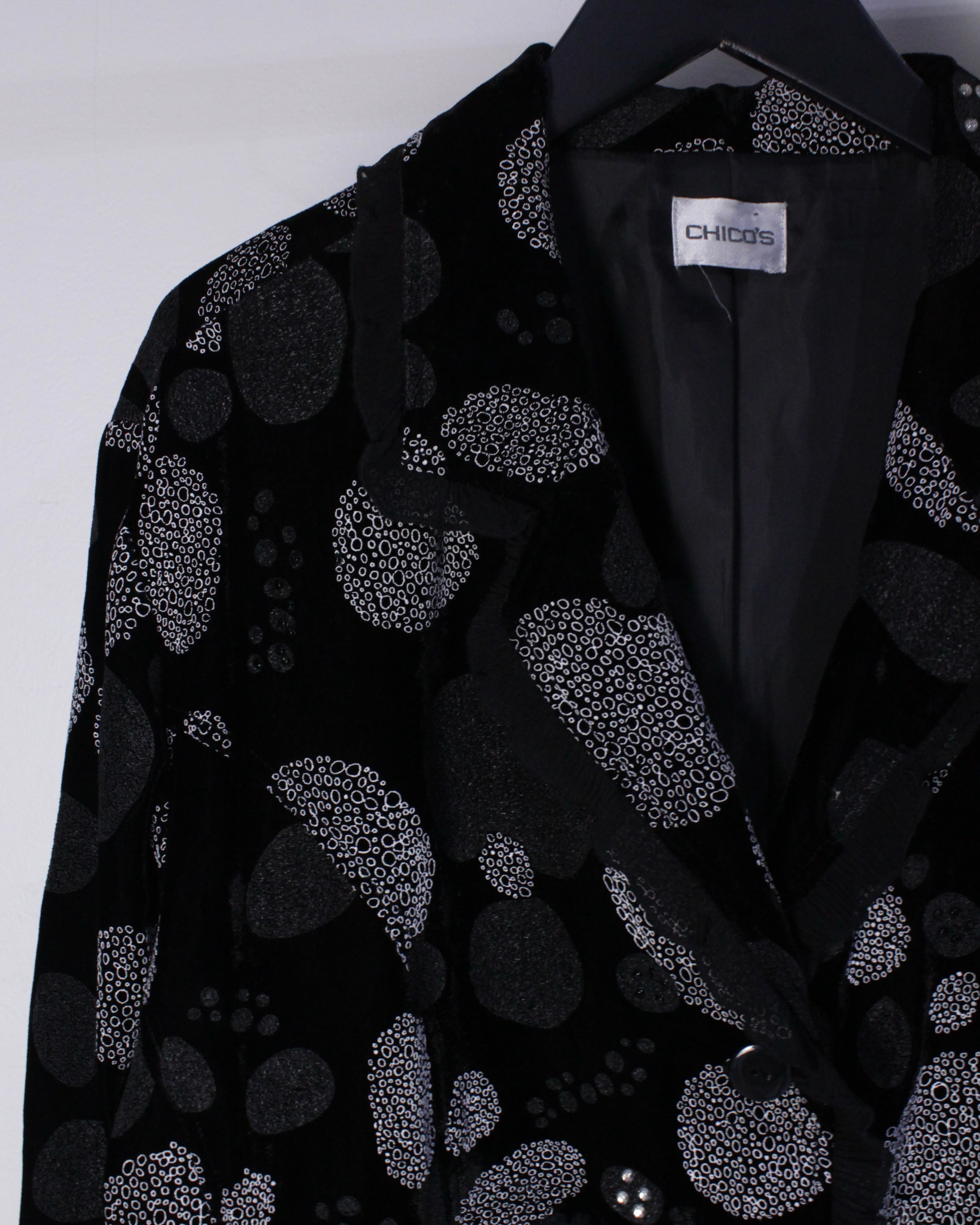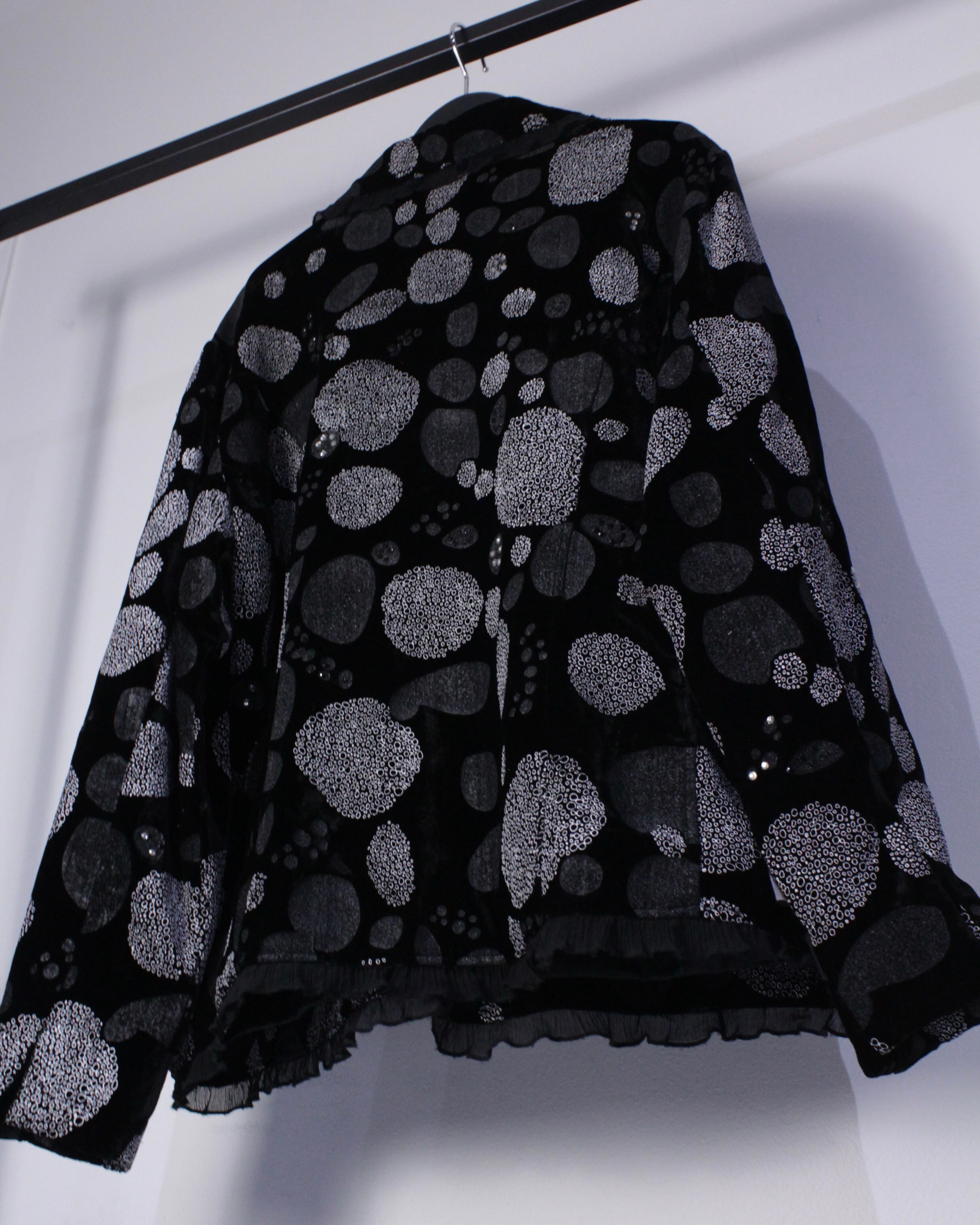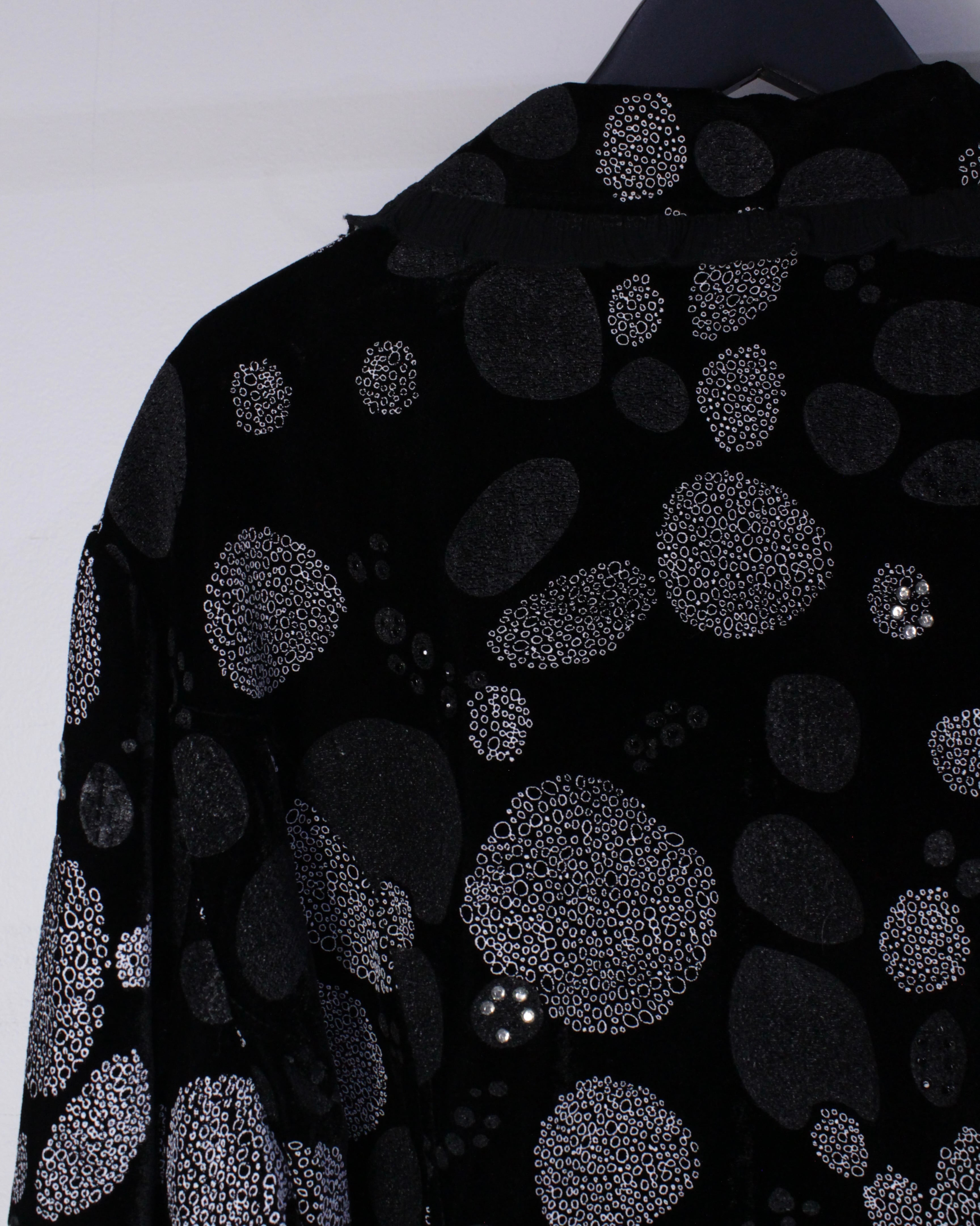 鈍く光沢を放つブラックベロアを用いたボディに、ランダムにドット調のプリントを載せたジャケット。