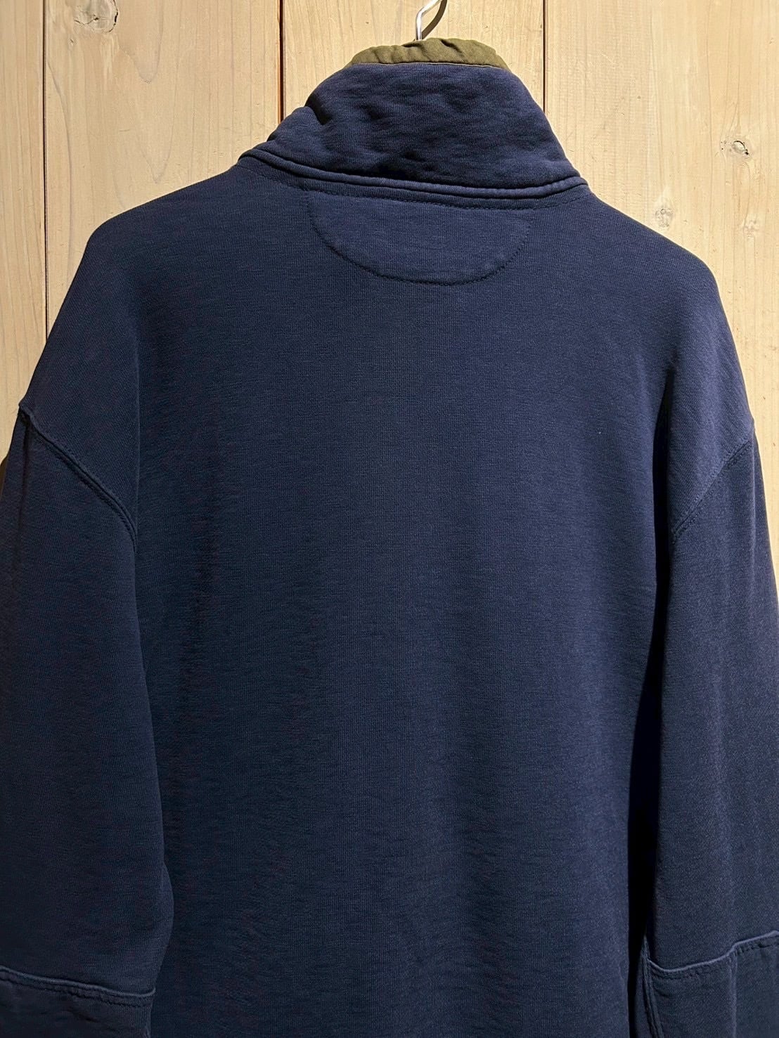 ジップに重なる比翼やネック周りにミリタリーライクなカーキの生地で切り替えを施したハーフジップスウェット。