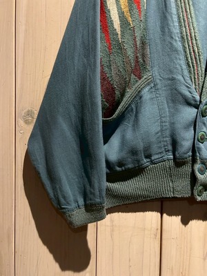 鮮やかなライトブルーのボディをベースに、前身頃にレトロなカラーリングでニット地を切り替えたユーロヴィンテージのカーディガンジャケット。