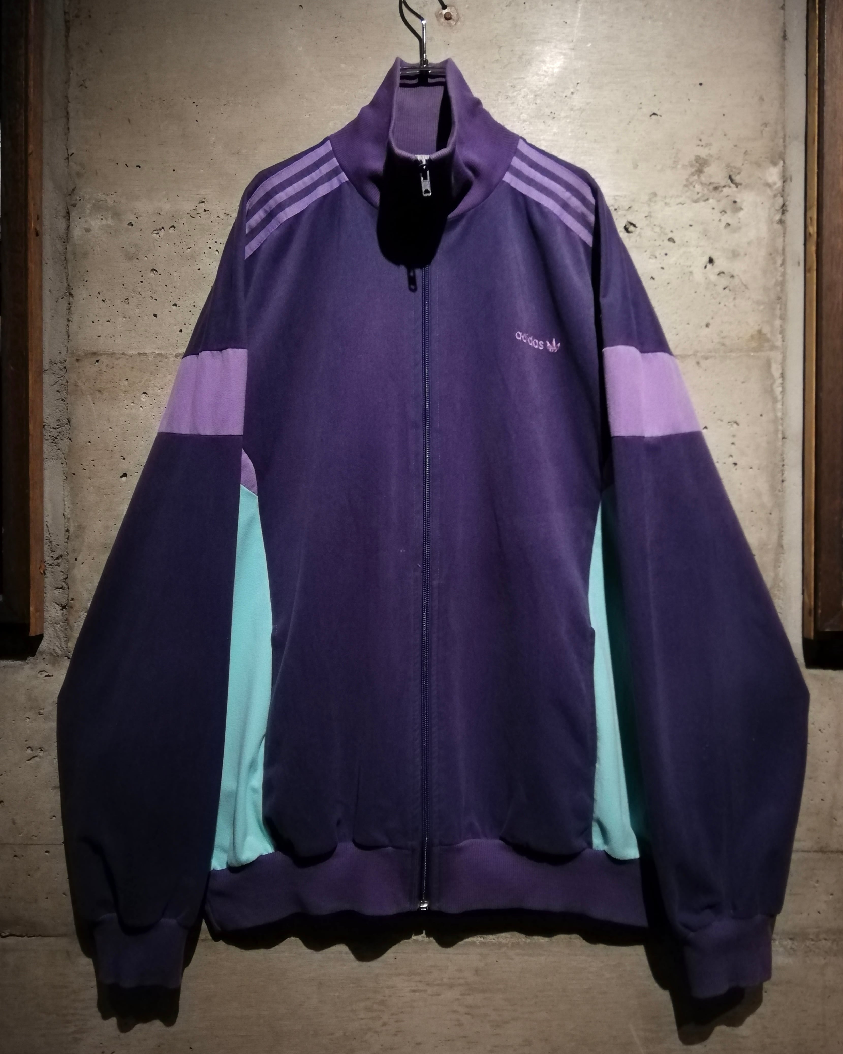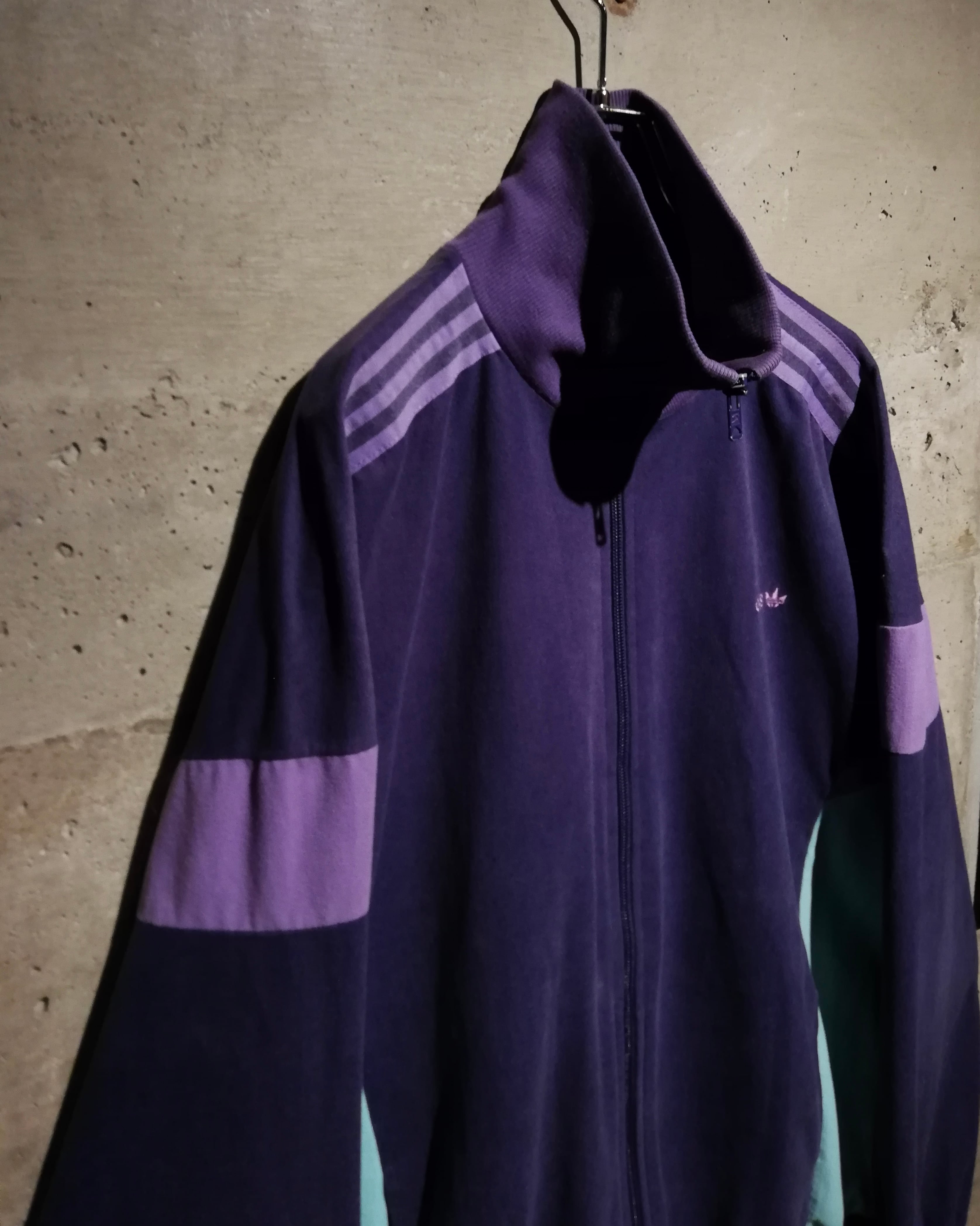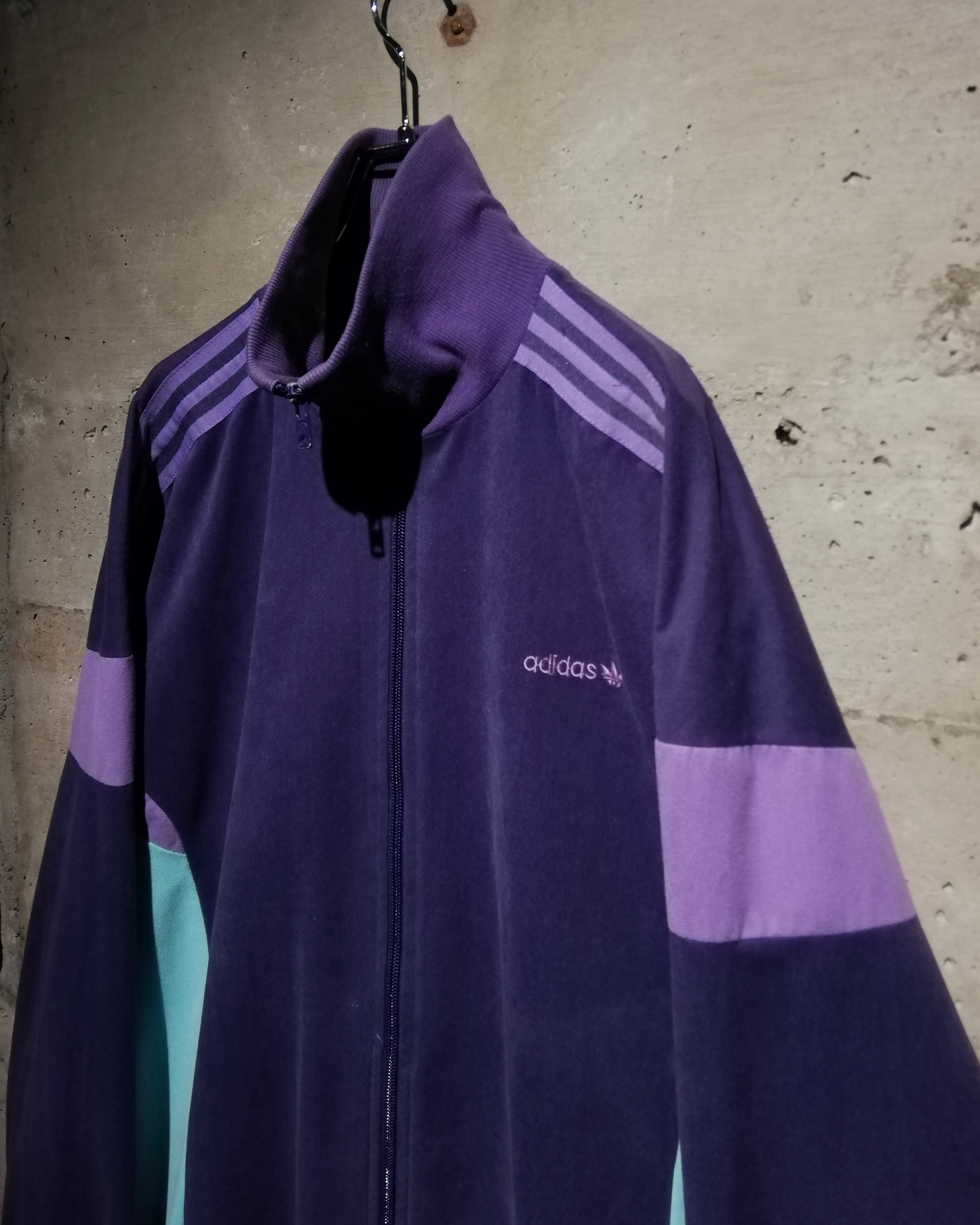 深みのあるパープルを基調に、ライトパープルとミントグリーンを切り替えで配した、存在感抜群のカラーリング。フロント胸元にはトレフォイルロゴ刺繍、肩にはブランドの代名詞でもあるスリーストライプスをあしらい、この年代特有のスポーティでレトロなデザイン性を見せる1着。