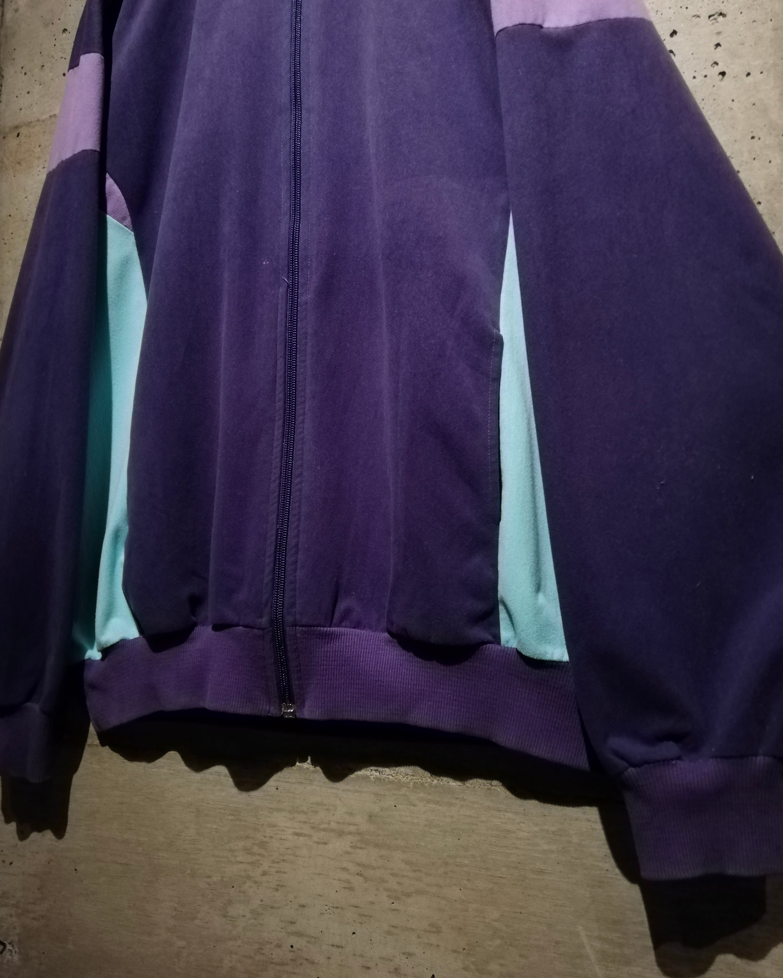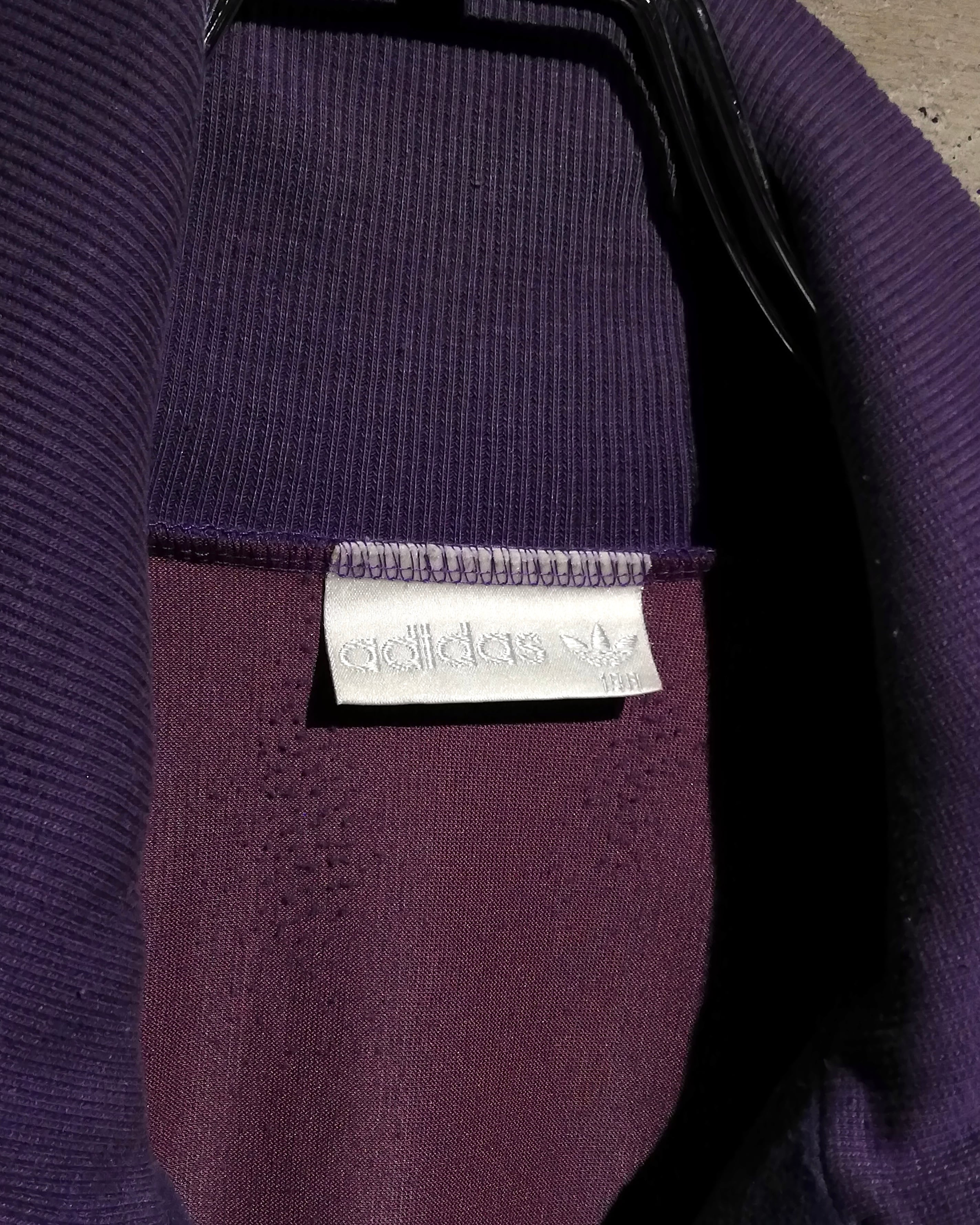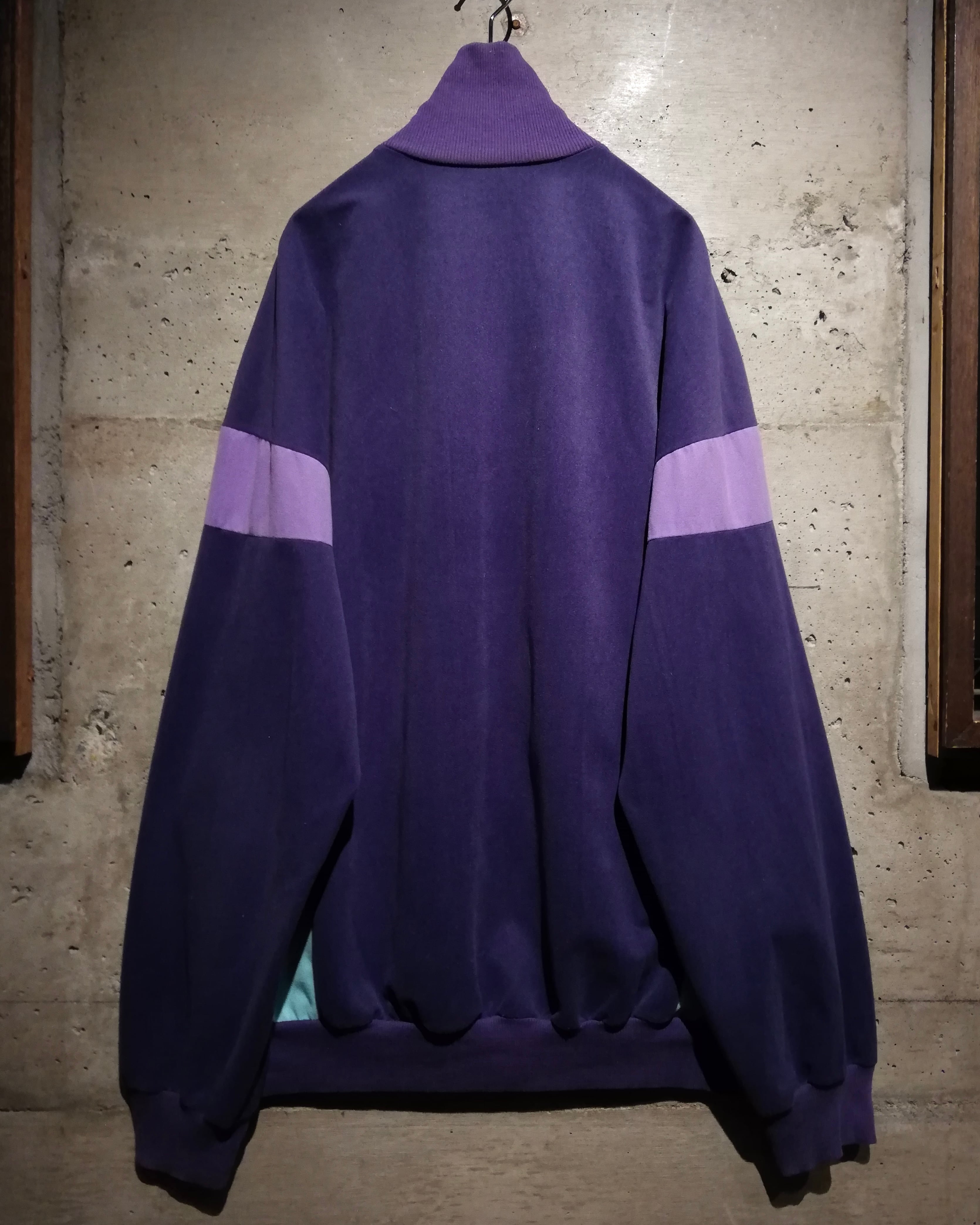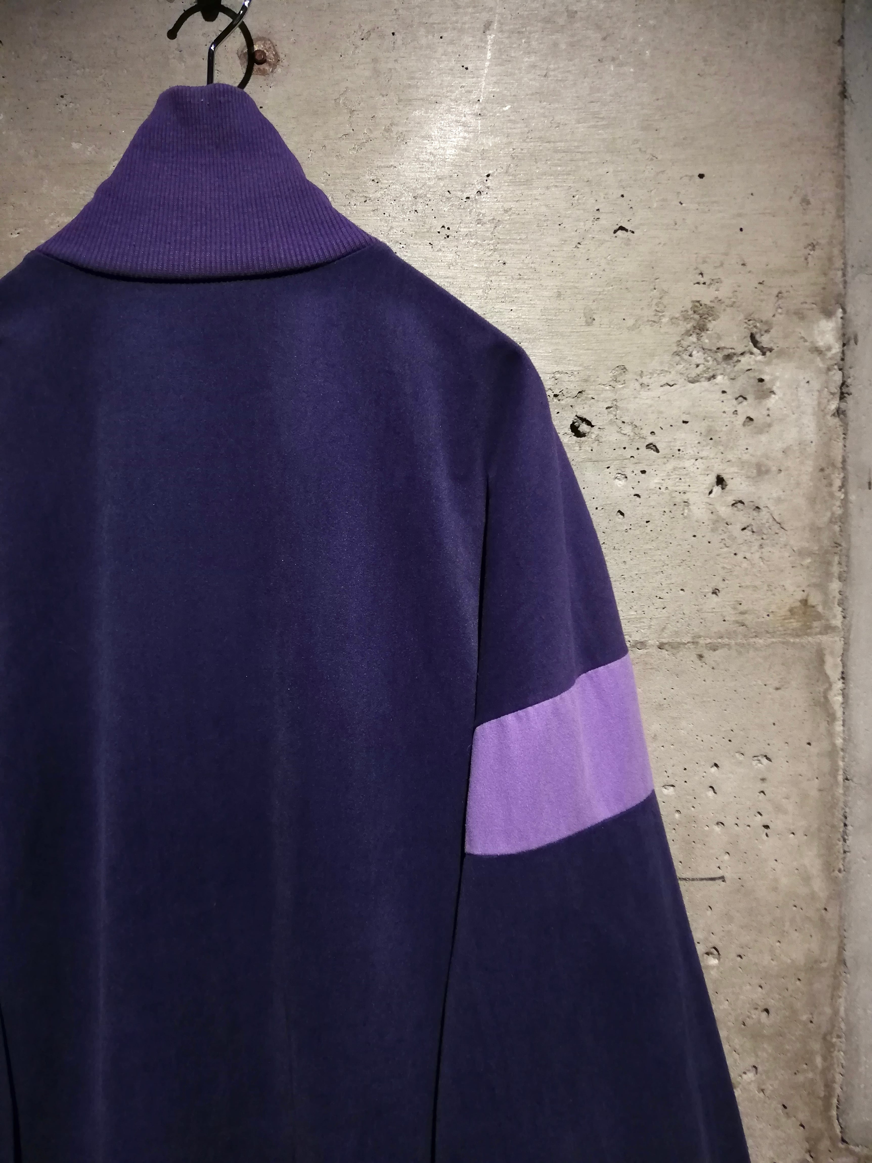 深みのあるパープルを基調に、ライトパープルとミントグリーンを切り替えで配した、存在感抜群のカラーリング。フロント胸元にはトレフォイルロゴ刺繍、肩にはブランドの代名詞でもあるスリーストライプスをあしらい、この年代特有のスポーティでレトロなデザイン性を見せる1着。