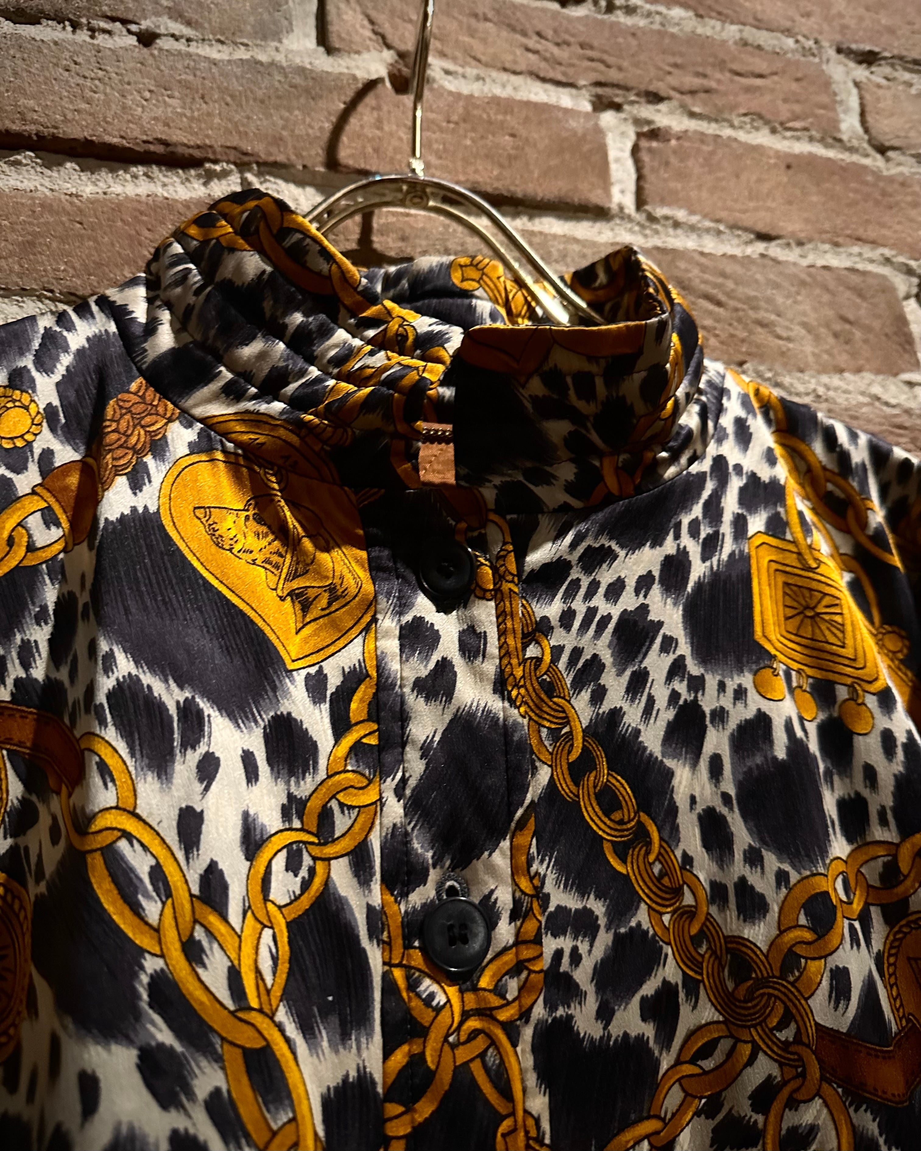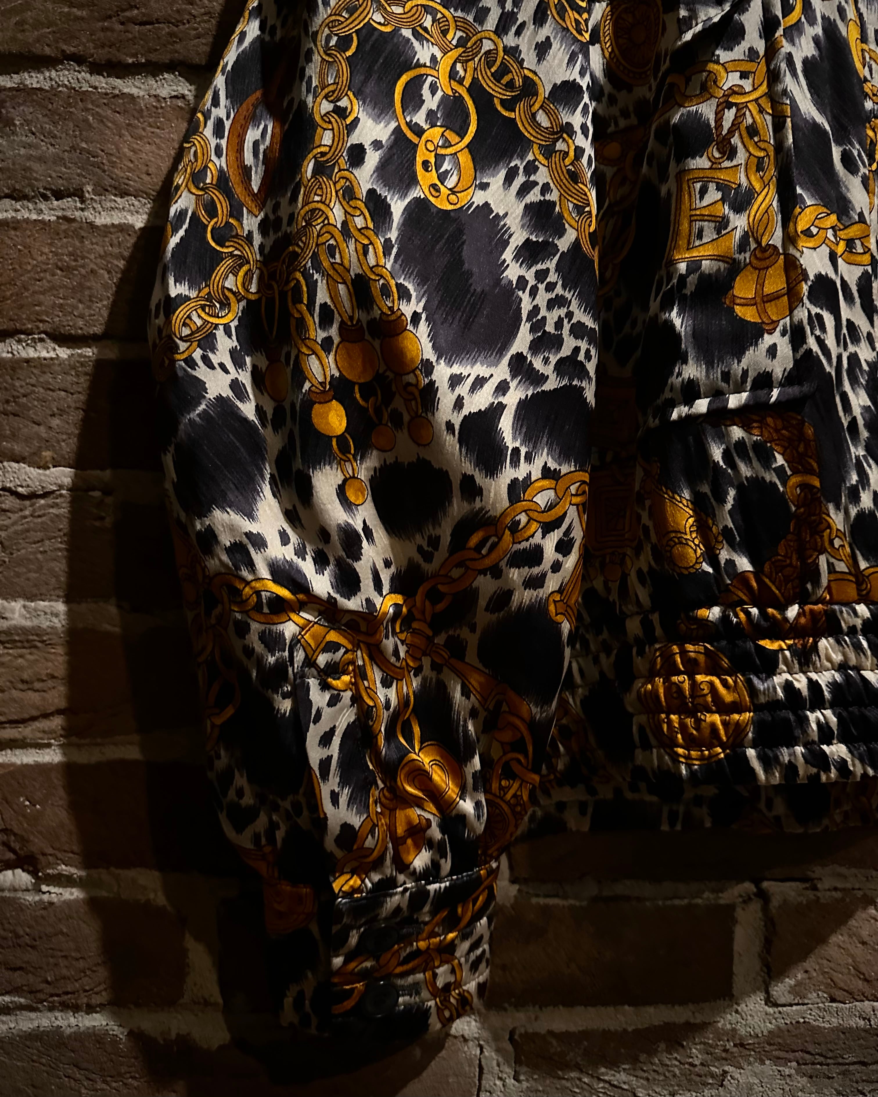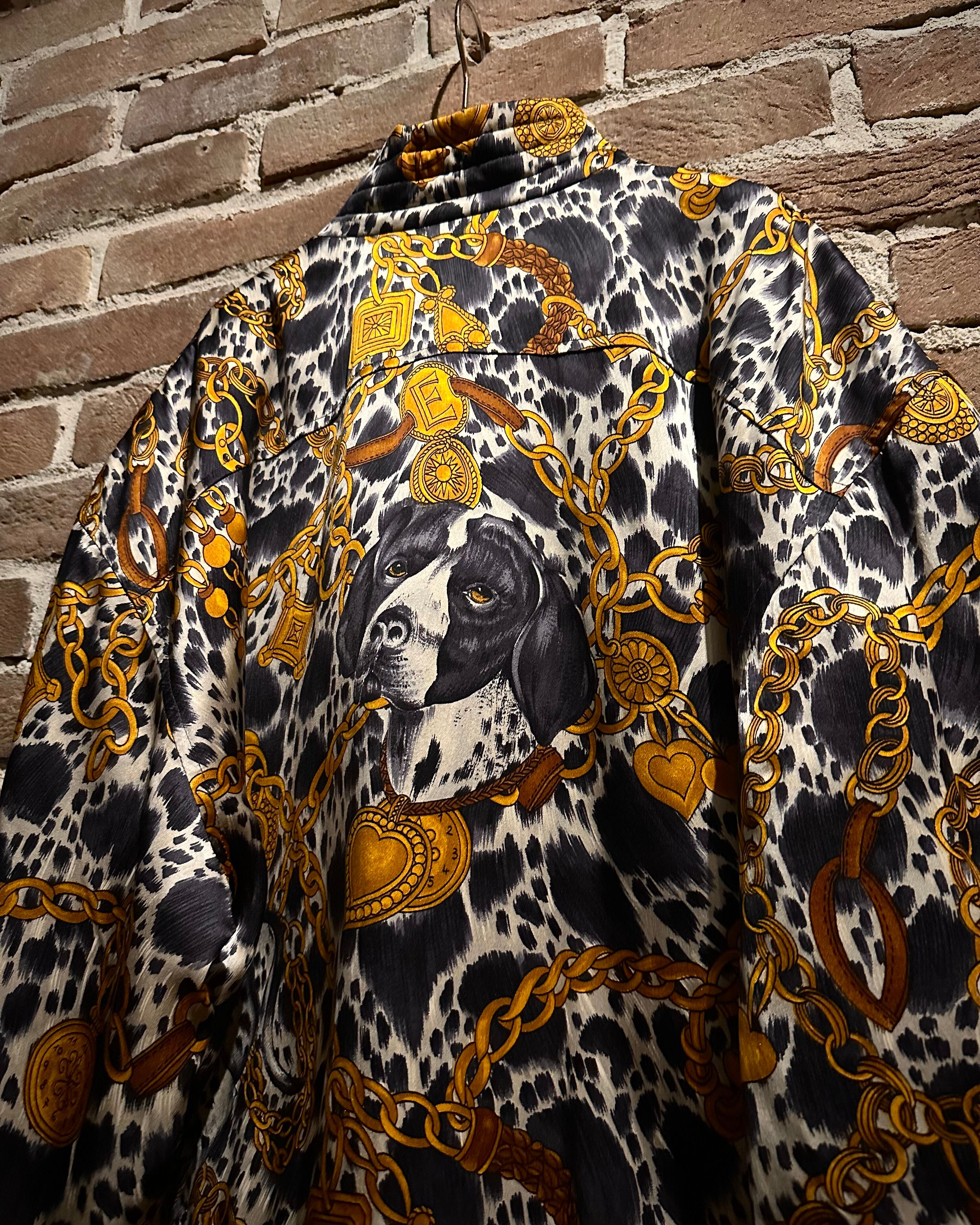 艶やかなシルク100%のボディに、ダルメシアン柄をベースとし、スカーフ調のチェーンモチーフを組み合わせた、非常に華やかでラグジュアリーな雰囲気を放つ1着。
