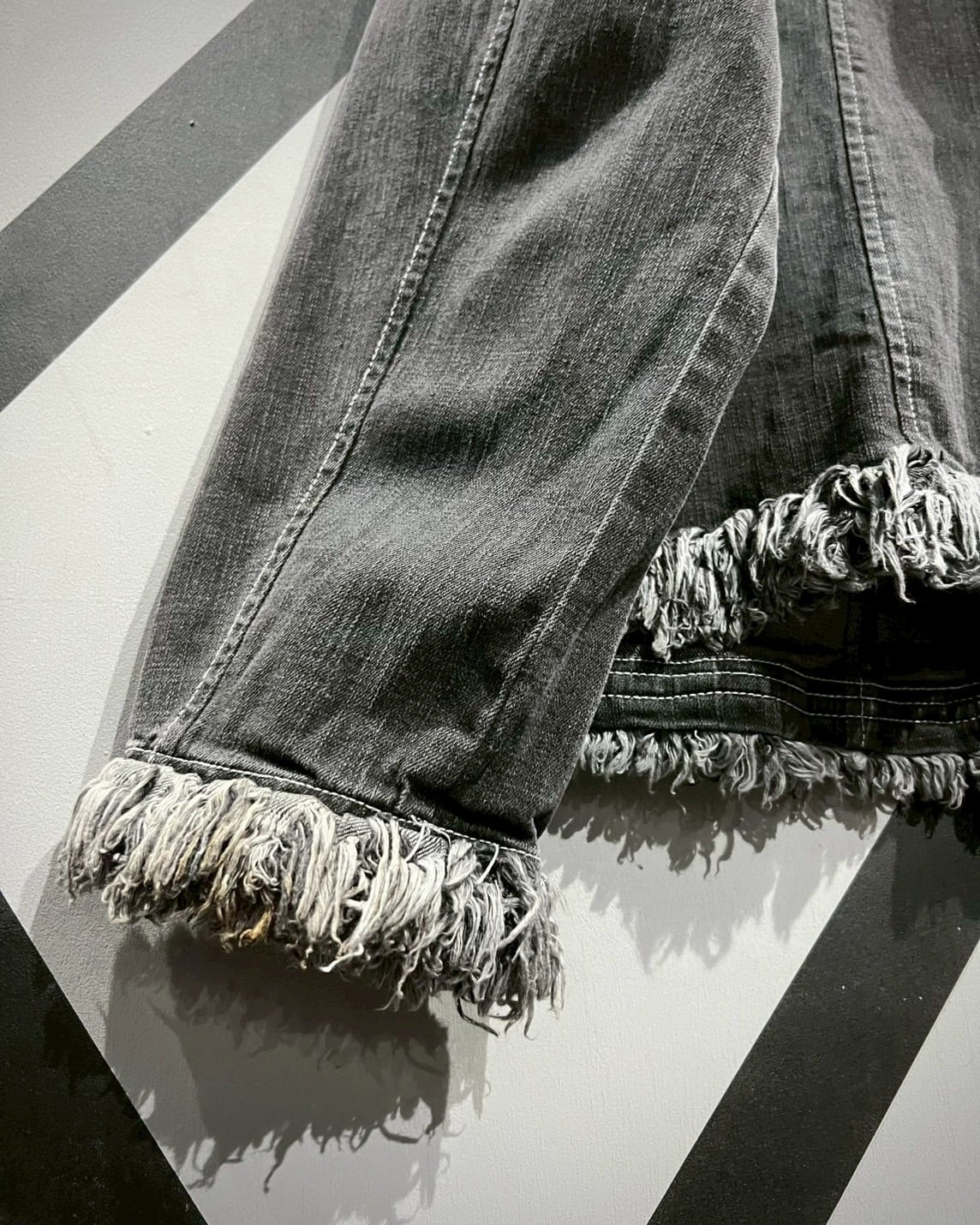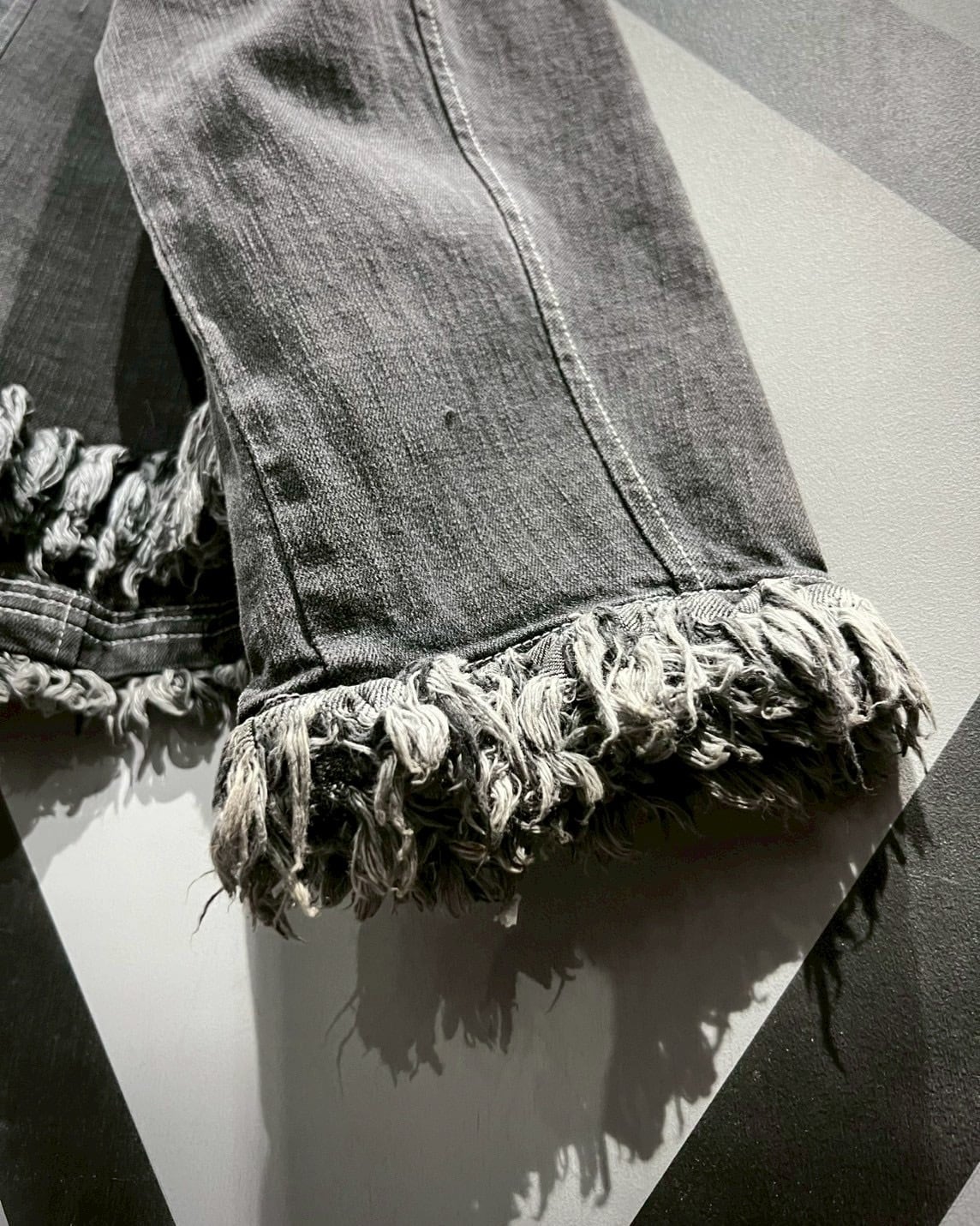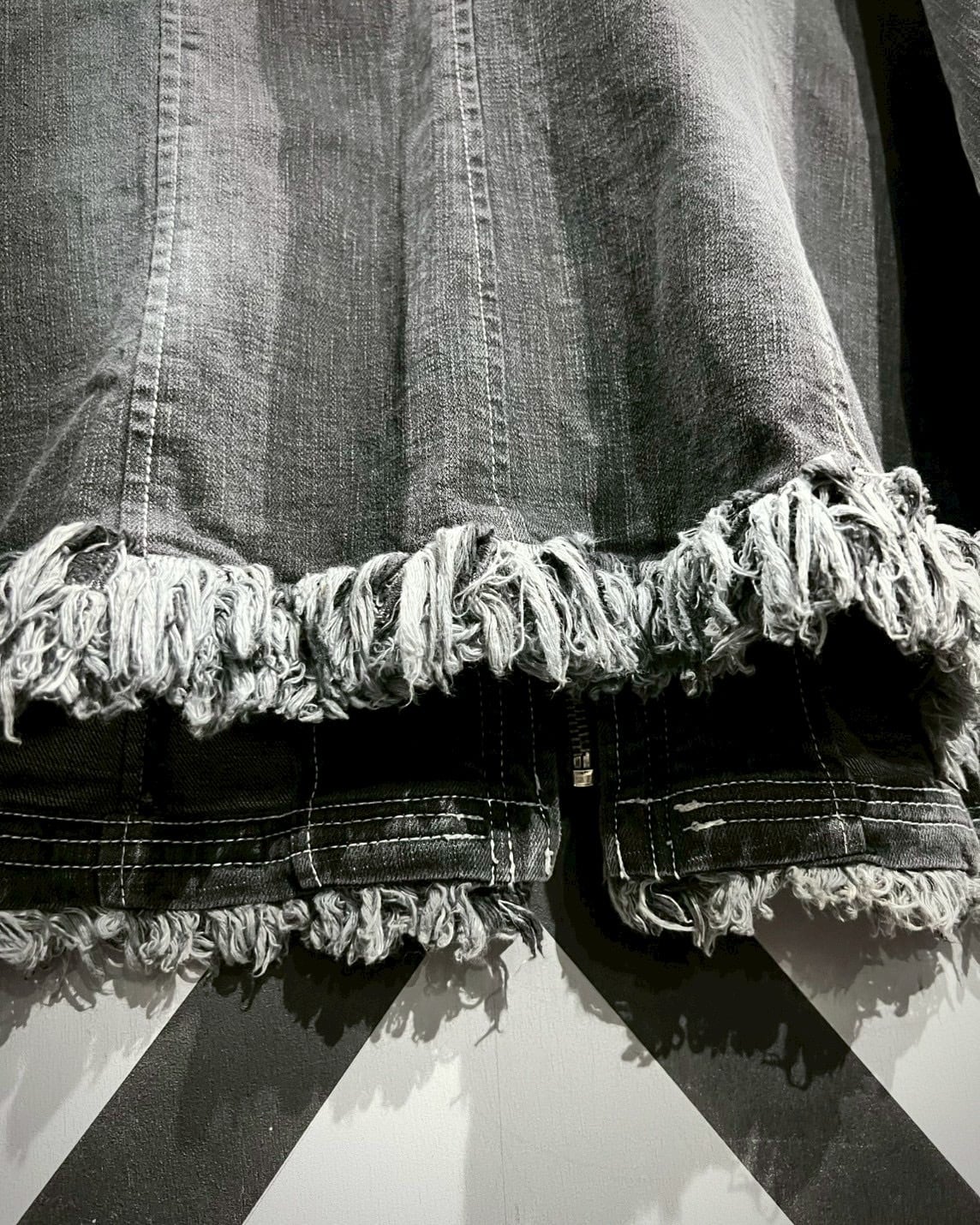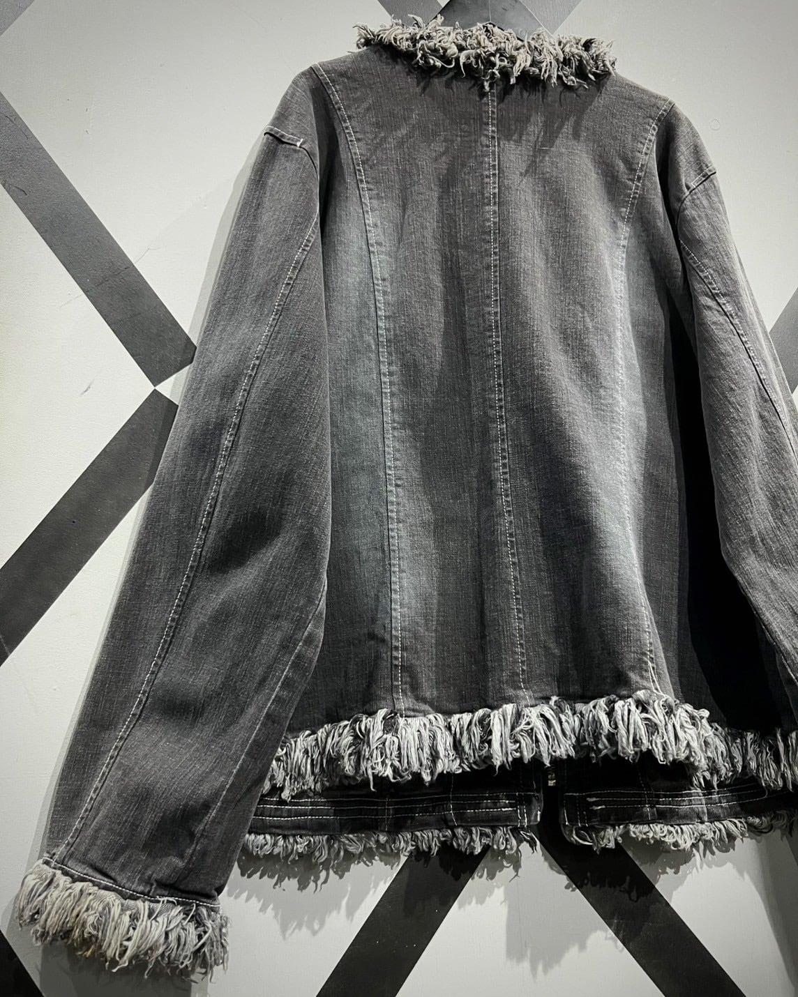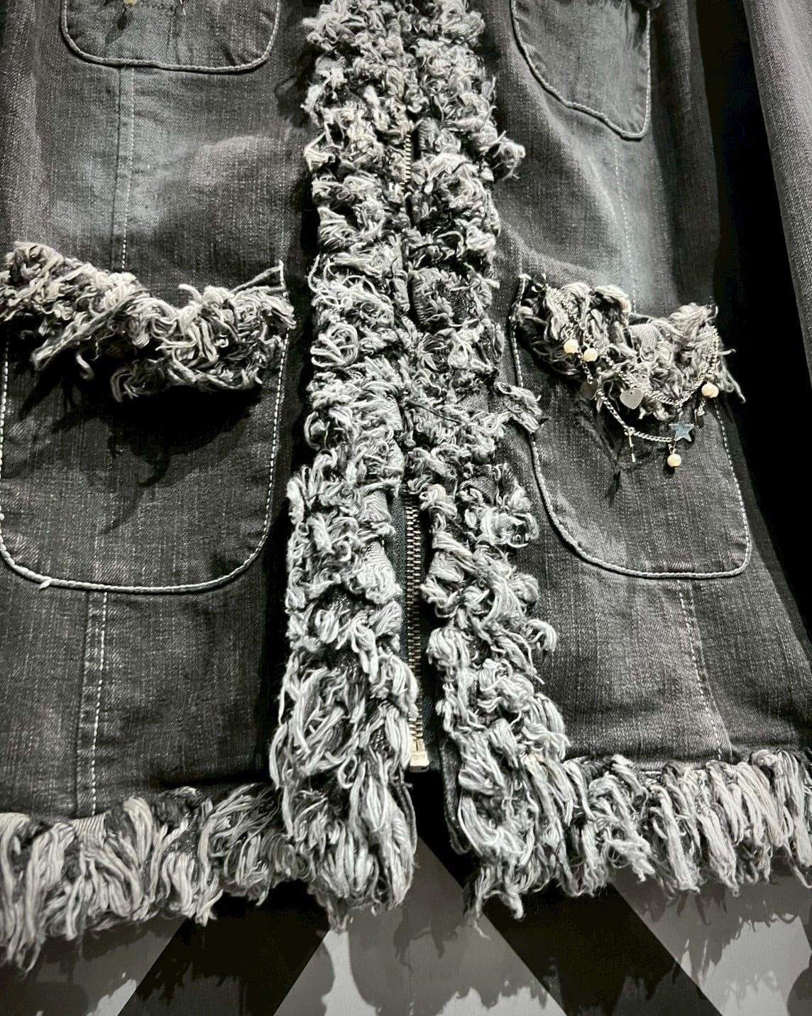 風合い深いフェードの効いたグレーデニムのボディに、随所にフリンジを施した、シャネルのジャケットをサンプリングした逸品。