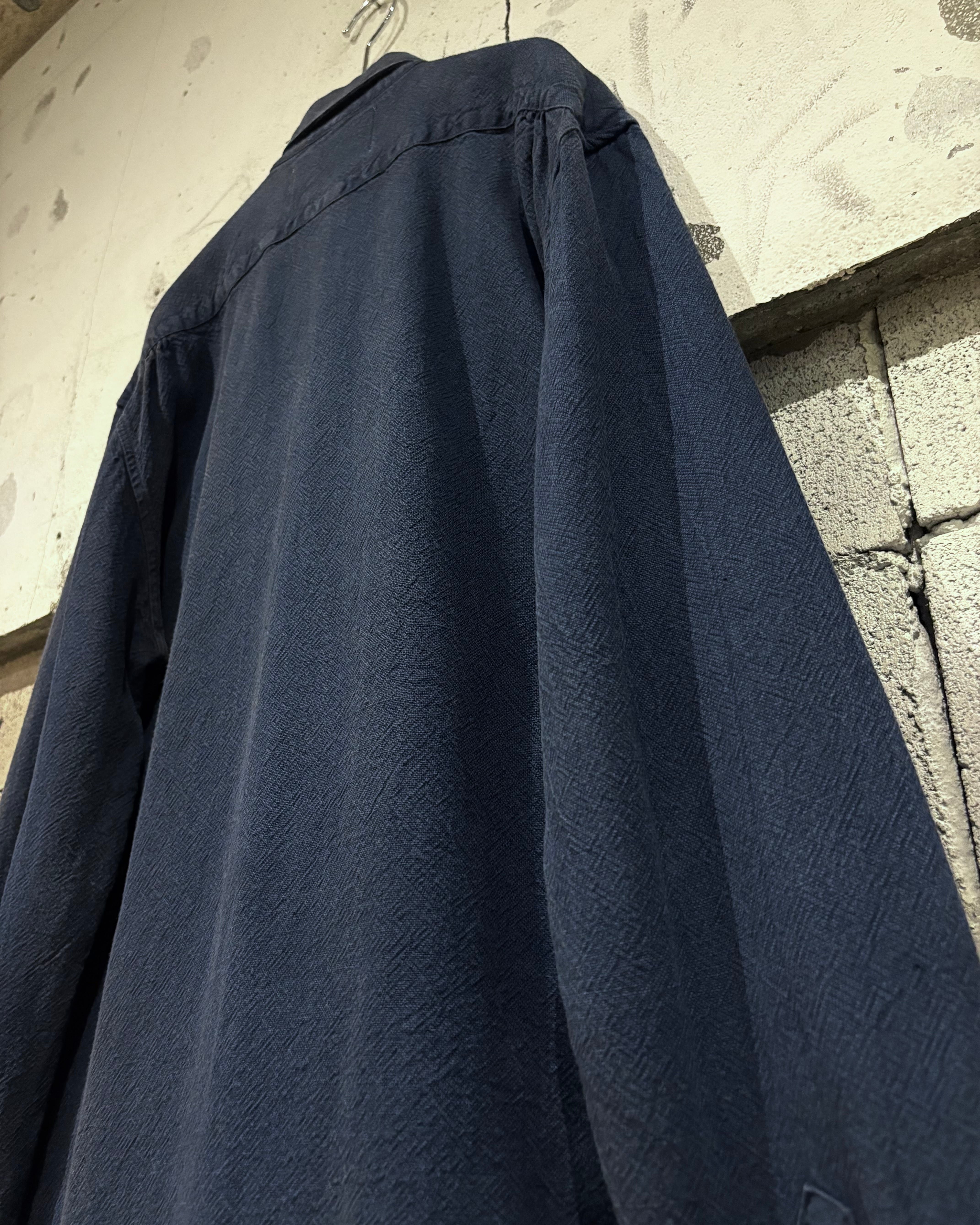 リネン×コットンの天然素材を掛け合わせたボディをベースに、ネイビーがフェードした渋みのある色合い。ポルトガル製ならではの丁寧な縫製と上質な生地感で、シンプルながらも深い味わいを感じさせる、USEDならではの1着。