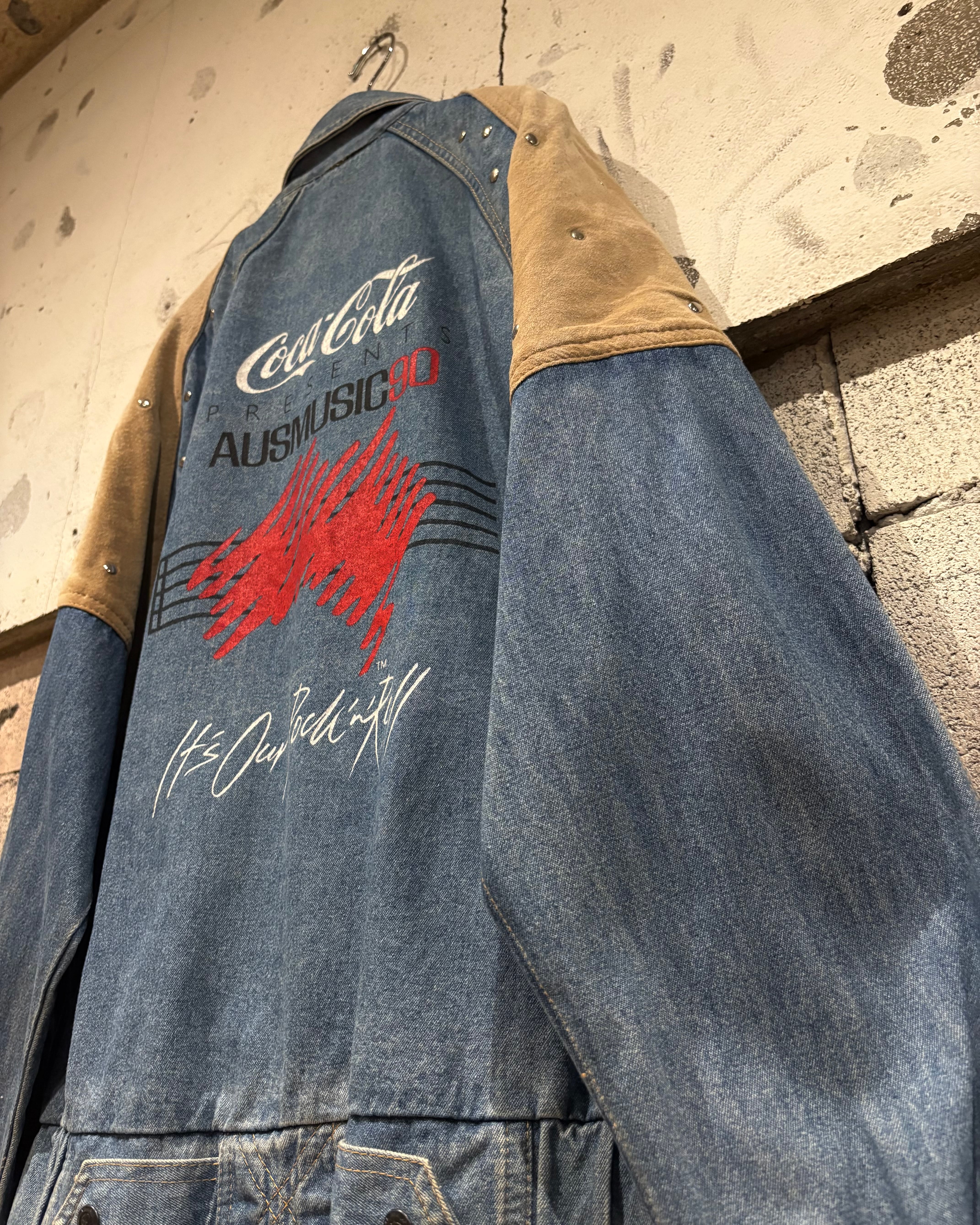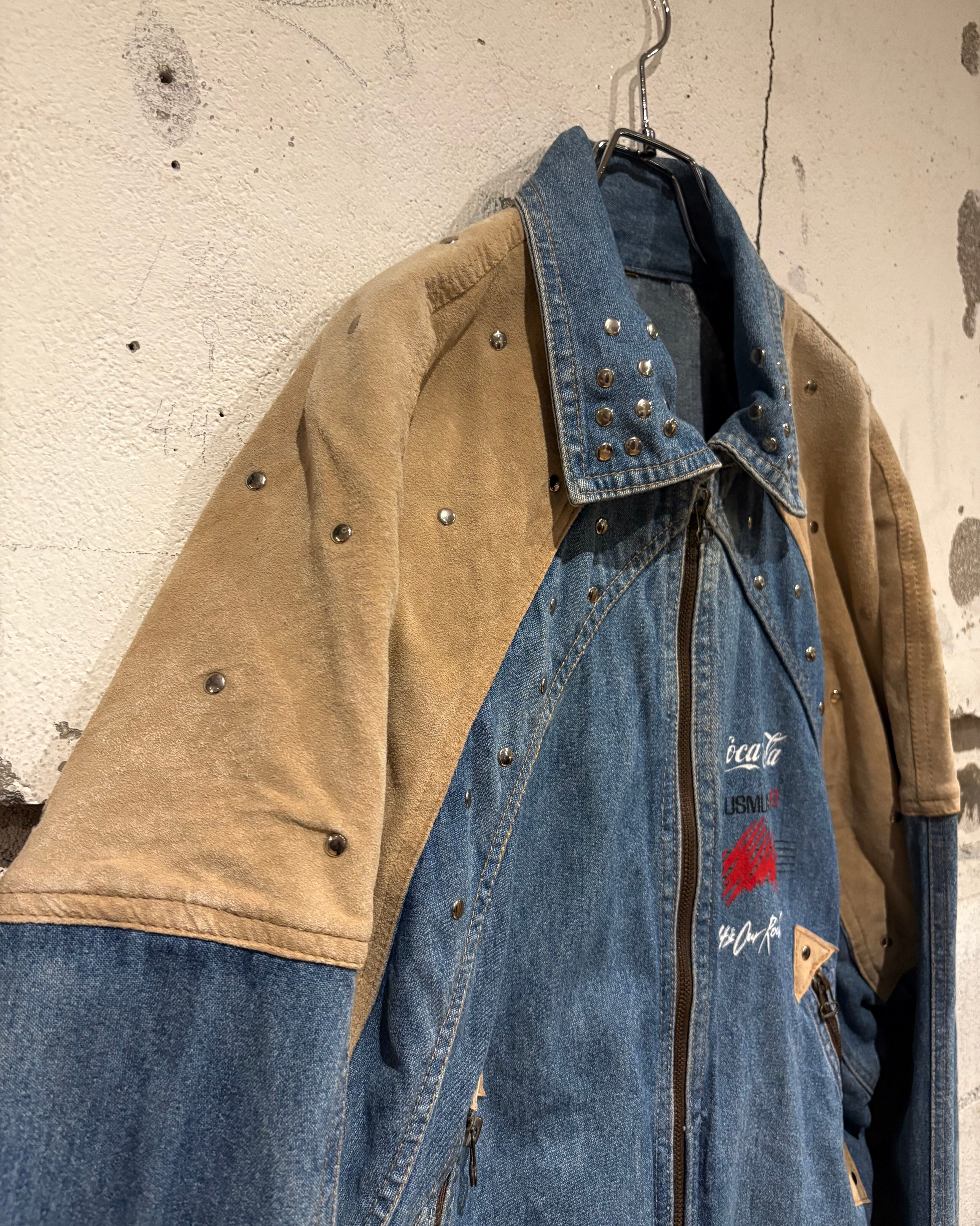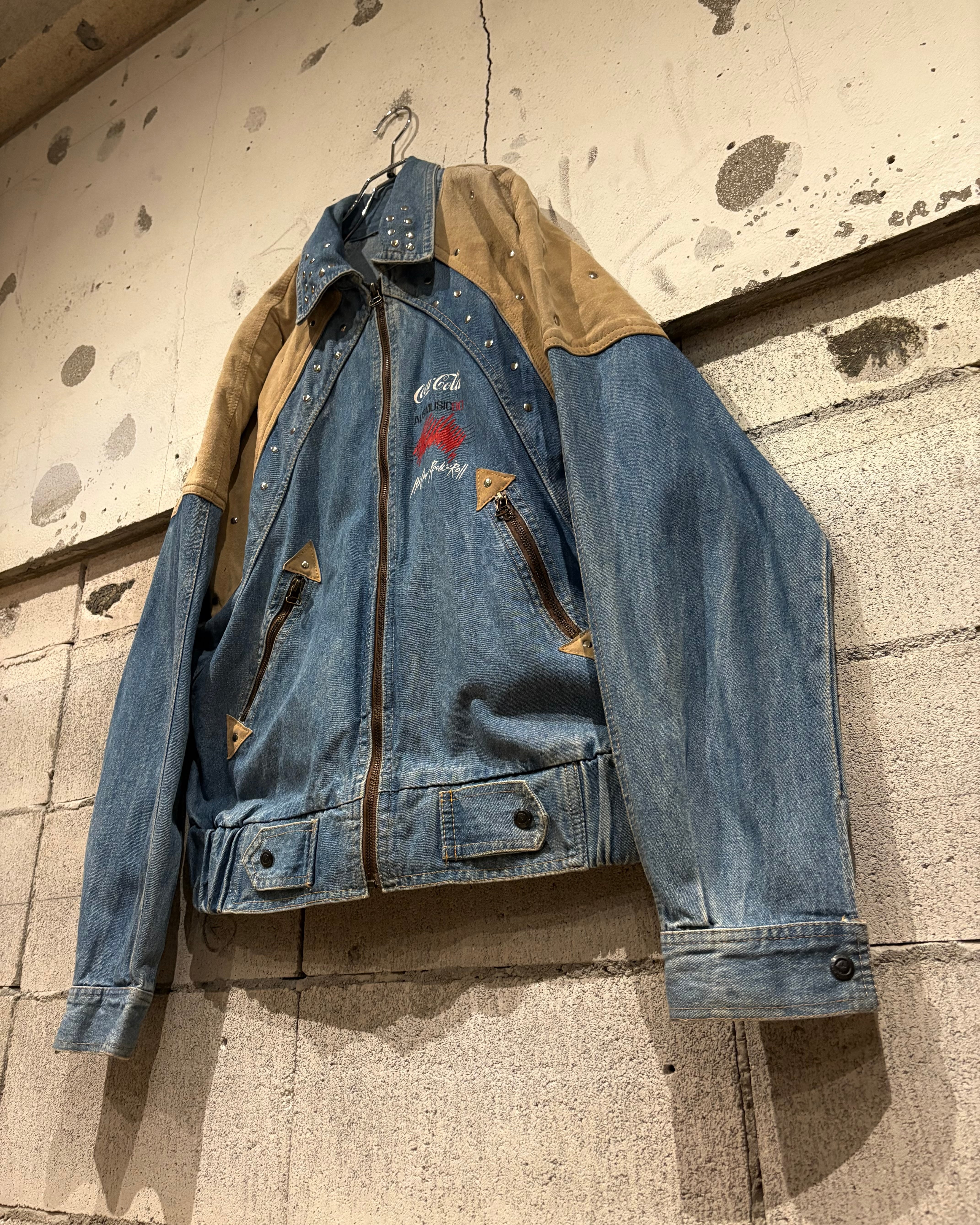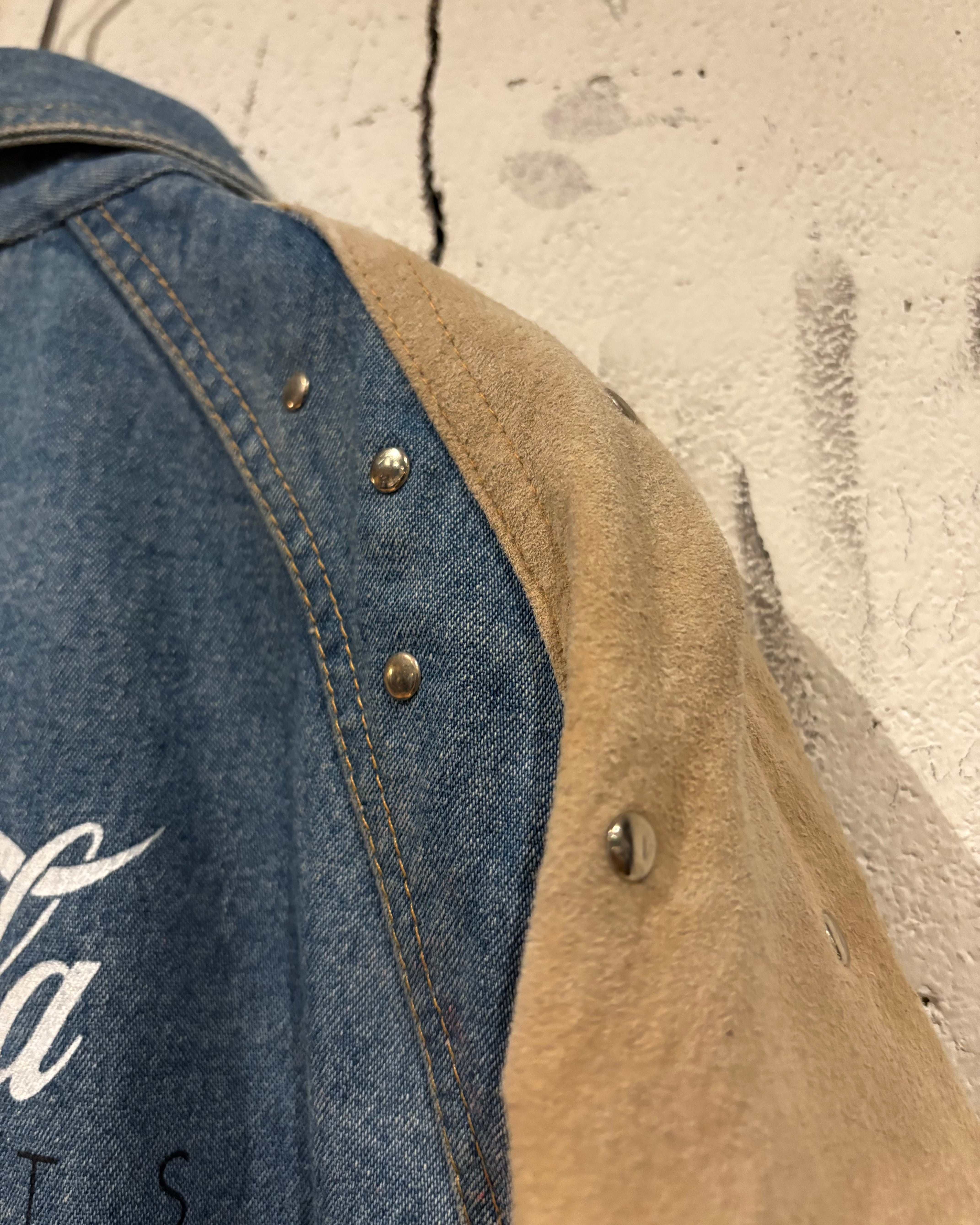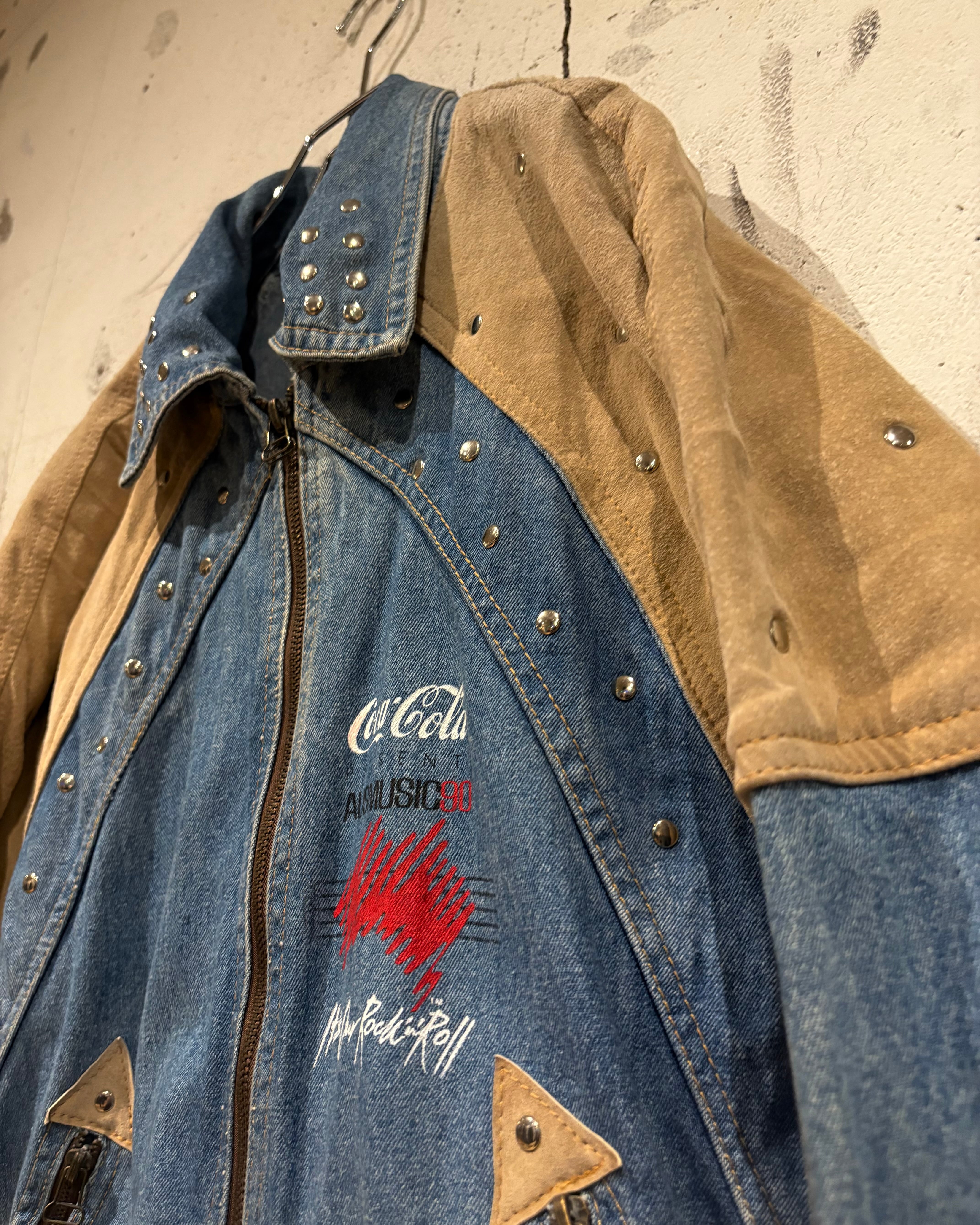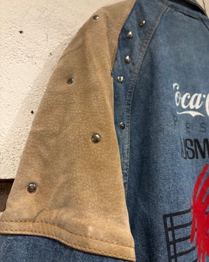 背面にはプレゼンターの”Coca-Cola”のロゴやイベント名をプリントで載せ、フェードしたデニムとスエードの掛け合わせにプリントとスタッズが掛け合わさることで、圧倒的存在感を誇ります。