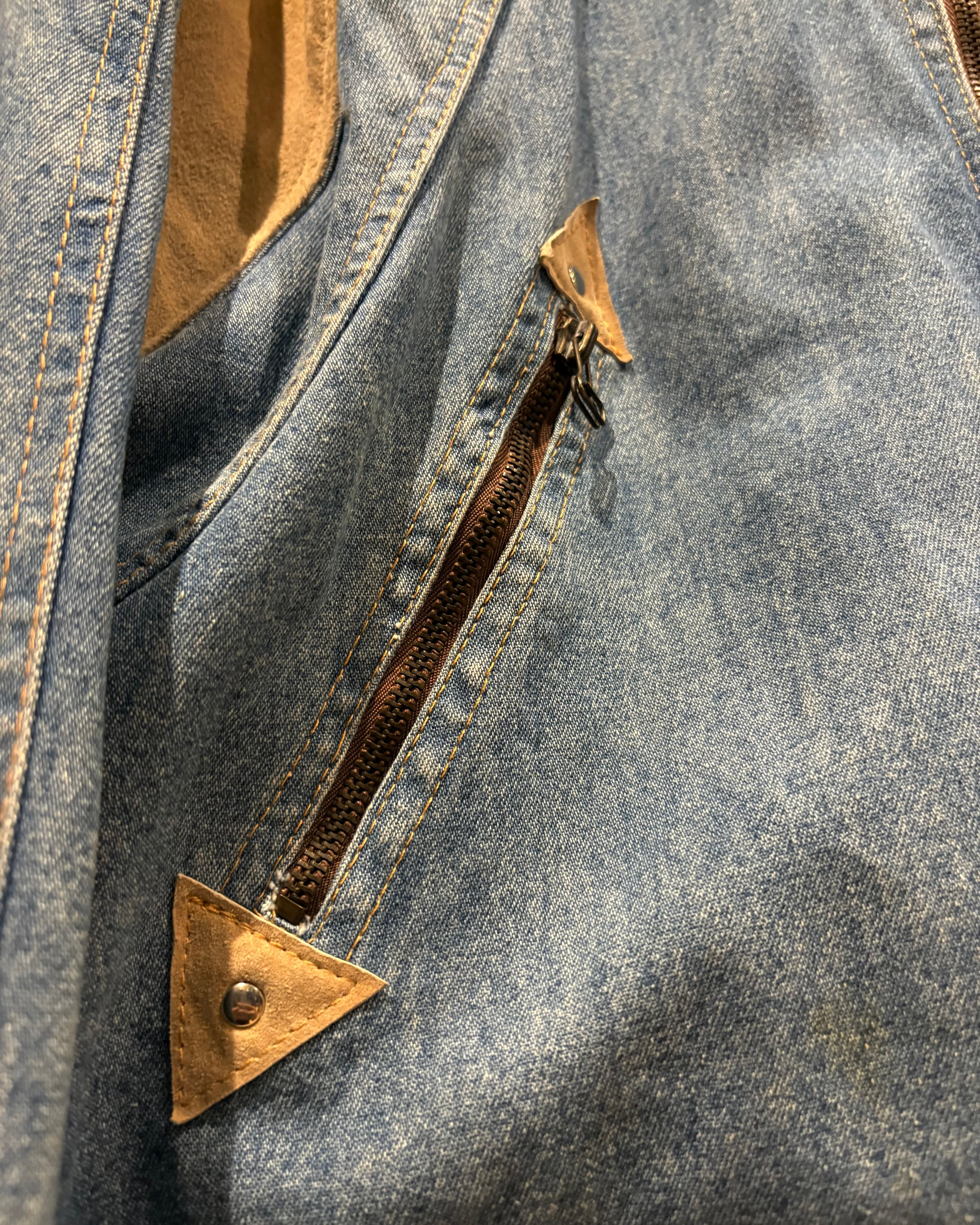 フェード感の美しいデニムボディに、スエードレザーを切り替えたバイマテリアル仕様。さらに襟やヨークにはスタッズを打ち込んだカスタムが施された、"AUSMUSIC90"のプロモーションの1着。