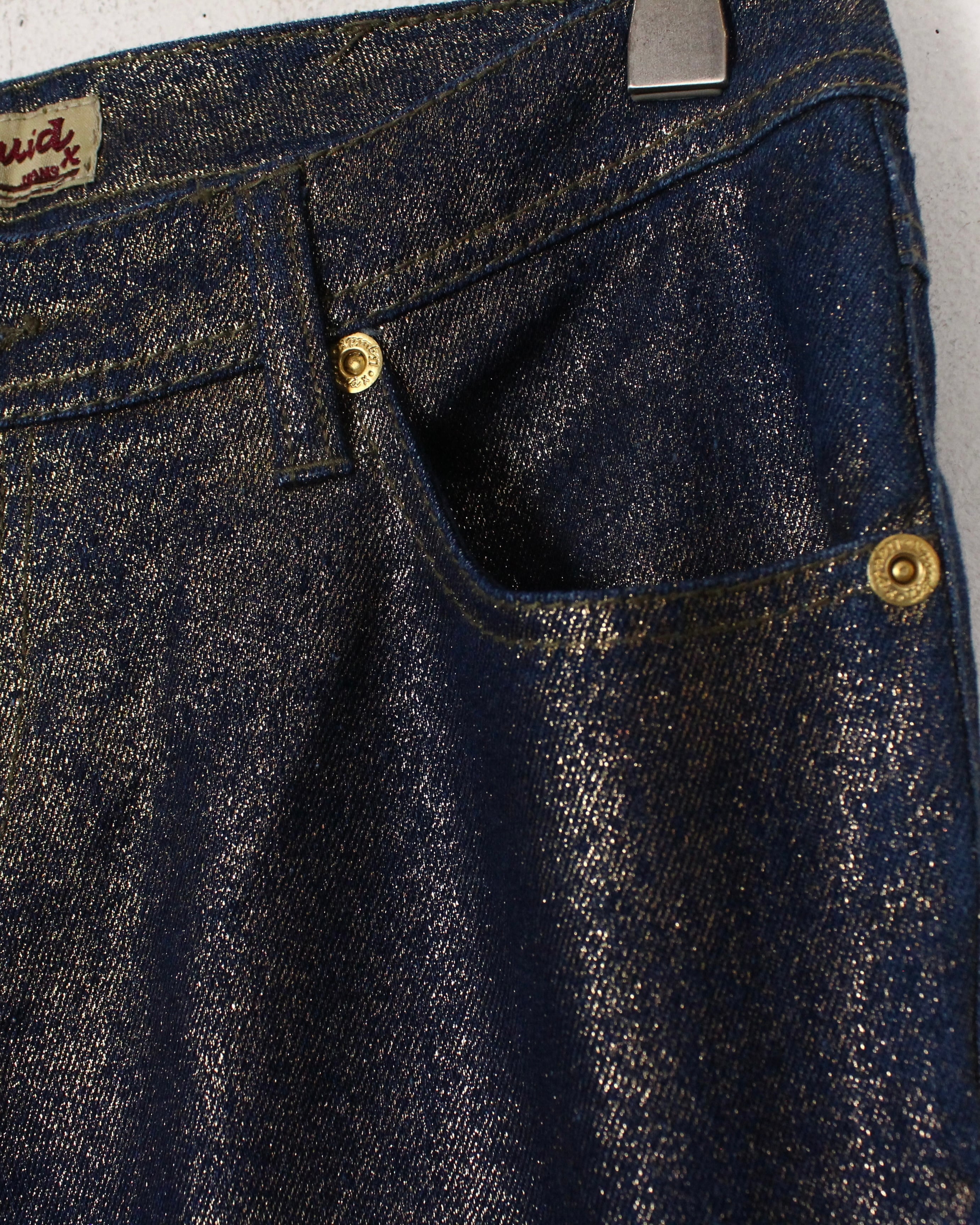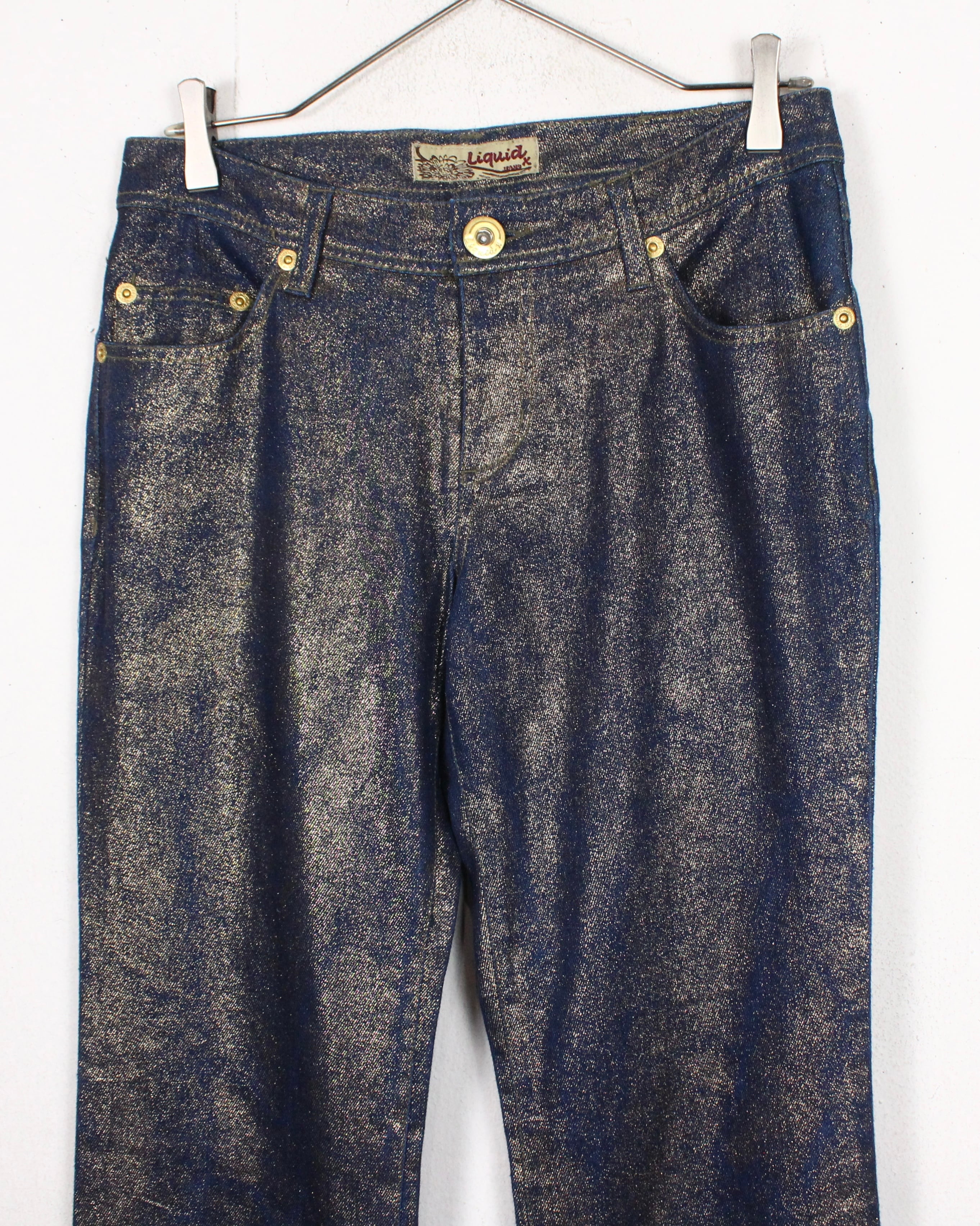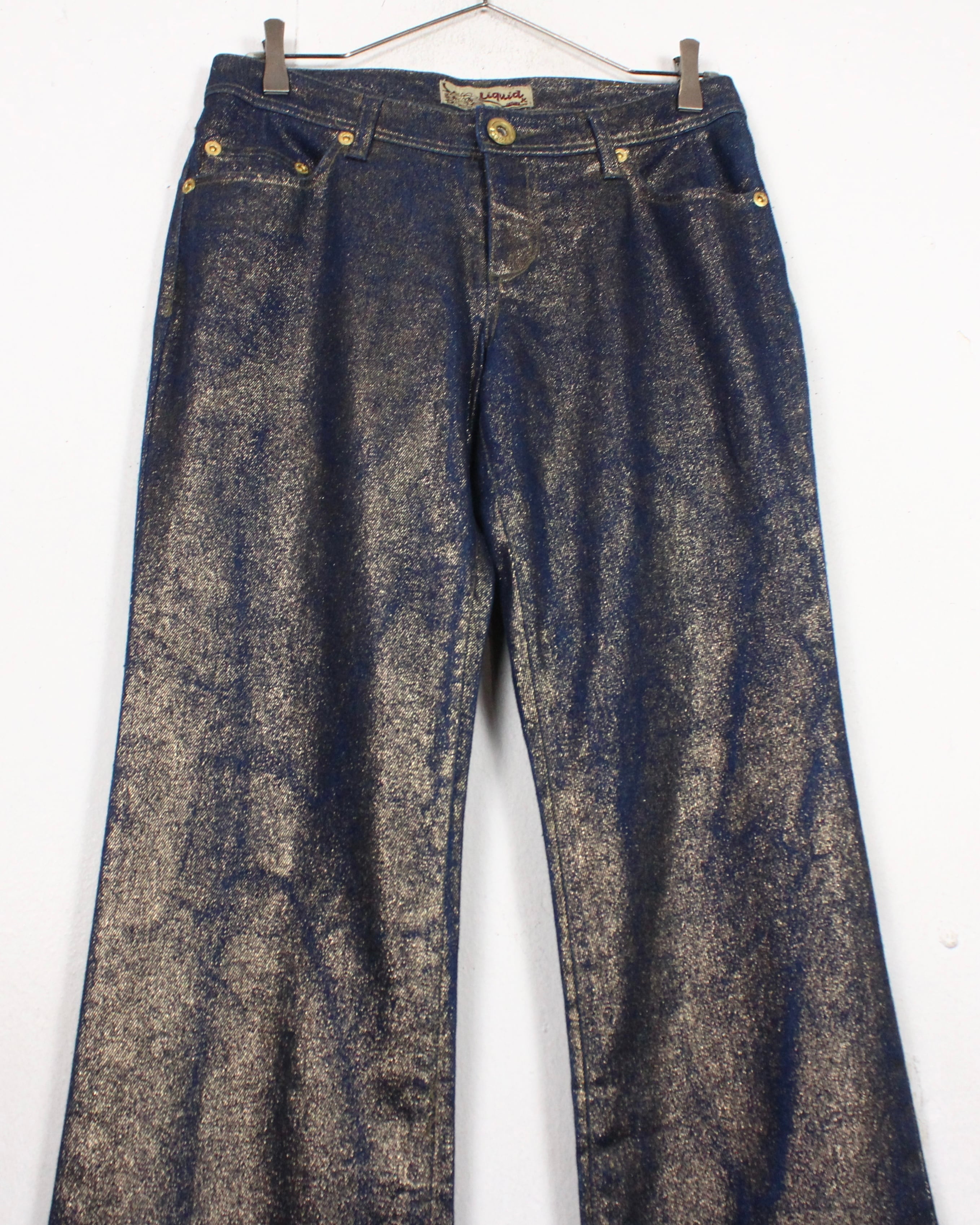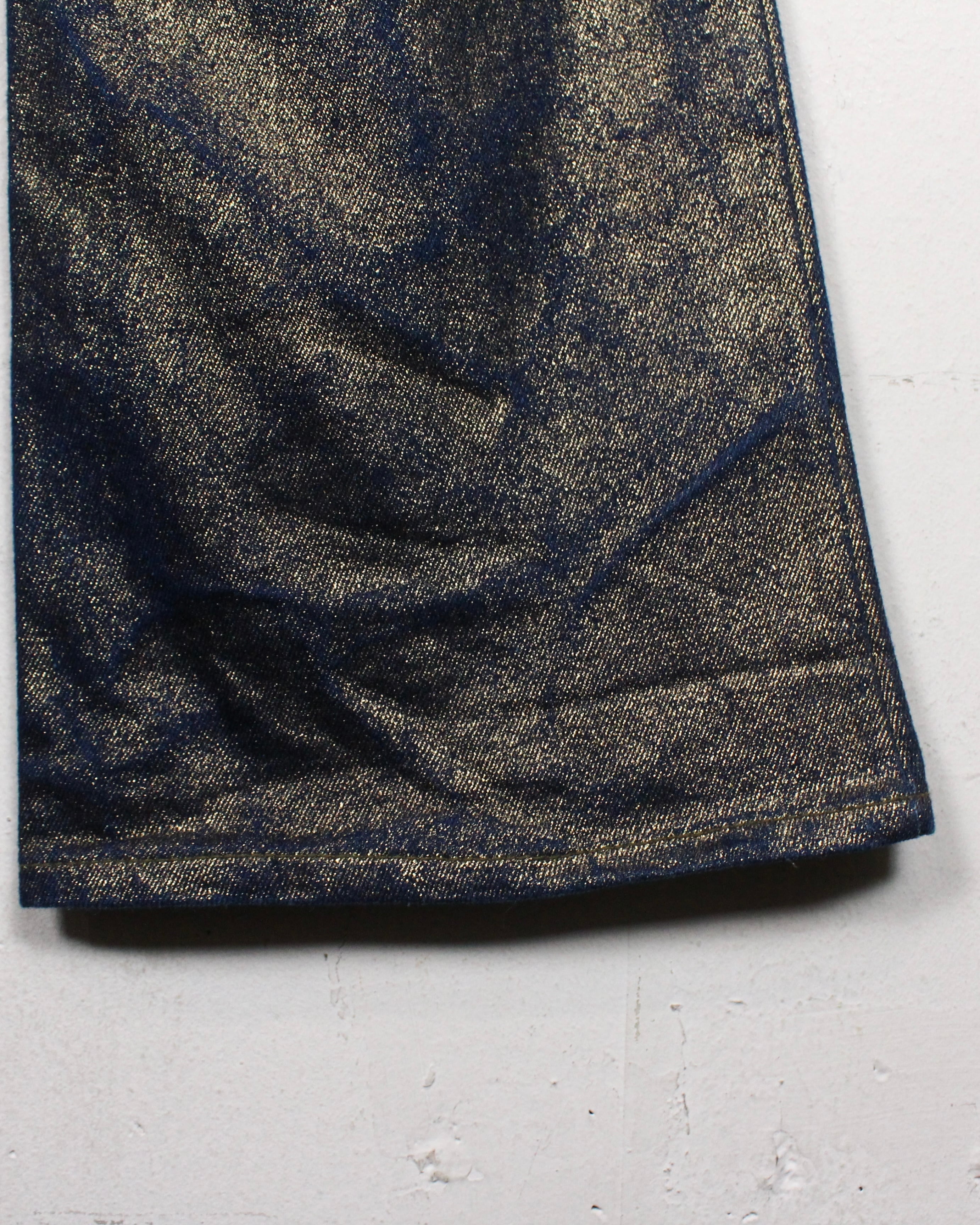 インディゴをベースに、全体へゴールドのメタリックな素材を織り込んだフレアパンツ。