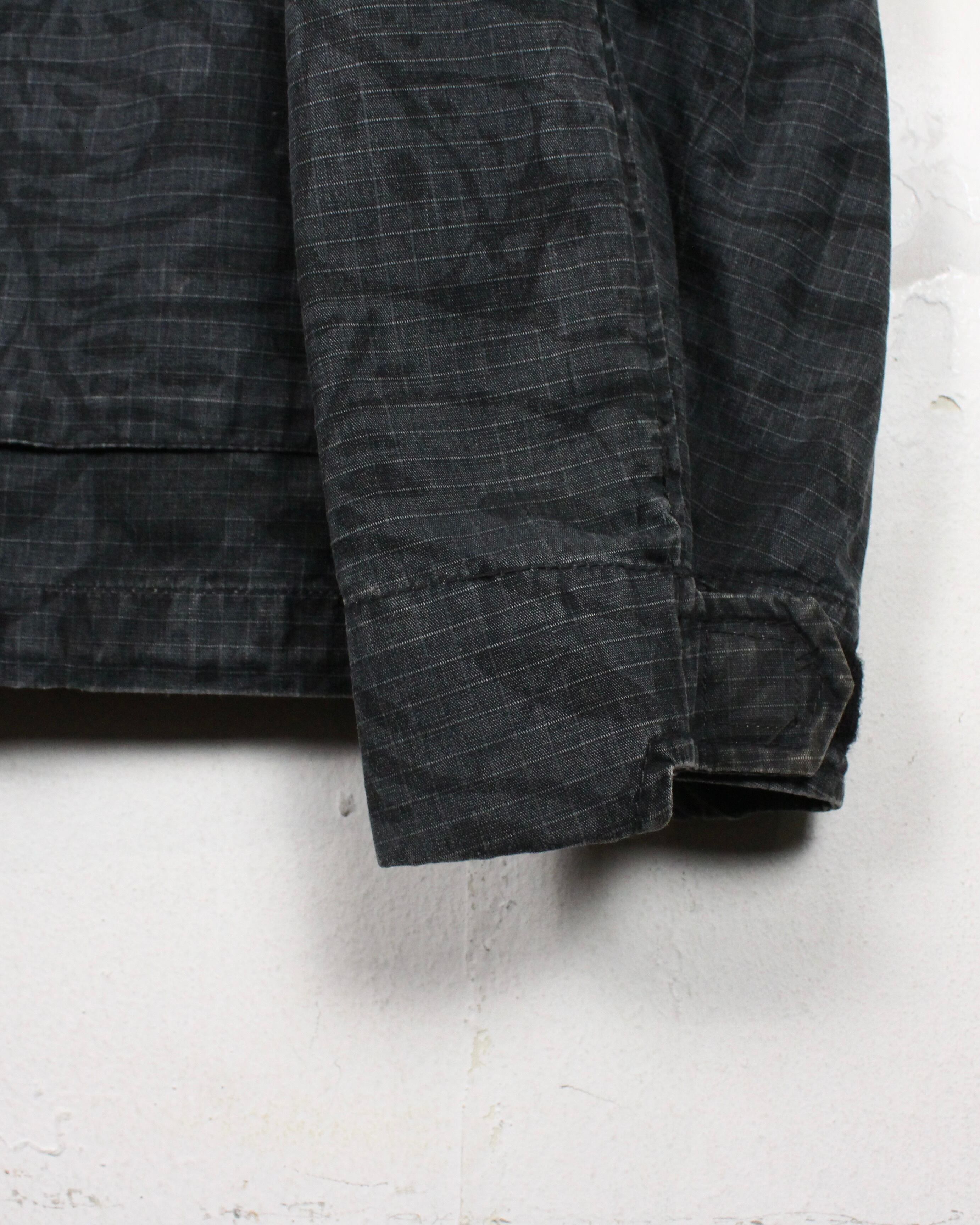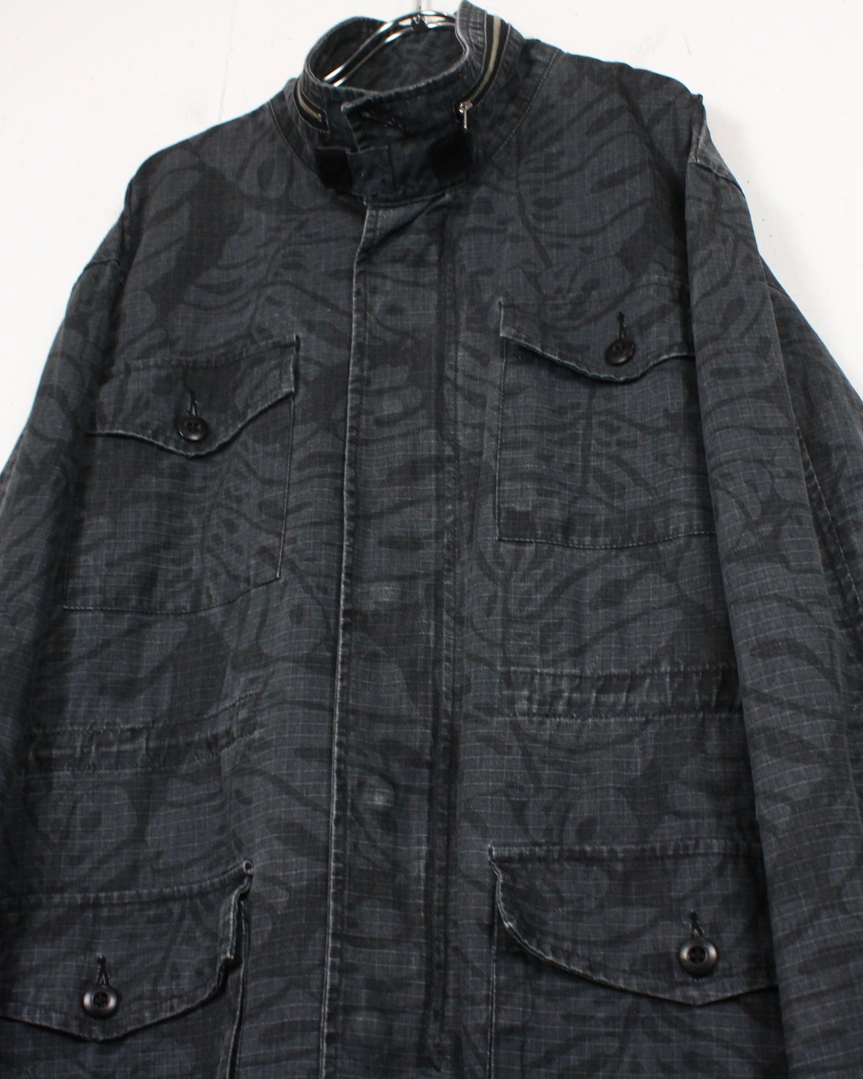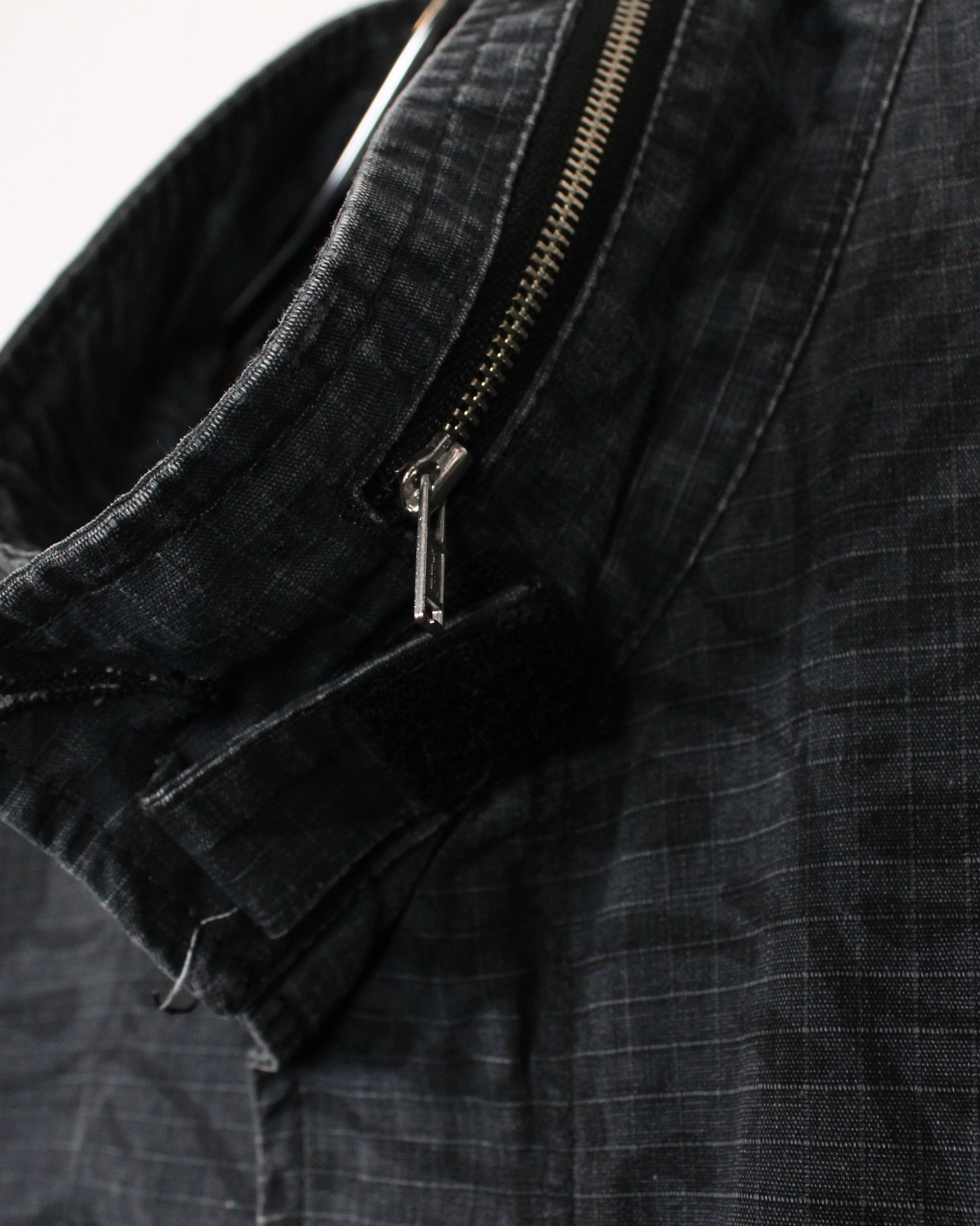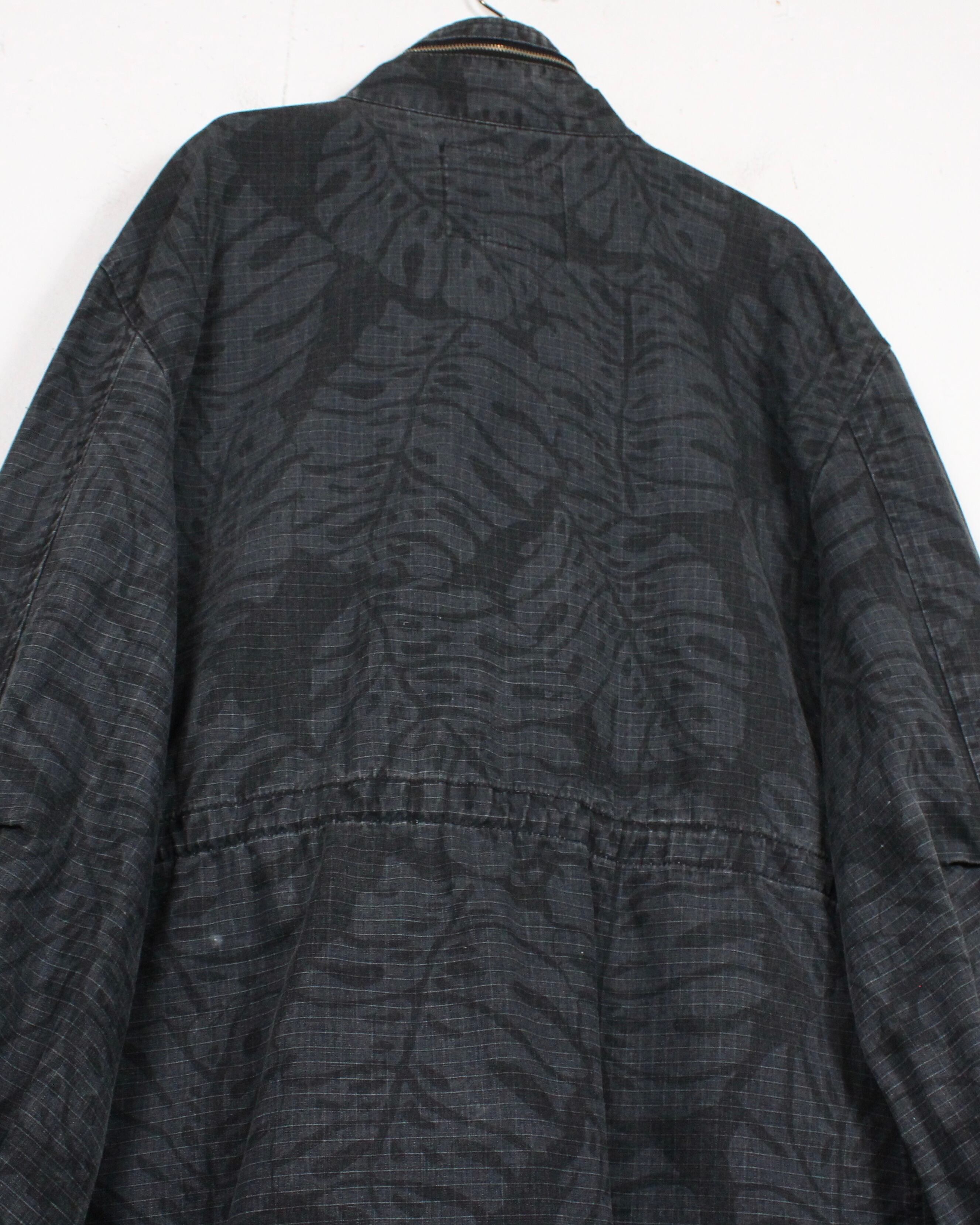 強度のあるコットン素材のリップストップを用いたボディにボタニカル柄をON。フロント正面の4つの大振りなフラップポケット、ウエストと裾のドローコード、アームのアクションプリーツなど言わずもがなの機能性を高めるディテールを完備。