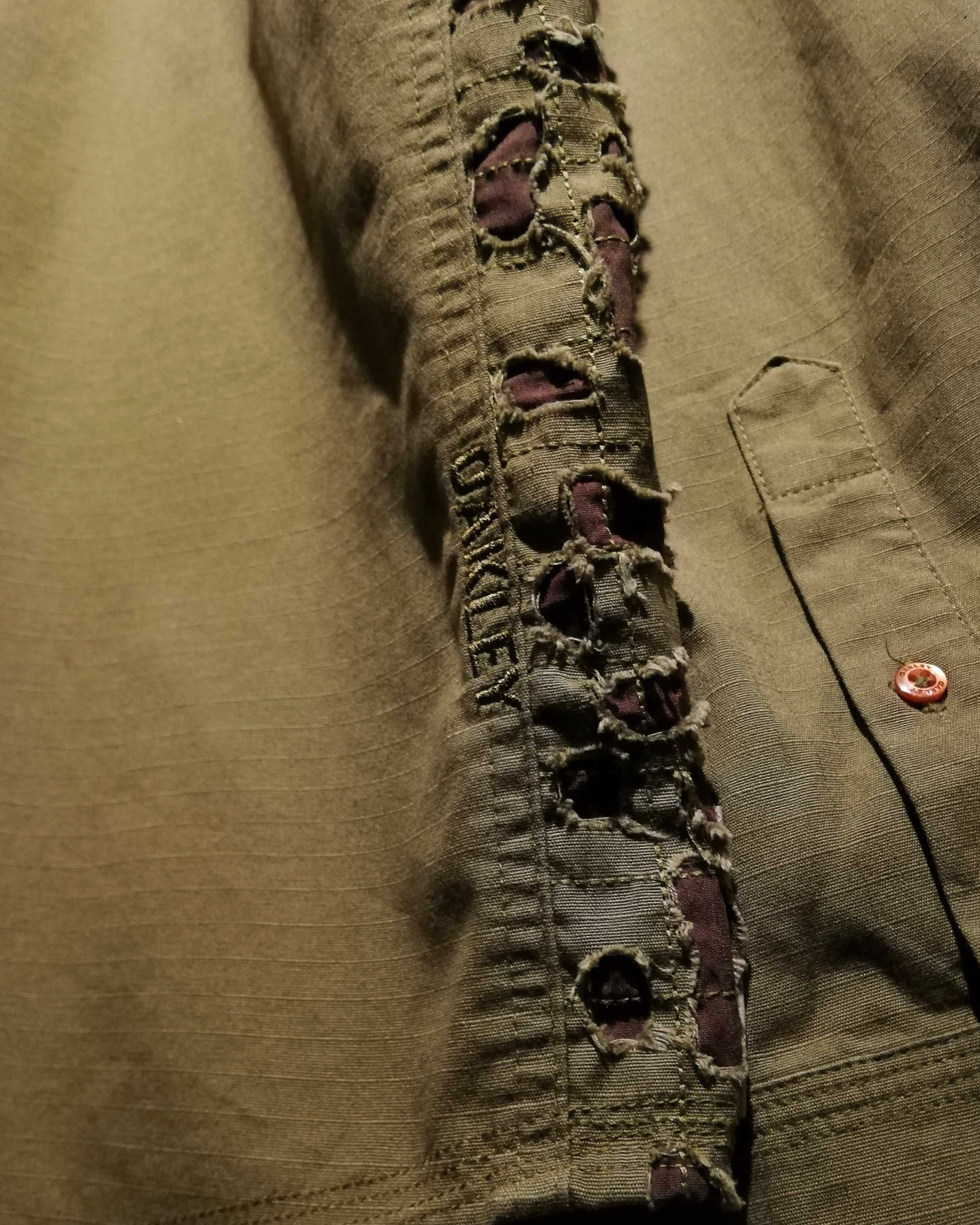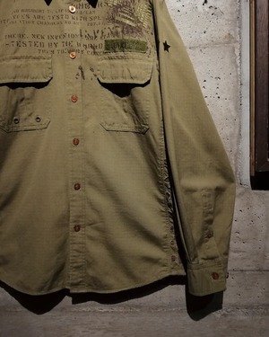 左胸にはロゴ刺繍を刻んだベルクロ、アームには階級を示す星の刺繍とミリタリーな要素に加えて、さらにサイドには大胆なダメージ加工を加えることで退廃的なエッセンスもMixさせたデザインバランスの素晴らしい仕上がり。