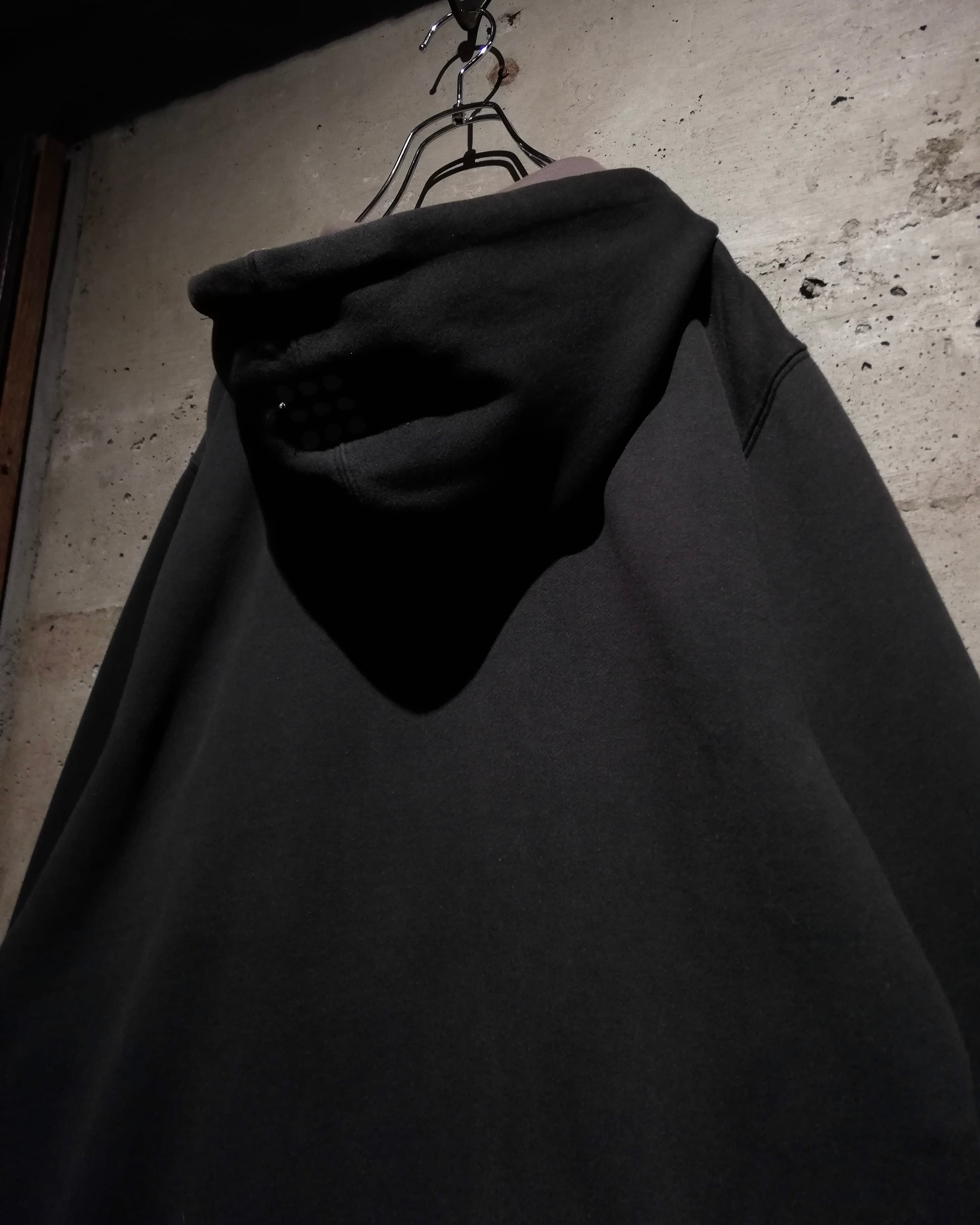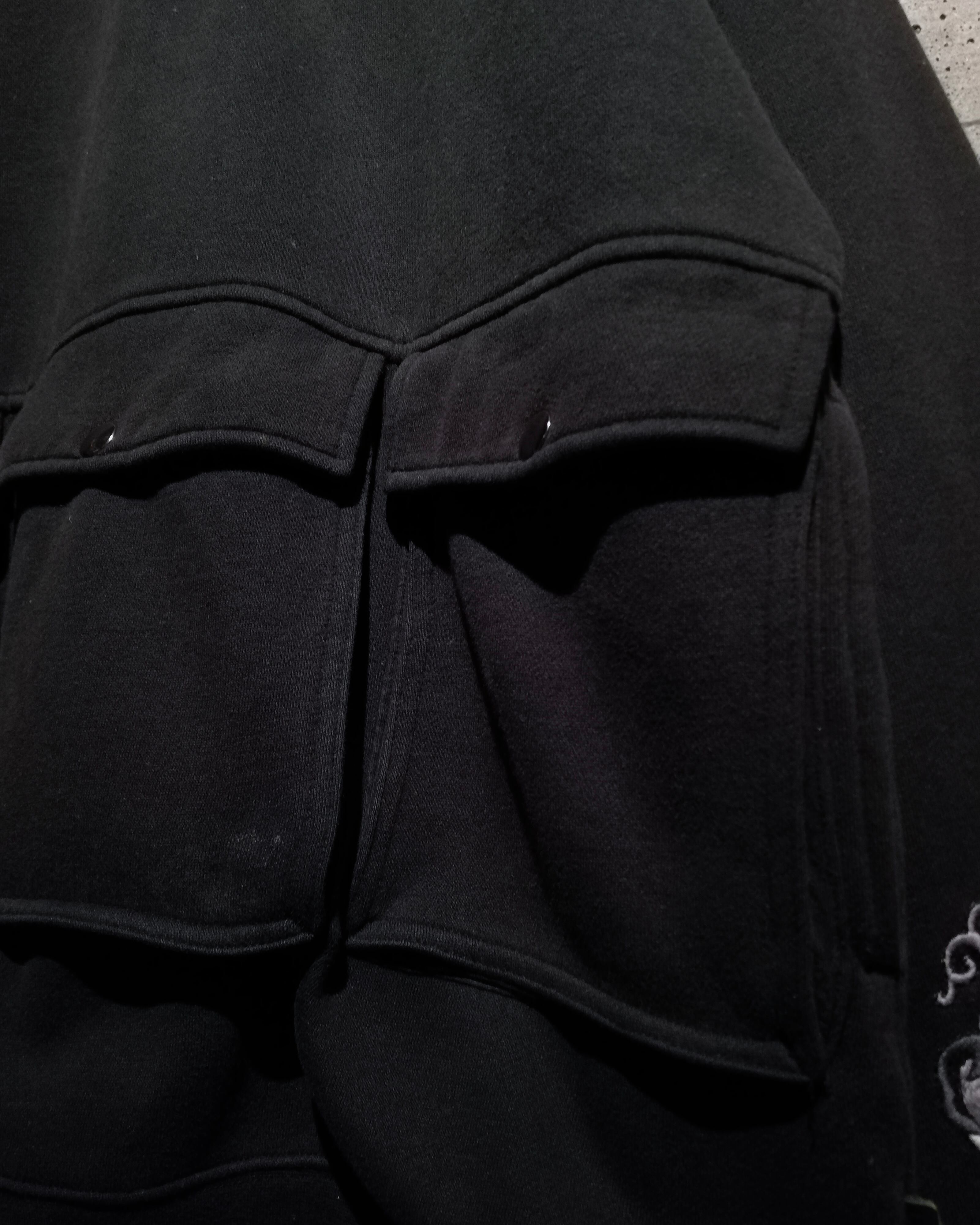 肉感のあるブラックのボディに、フロントには大振りでマチ付きのフラップポケットを3つ配置。アームには龍の刺繍を載せ、エッジィかつオリエンタルなアクセントを加えたした1着。