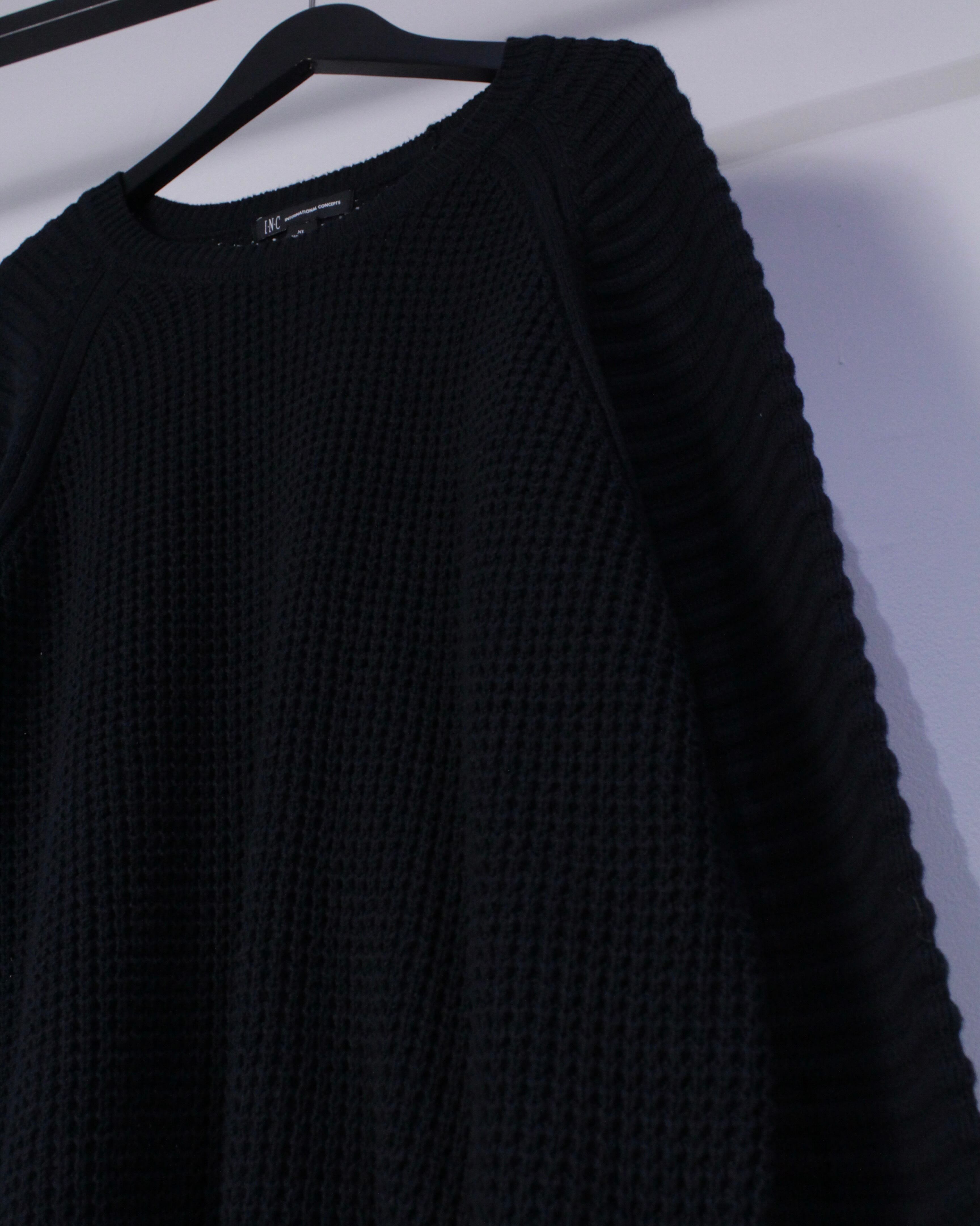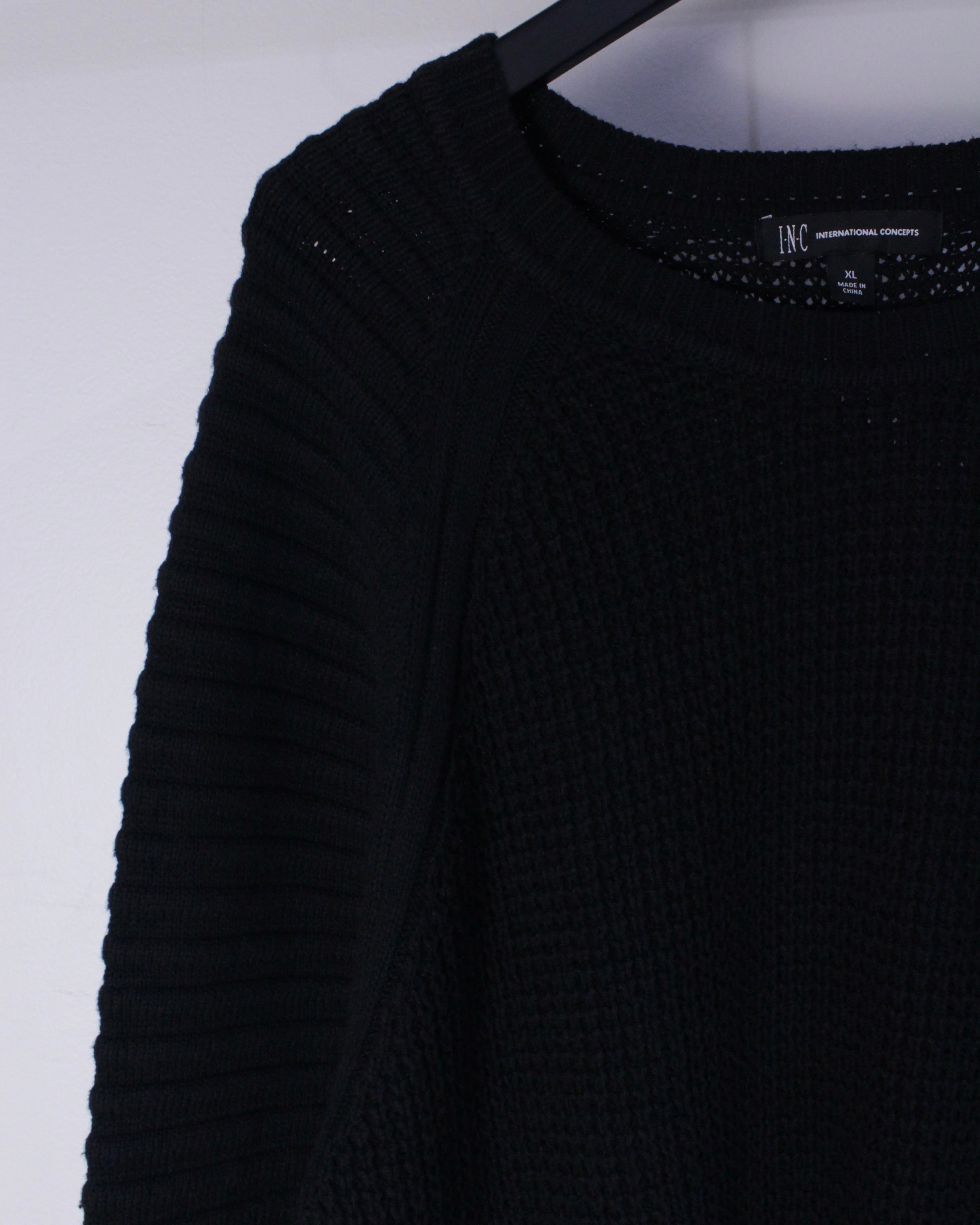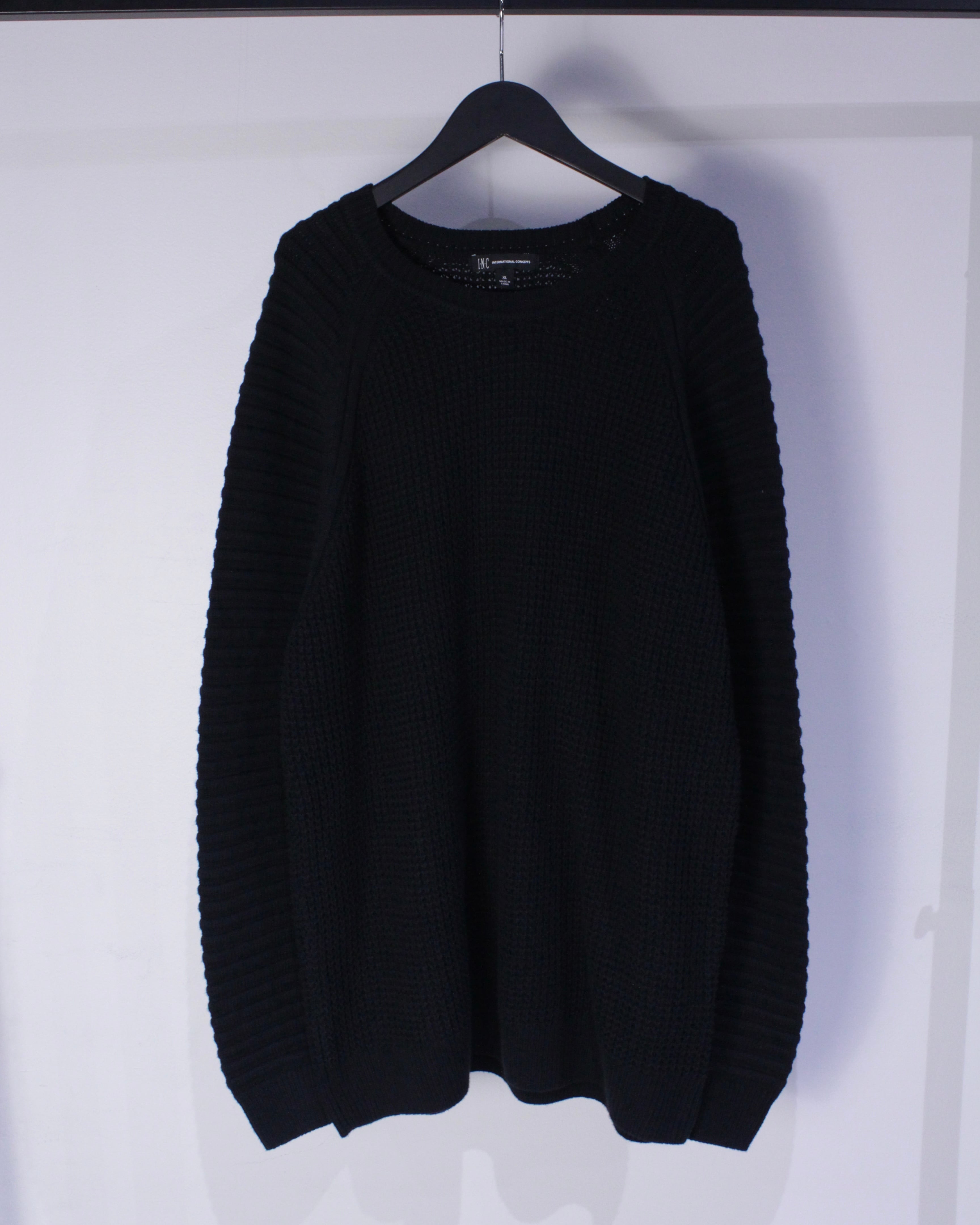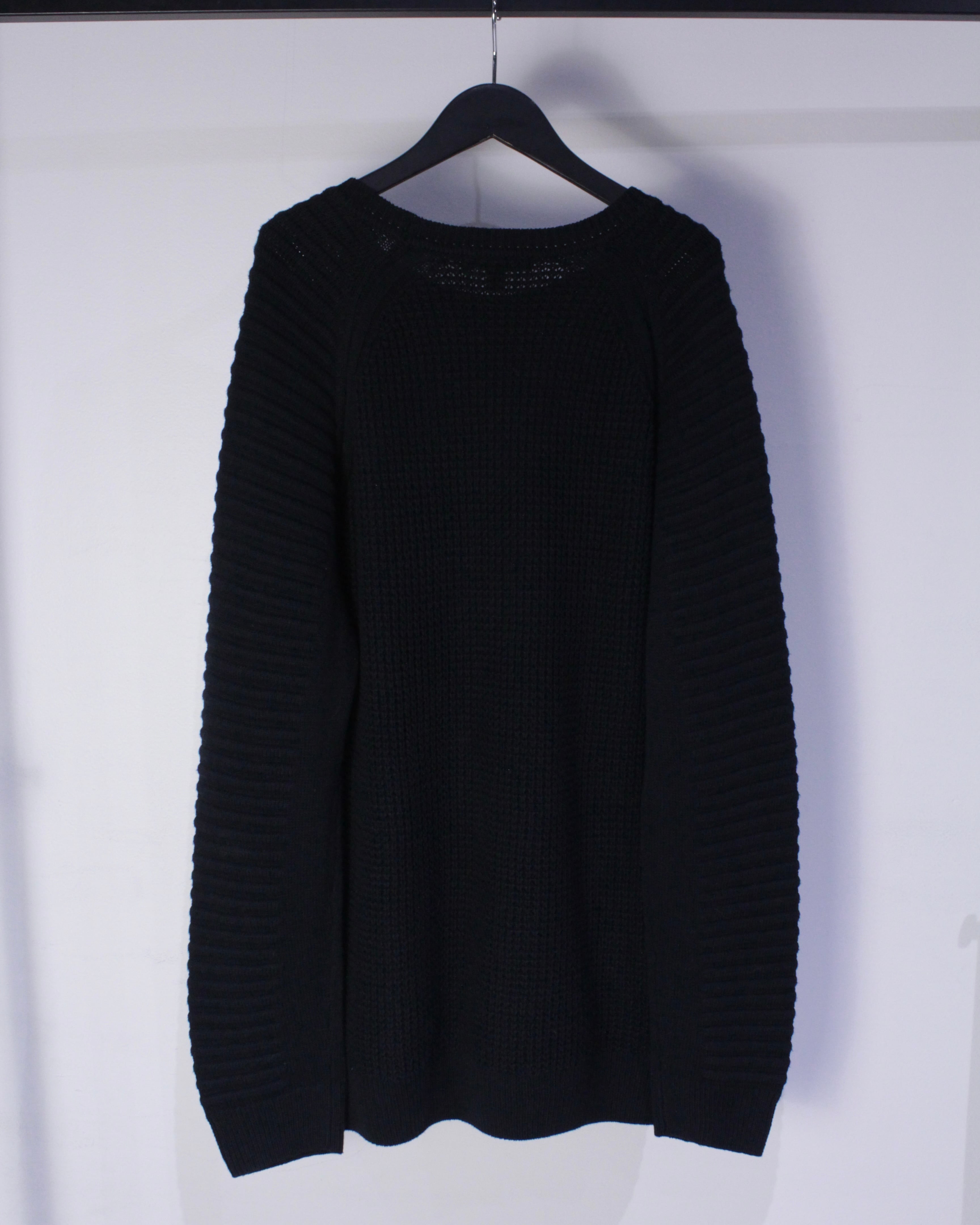 編み地切り替えが醸し出す立体感と、オールブラックならではの重厚感を兼ね備えた、完成度の高いニットです。