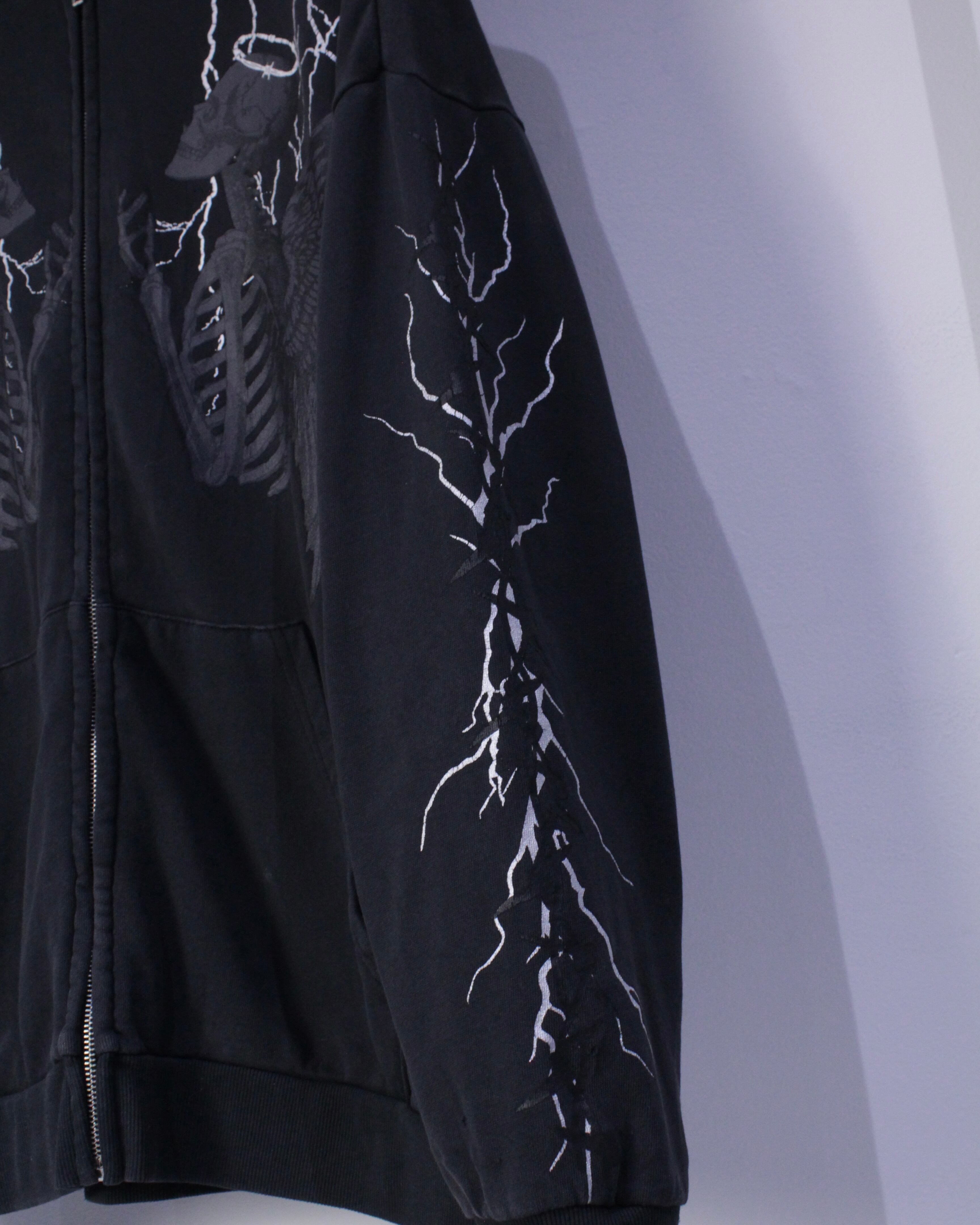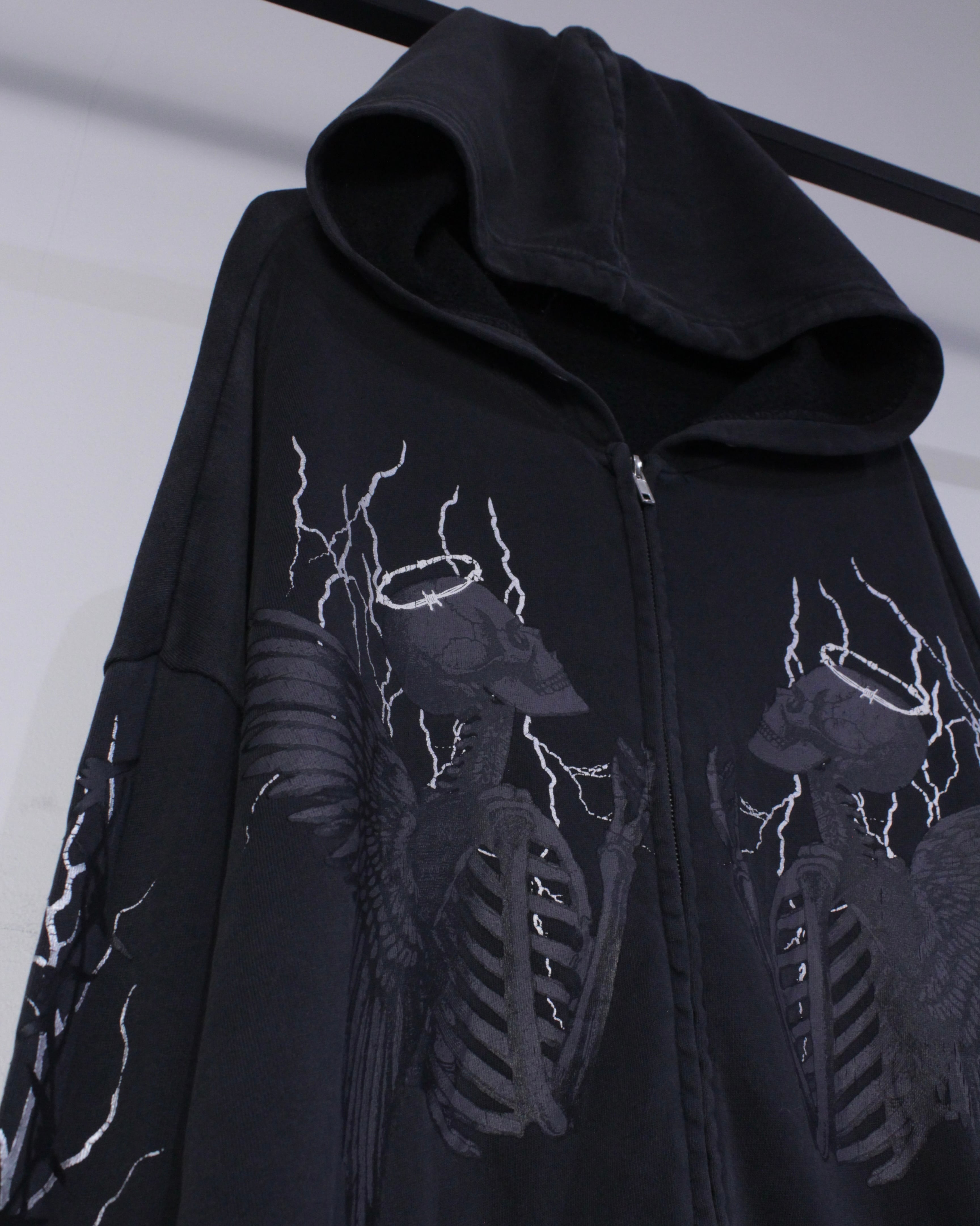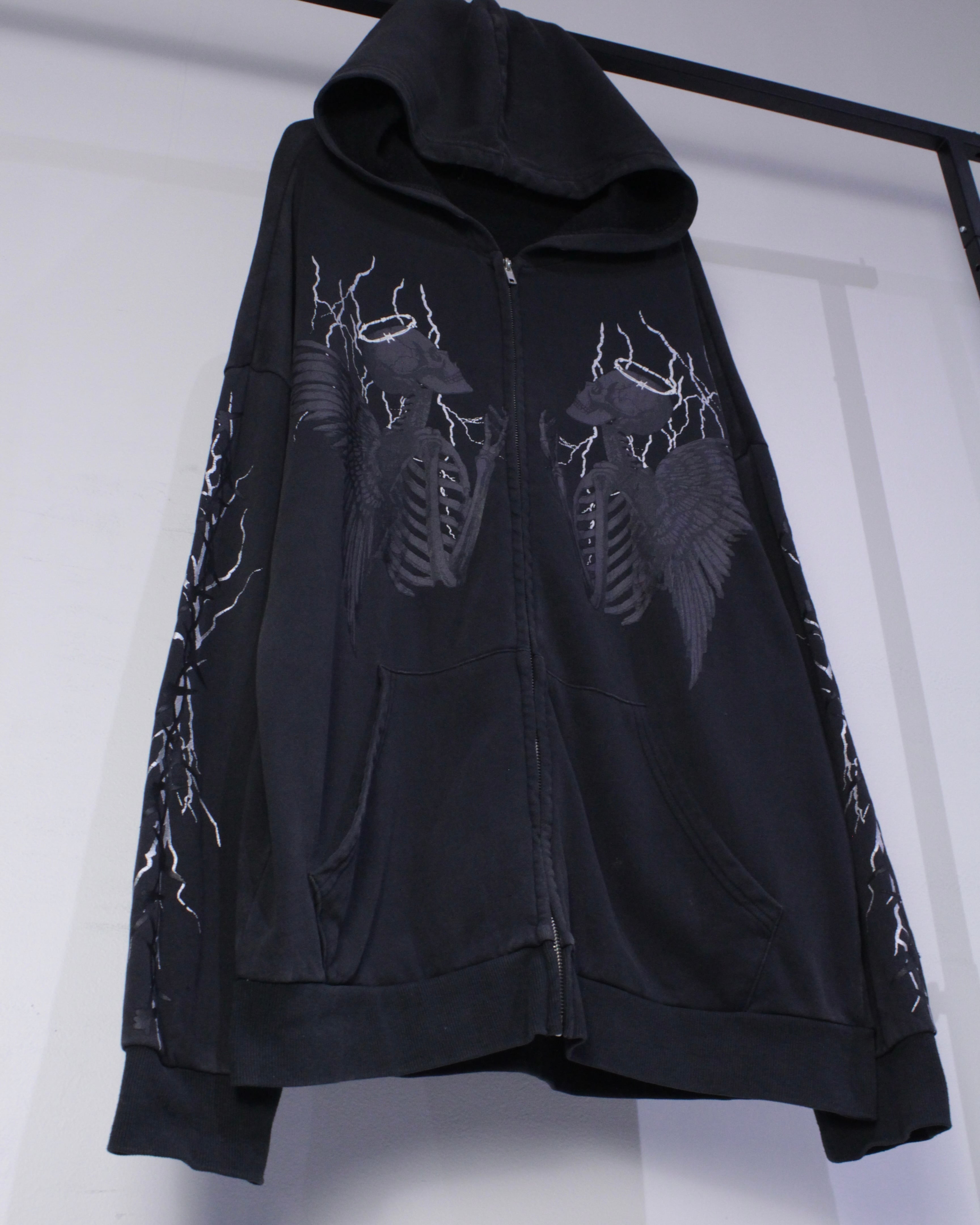 フェード感の良いブラックボディをベースに、フロントには羽を広げた天使のスカルを大胆にプリントで載せたジップアップフーディ。