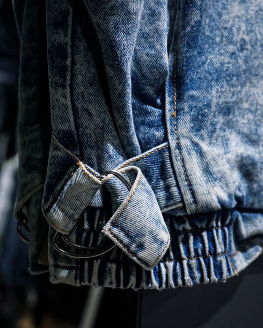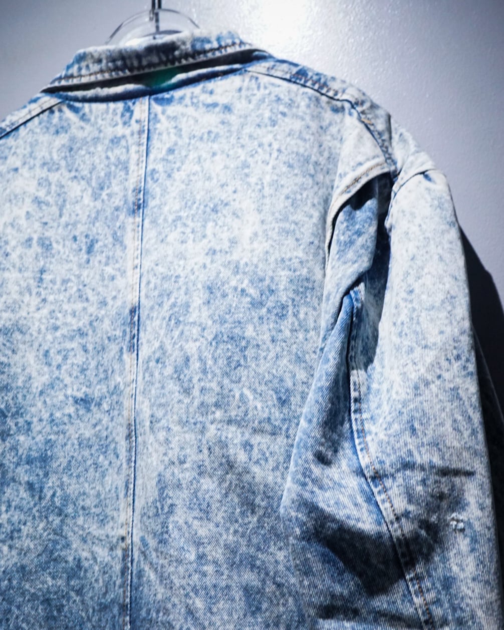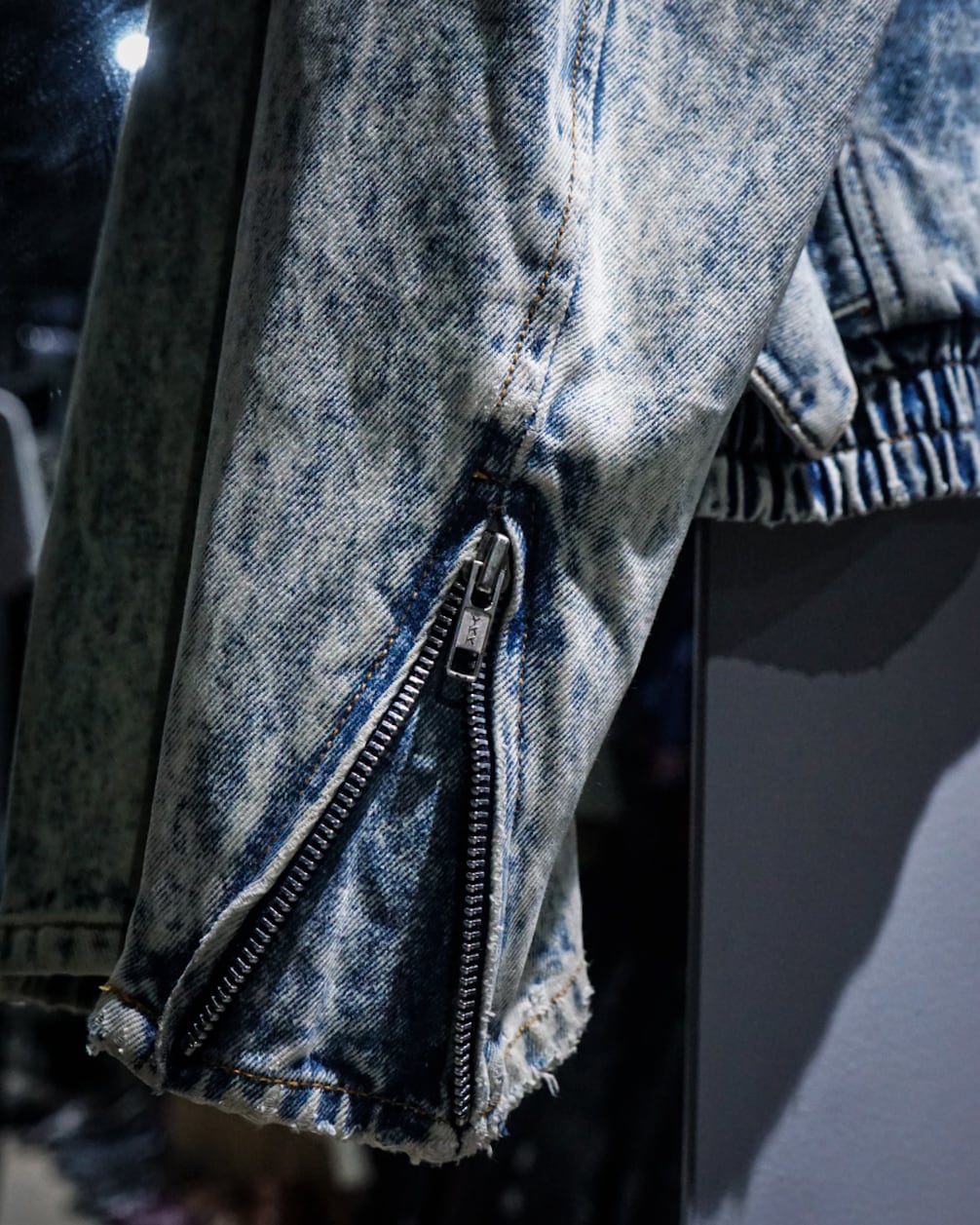 ボディ全体に施されたケミカルウォッシュは、独特の色ムラやフェード感を生み出し、既に使い込まれたかのようなスレ感・ヤレ感を表現。これにより、デニム素材ならではの経年変化とライダース特有の無骨さが絶妙に融合しています。