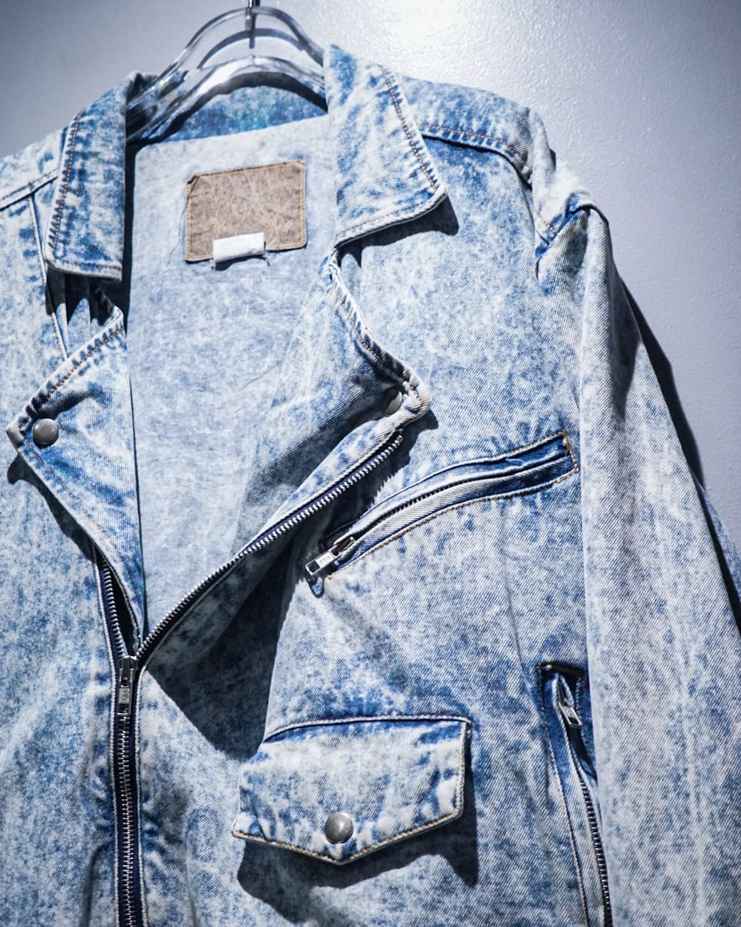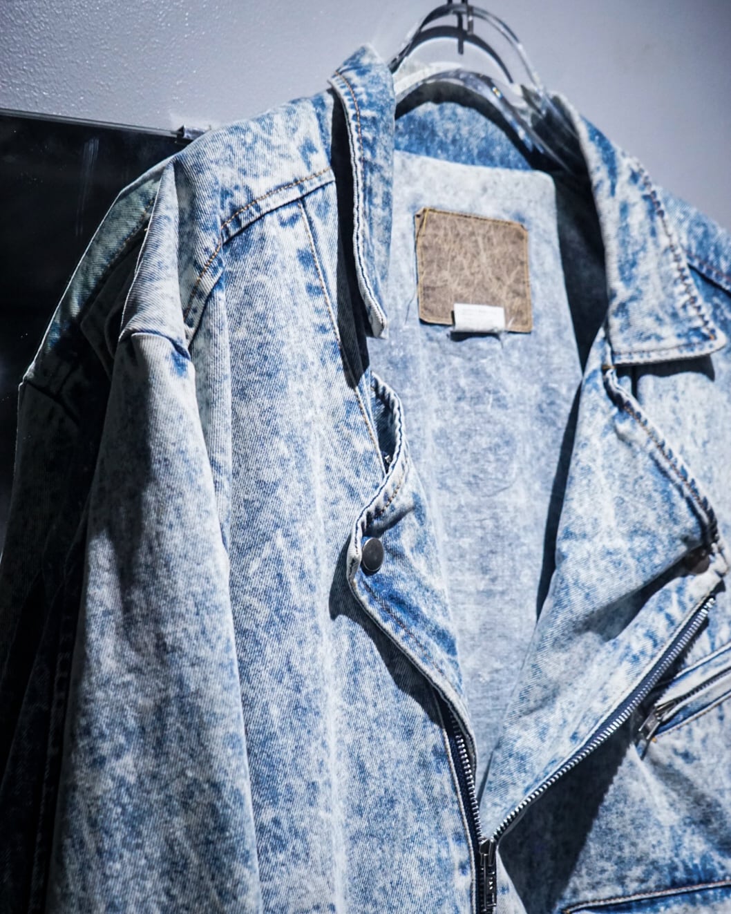 唯一無二の存在感を放つ、ケミカルウォッシュ加工を施したデニムダブルライダースジャケット。