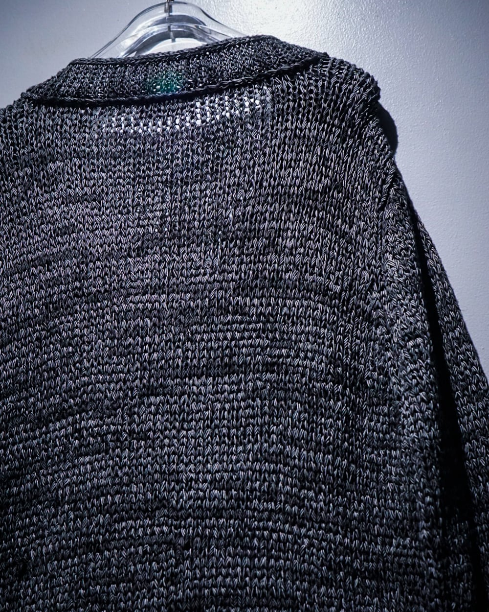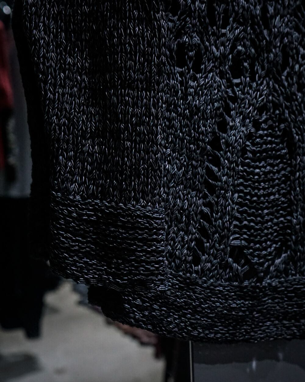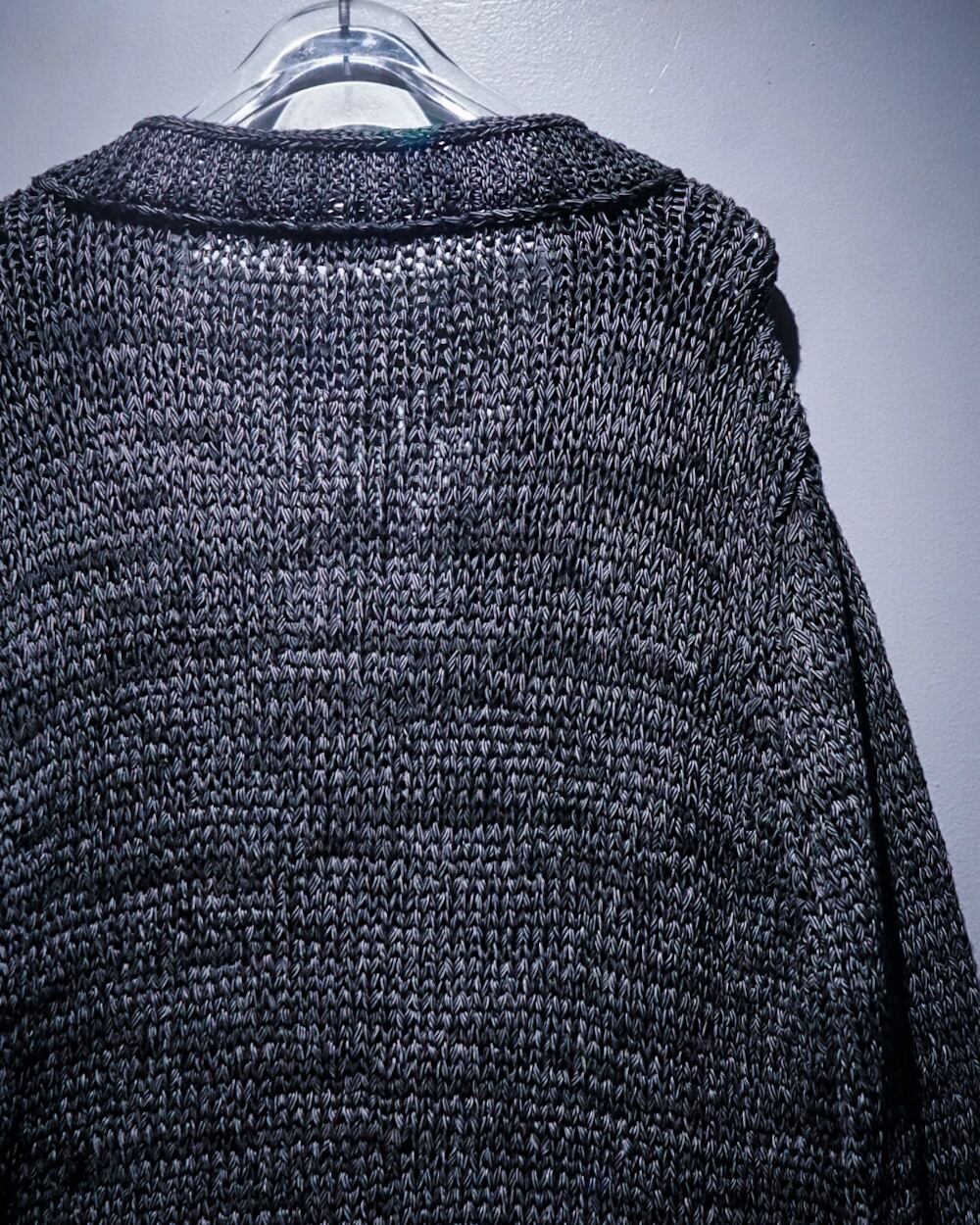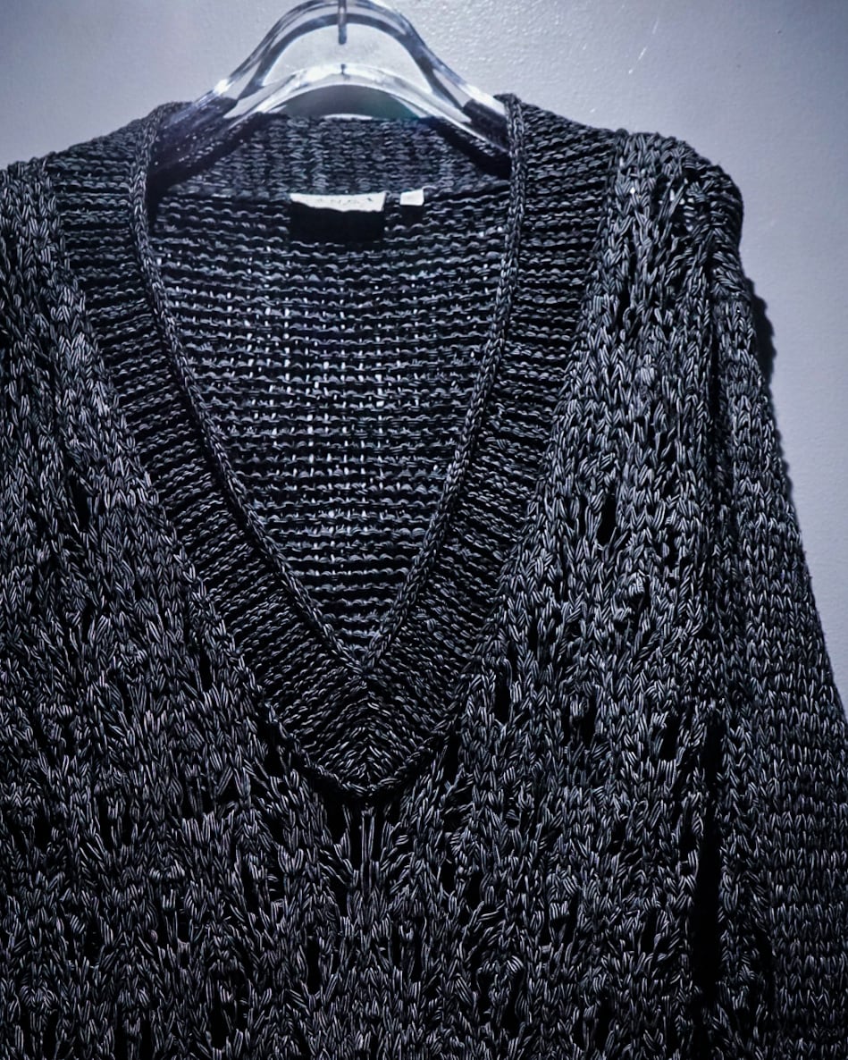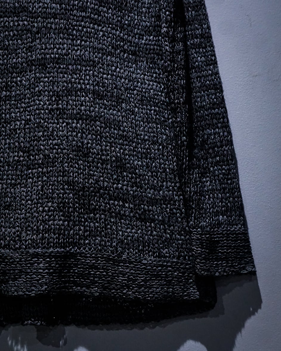 ブラックと白の糸を複雑に編み込んだボディは、部分的に透け感のある編み目がデザインとして組み込まれており、レイヤード次第で様々な表情を楽しめる仕上がり。