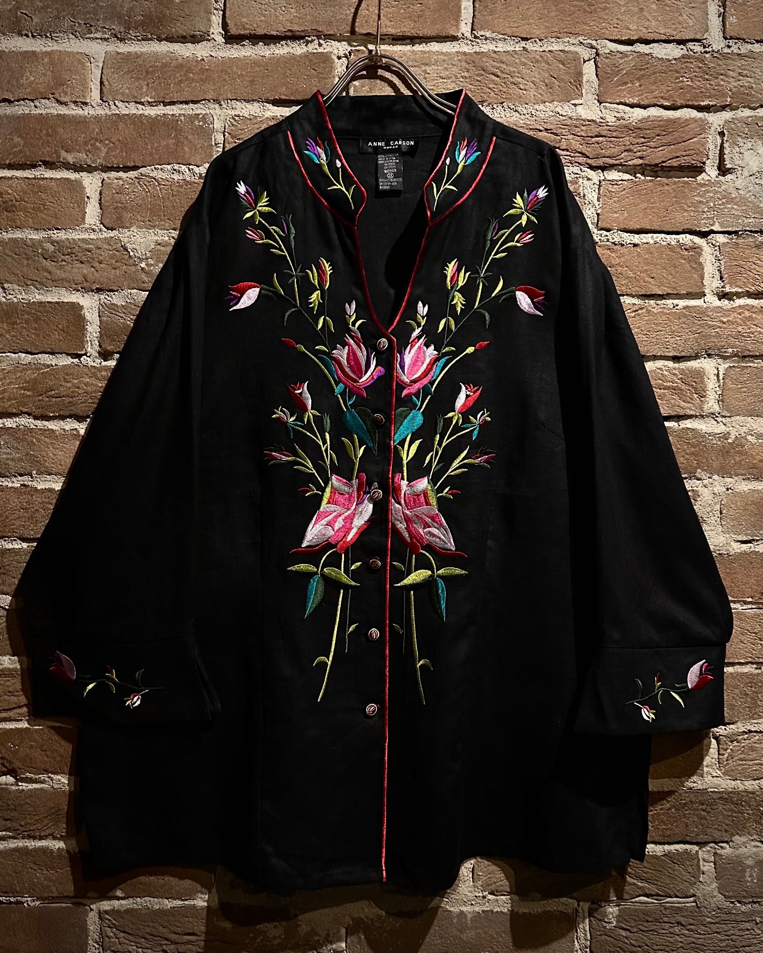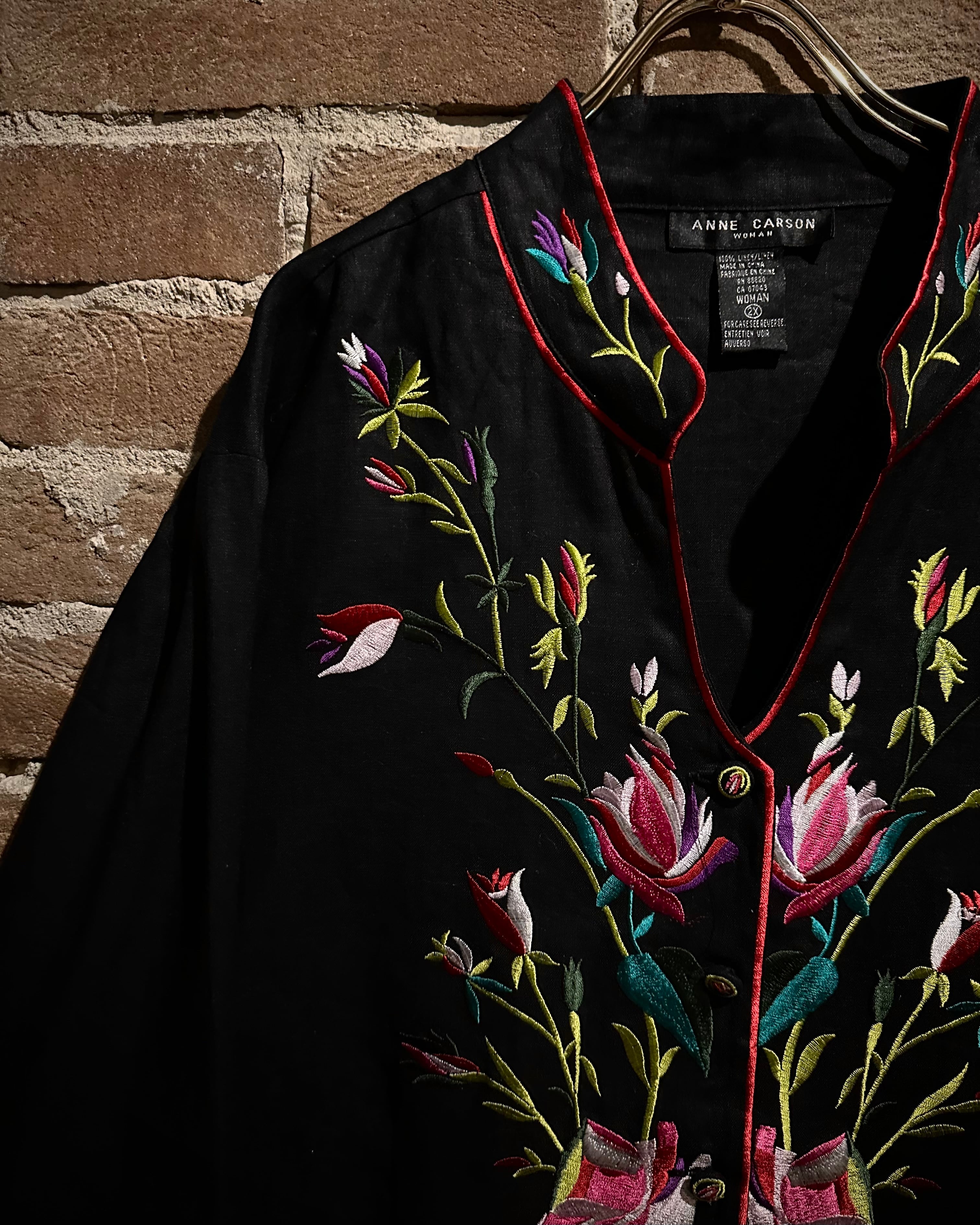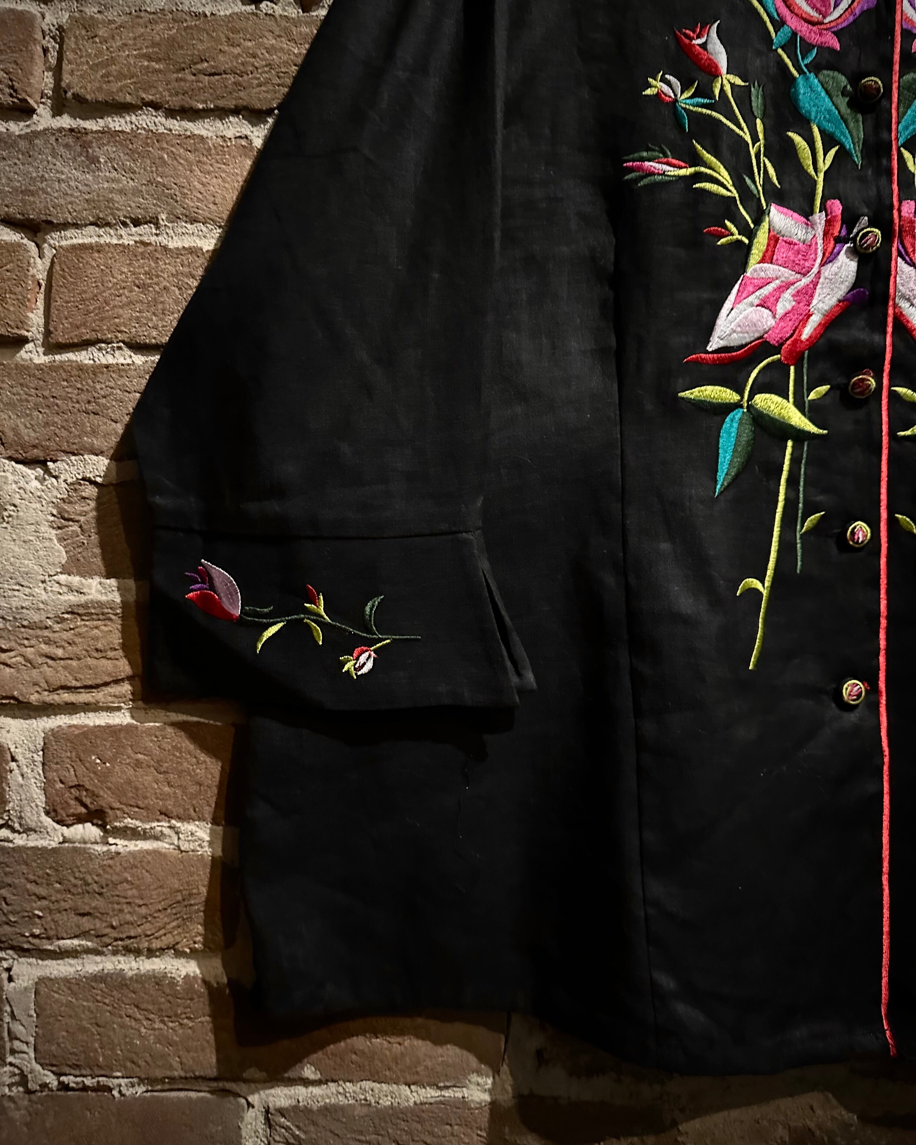 古着業界で稀少性が高まったブラックリネンを贅沢に使用し、フロントに美しい花の刺繍を施したスペシャルなシャツジャケット。