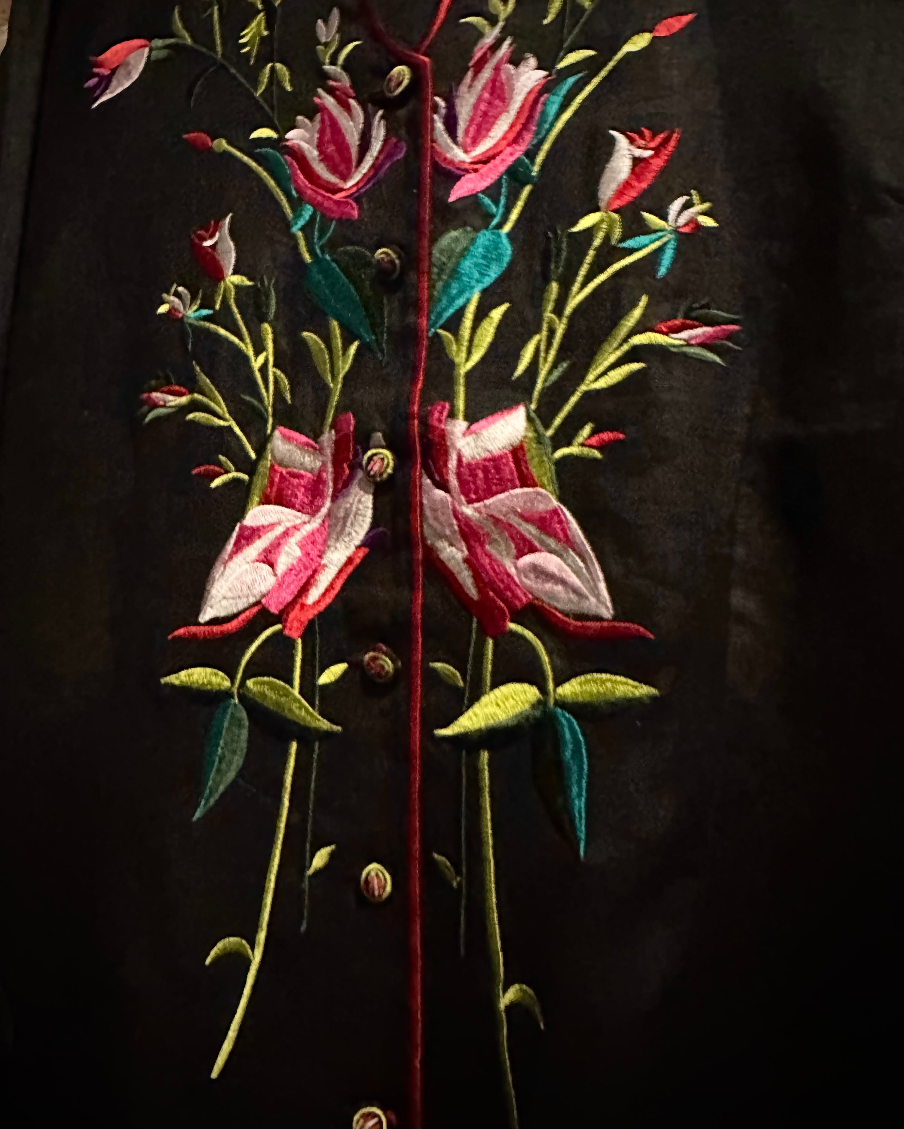 滑らかで上質なリネンボディに、色鮮やかに表現された花の刺繍。赤のパイピングが全体を引き締め、洗練されたラグジュアリーな雰囲気を放ちます。袖口にまで刺繍が施され、細部にまでこだわり抜かれた逸品。