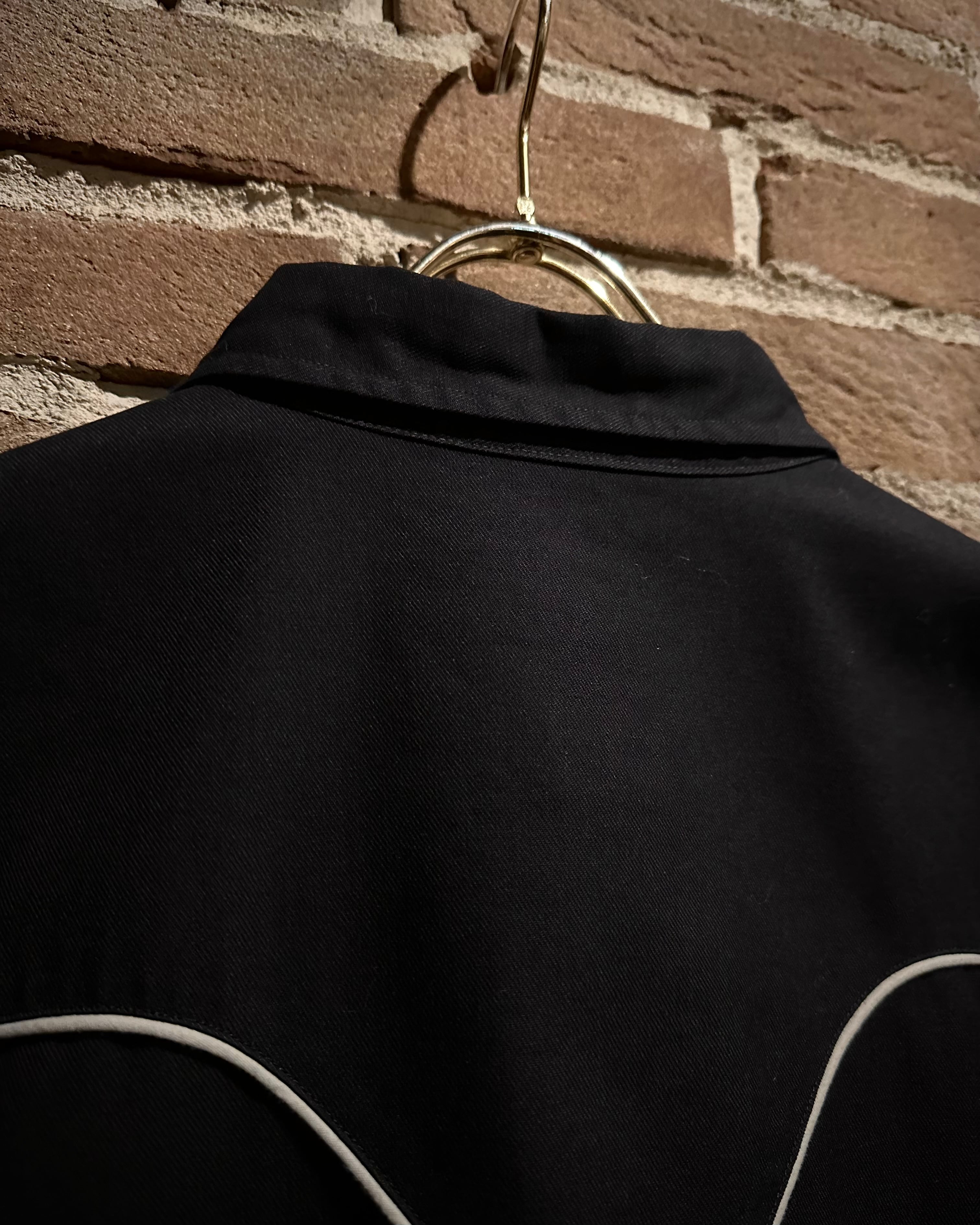 ウエスタンヨークにスナップボタン、パイピング、そして袖口のカフスデザインなど、ウエスタンの王道ディテールをしっかりと踏襲。そこにモノトーンの配色を合わせることで、都会的で洗練された印象を持たせています。