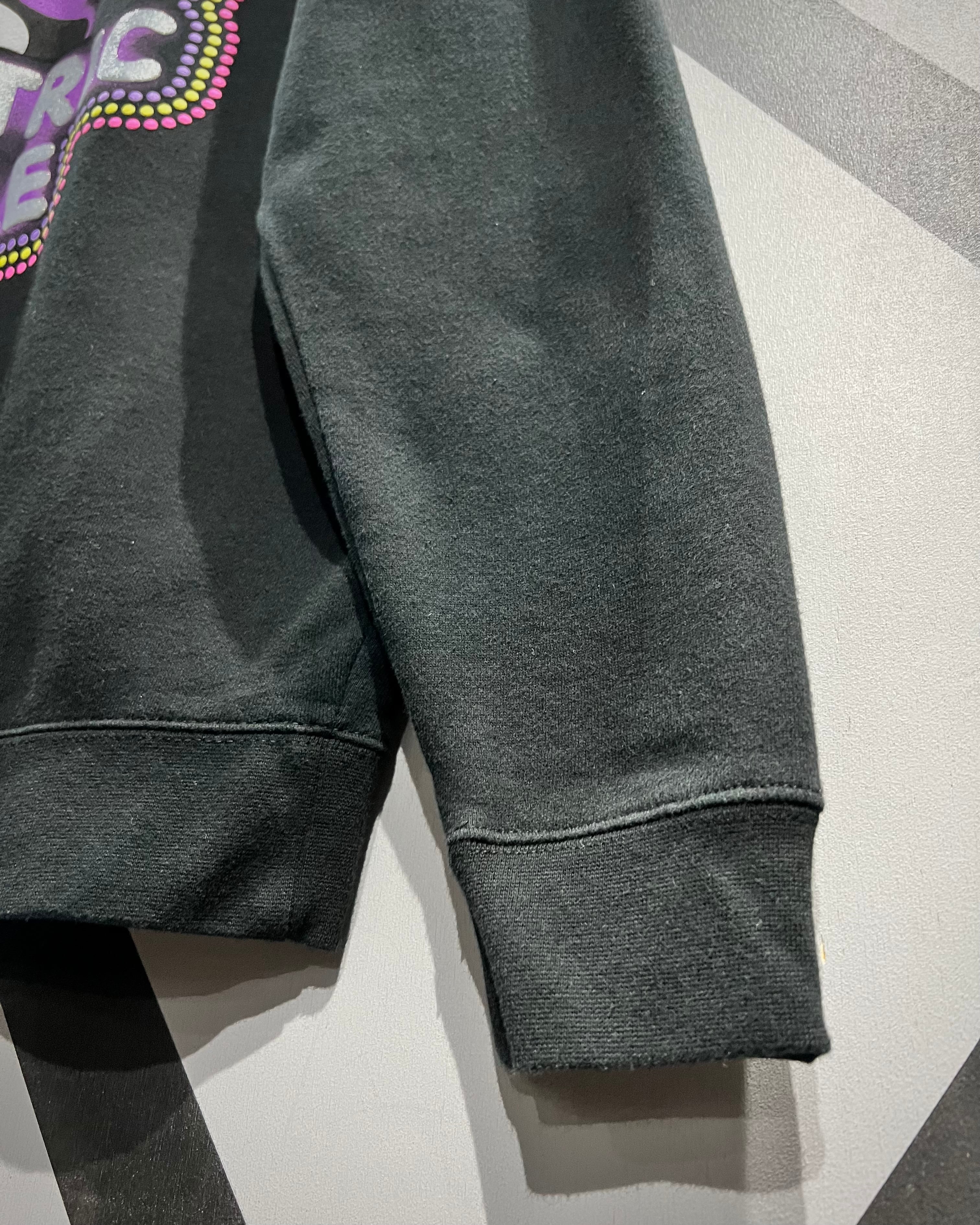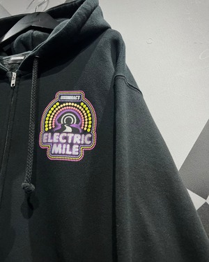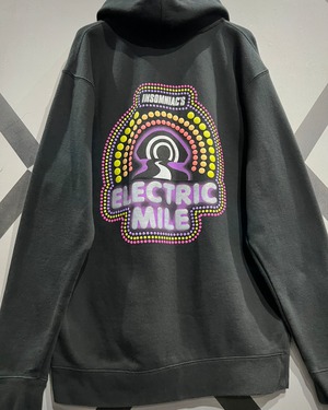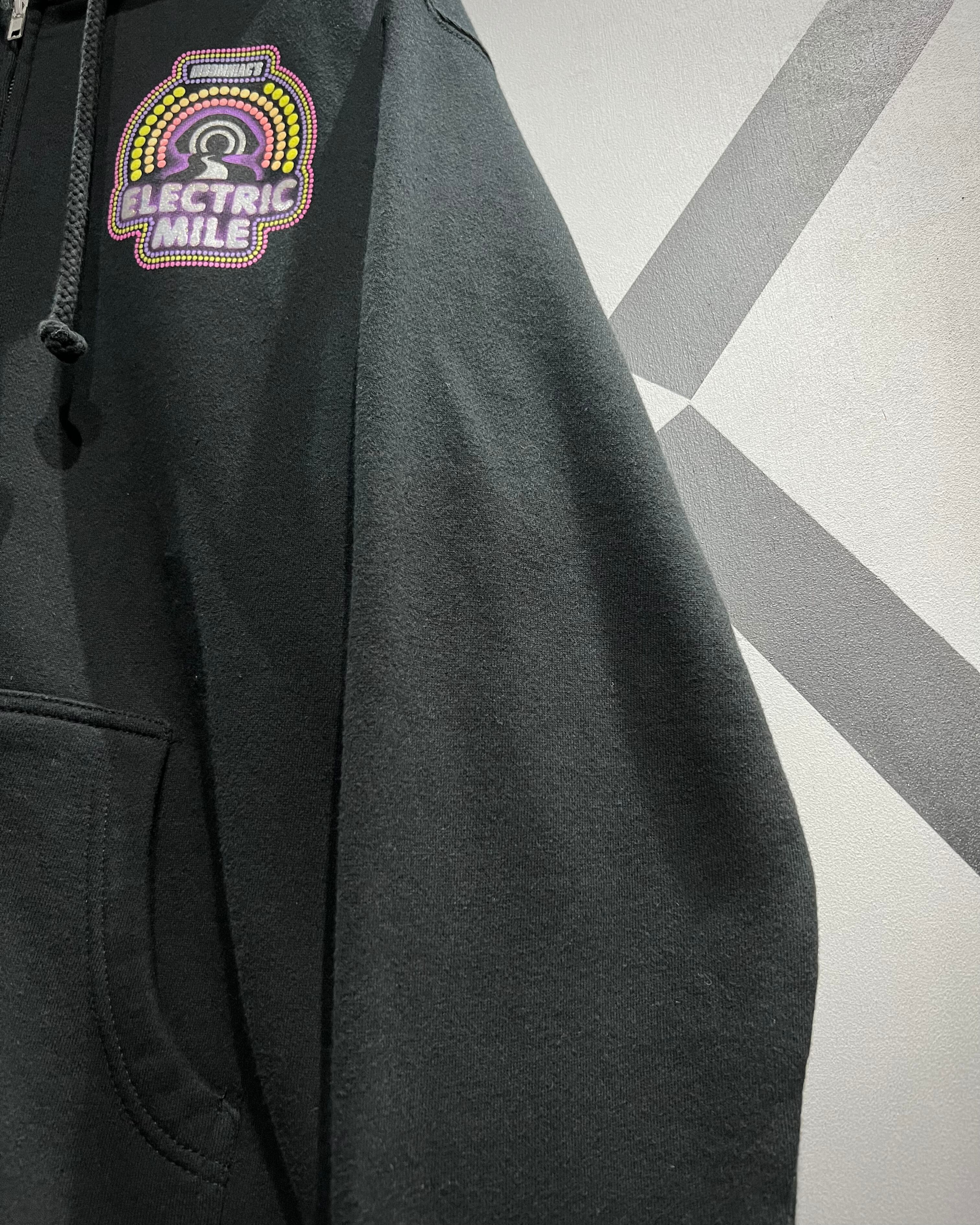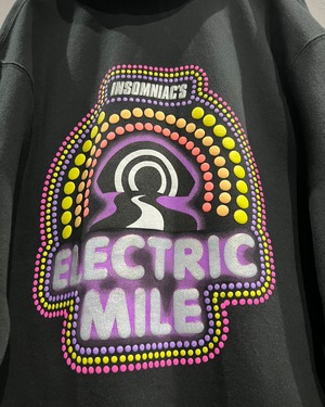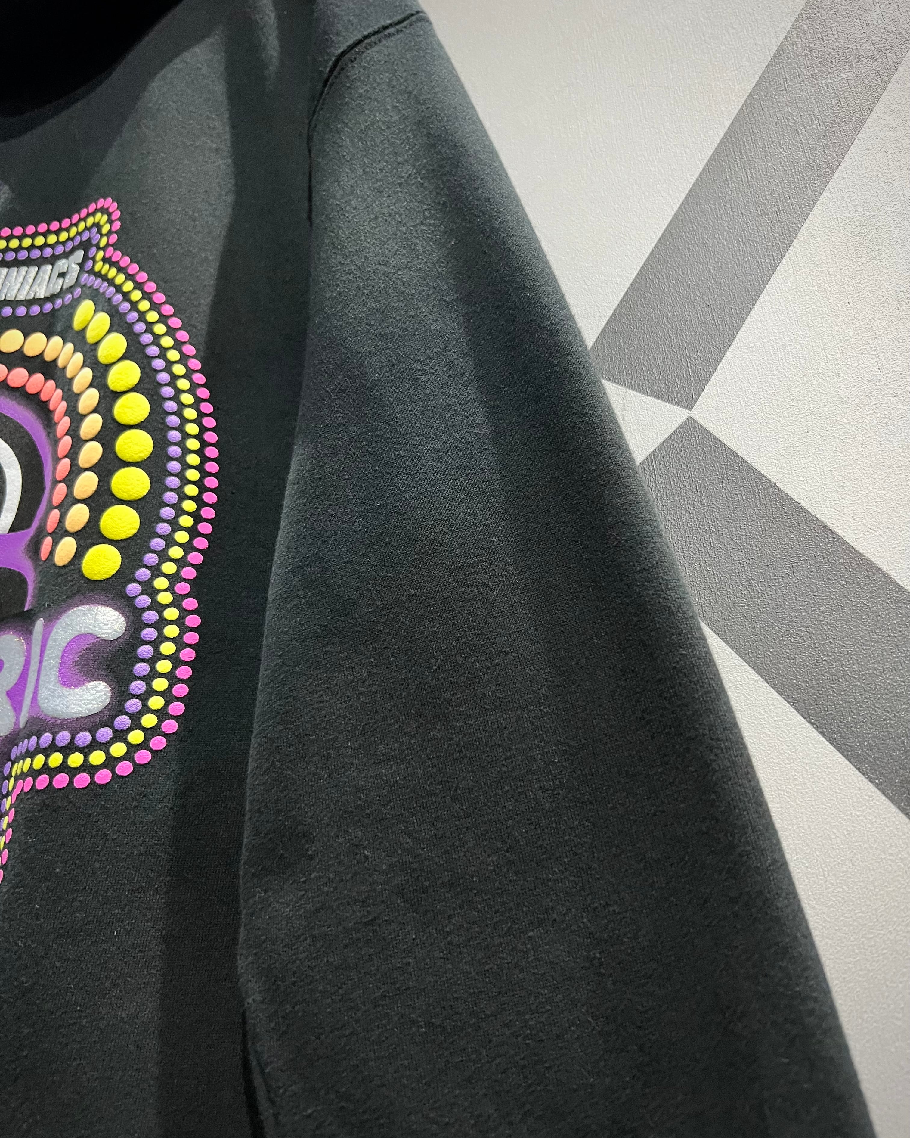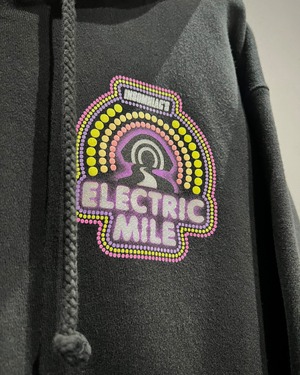 背面に大きくプリントされた「ELECTRIC MILE」のグラフィック。鮮烈なパープルやイエローを基調とした発色の良いカラーリングは、ブラックボディとのコントラストによって存在感を強く放ちます。