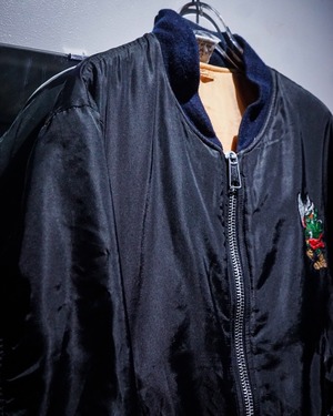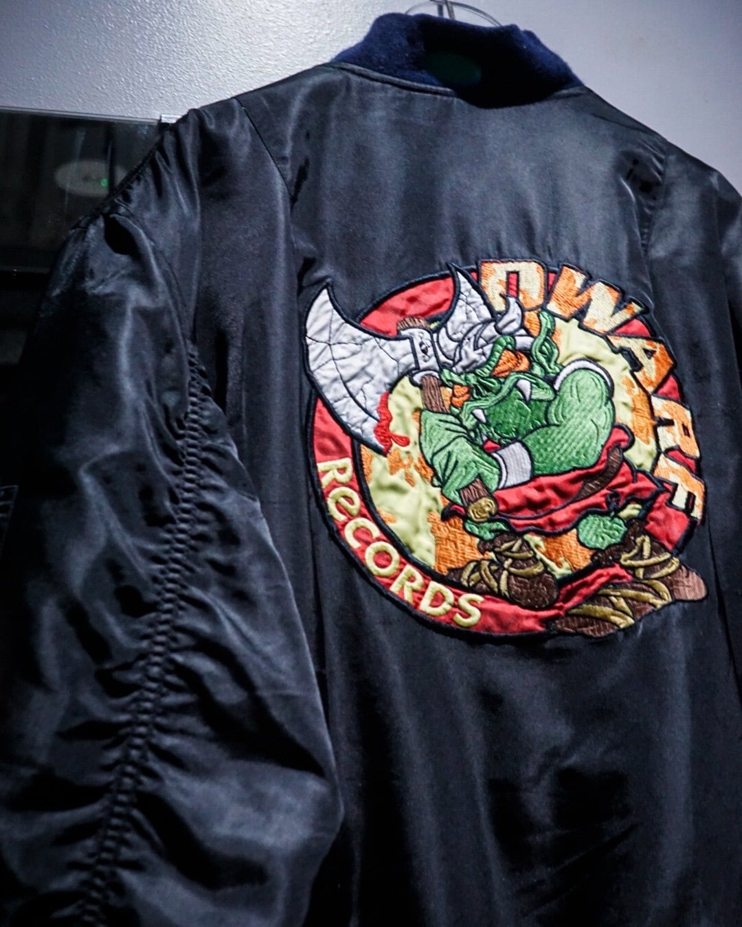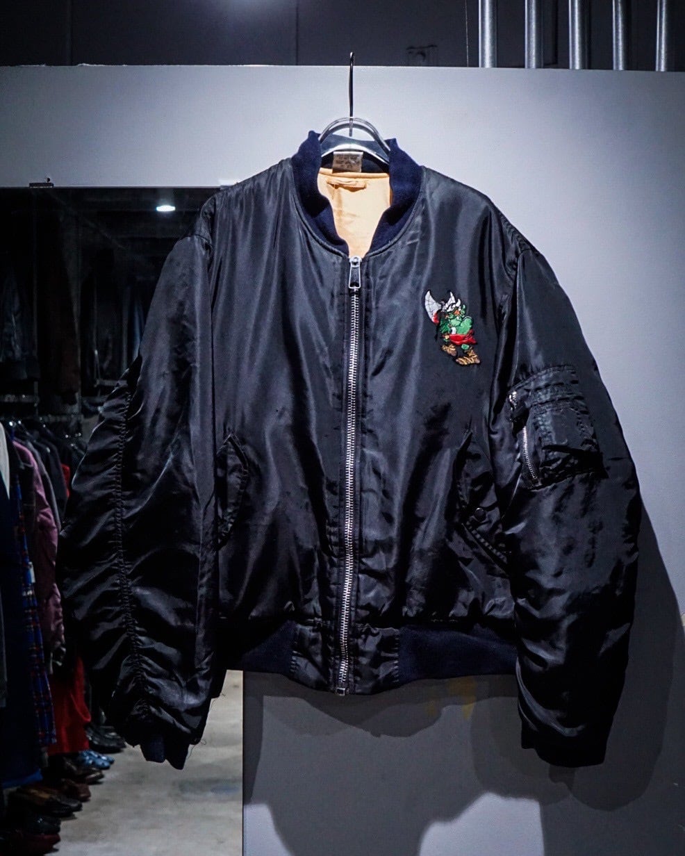 90年代ヨーロッパを中心に広がったアンダーグラウンドカルチャー、ハードコアテクノ/ガバシーン。その熱狂を象徴するレーベル「ID&T」や「DWARF RECORDS」の刺繍を背面に大きく配した、圧倒的存在感を誇るボンバージャケットをご紹介いたします。