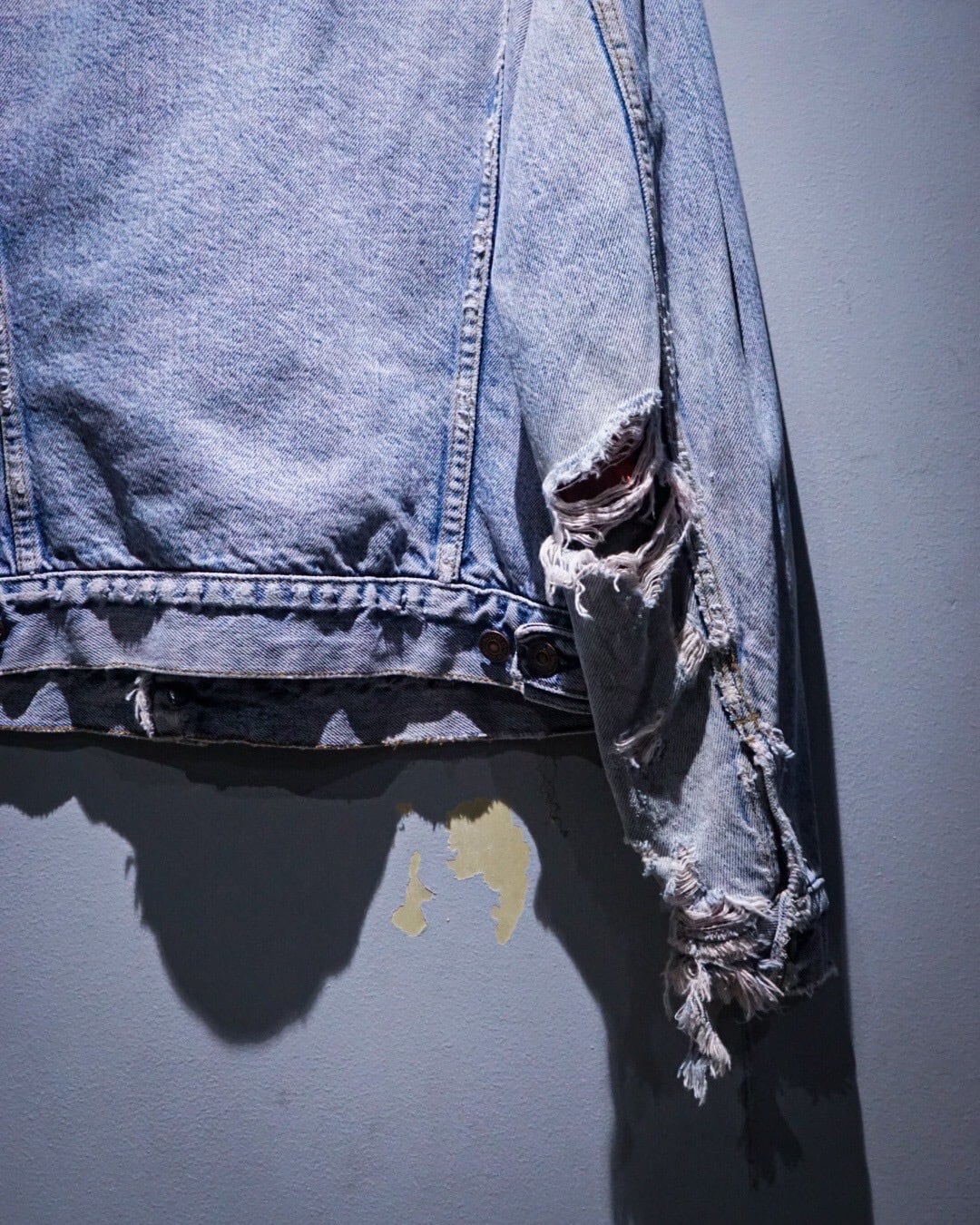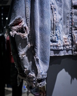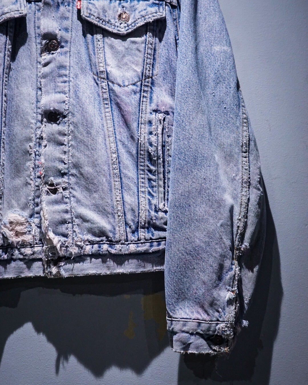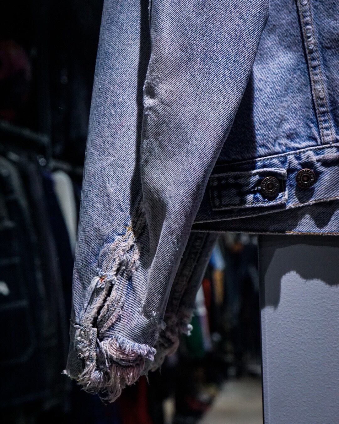 スモールeタブやボタン裏の「527」刻印といったディテールも時代性を物語るポイント。さらに最大の魅力はそのコンディション。袖やボディに至るまで徹底的に着込まれ、フェード・ダメージ・リペア跡が混ざり合った姿は、まさに「経年変化のその先」。作ろうと思って作れる雰囲気ではなく、長い年月を経たからこそ生まれた唯一無二の表情です。