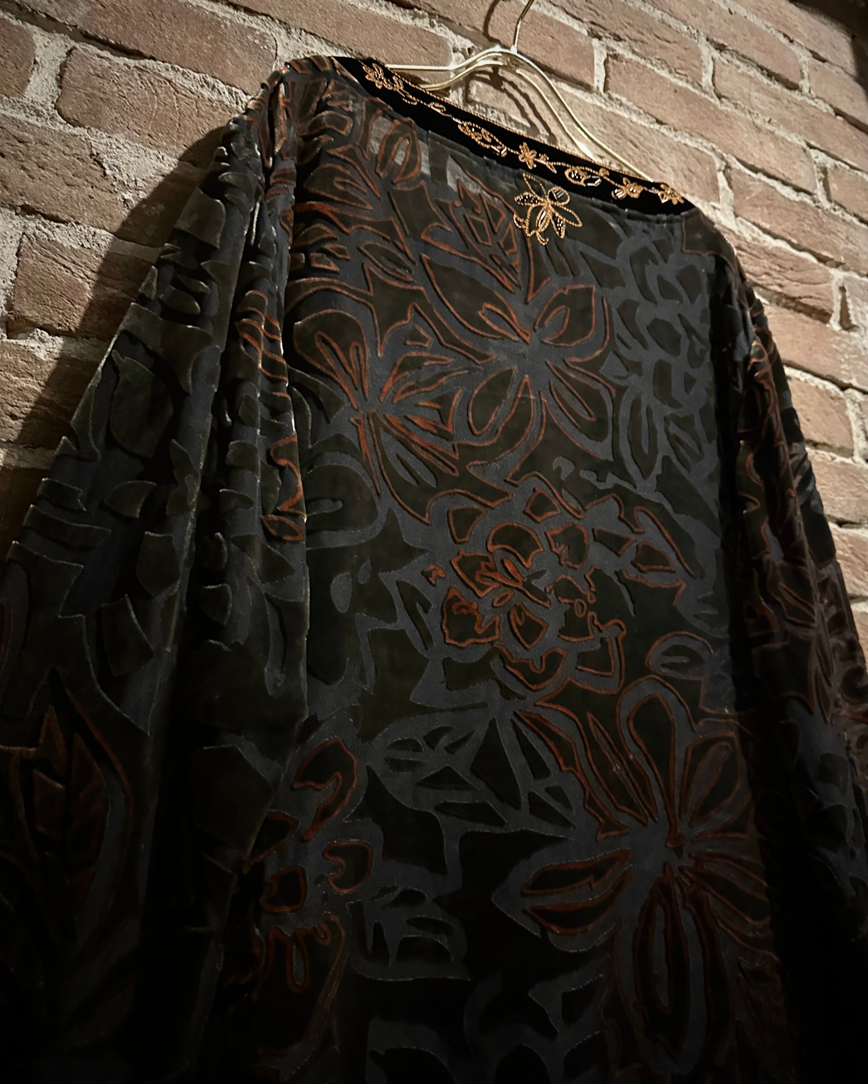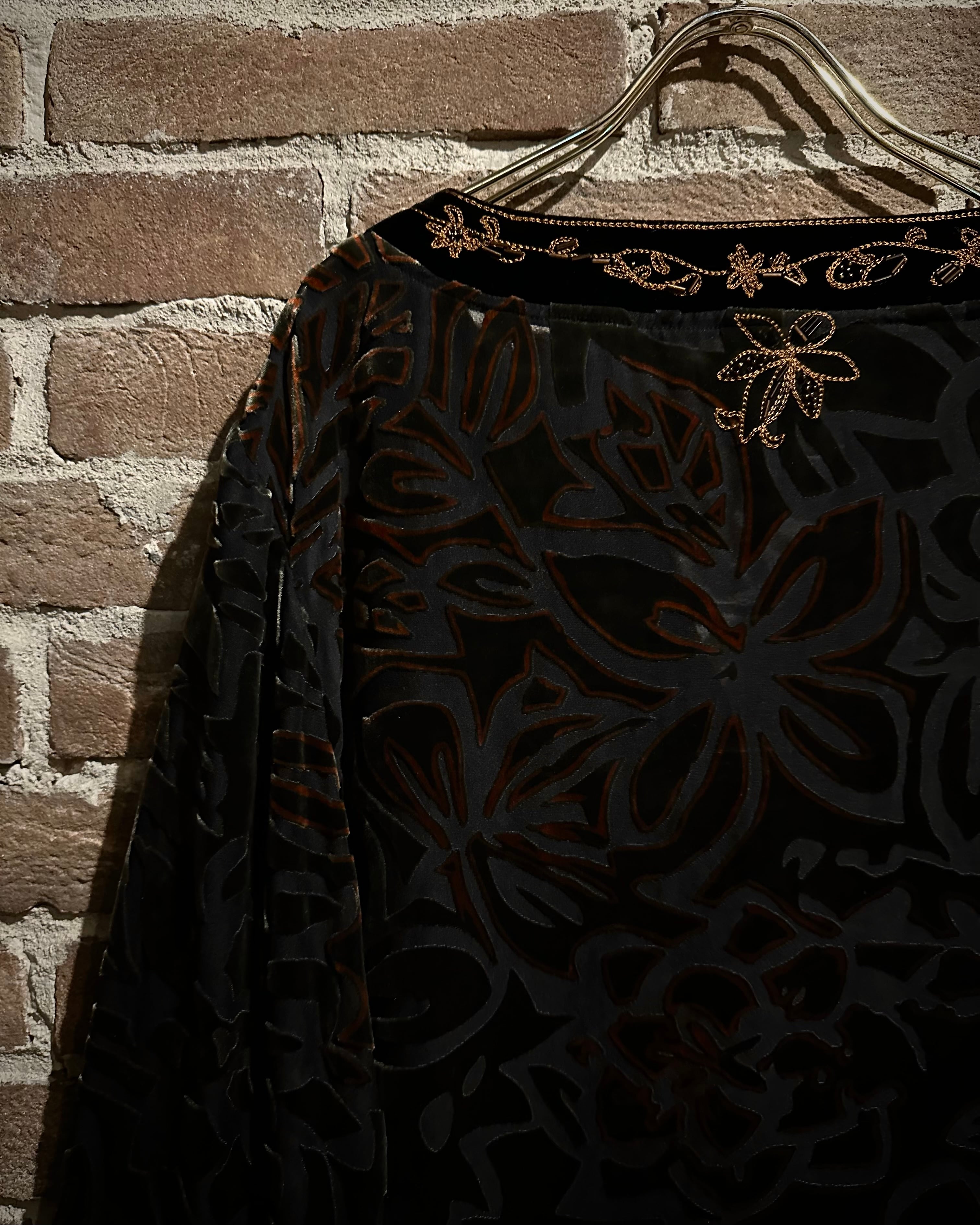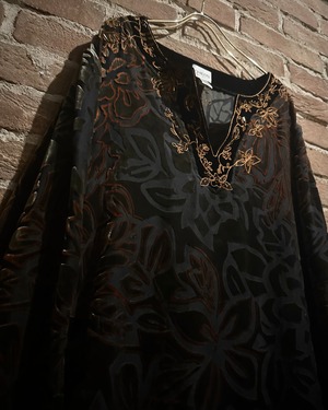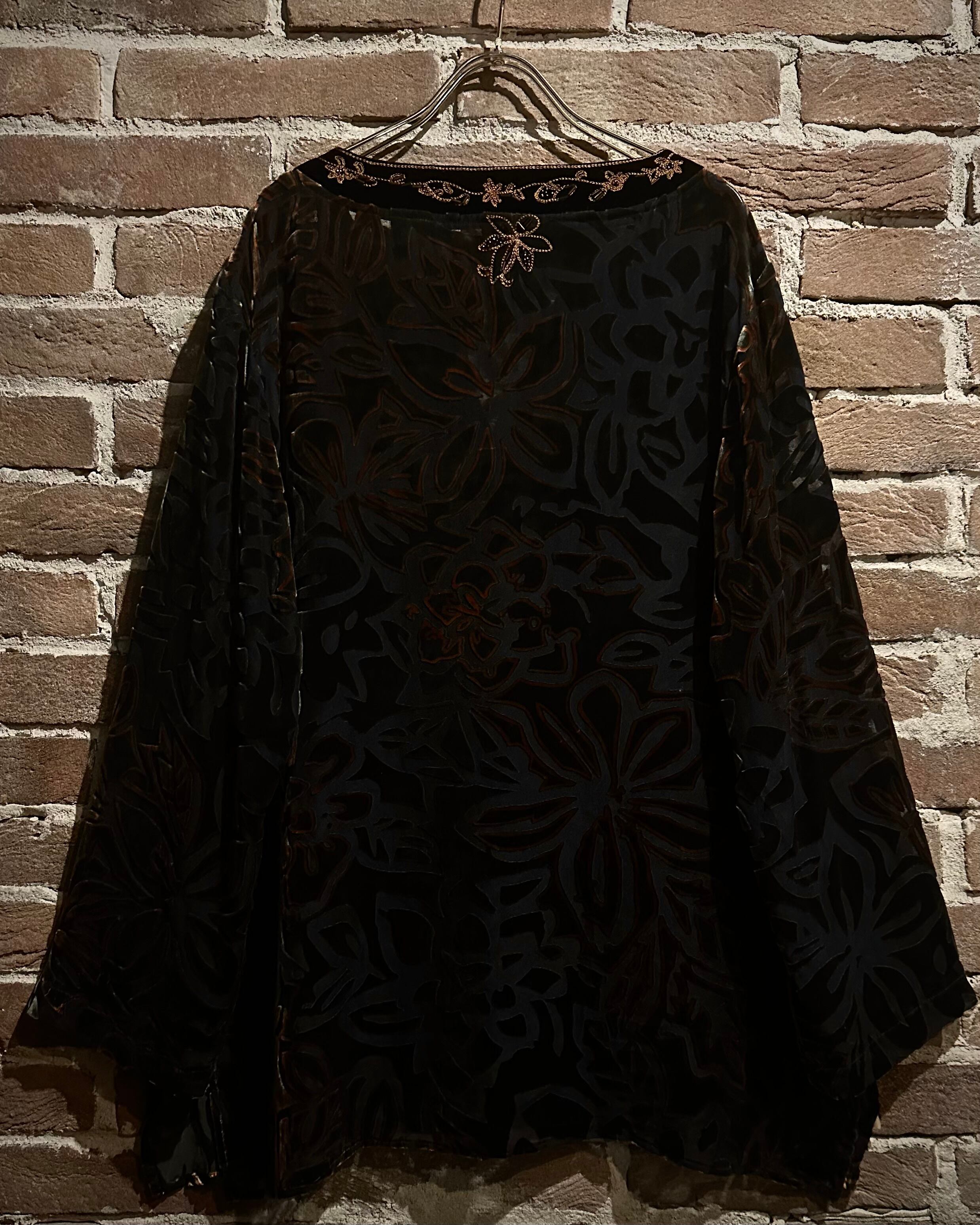 ブラックシアーのボディに、グラデーションがかったフロッキープリントで花柄を載せたスキッパーシャツ。