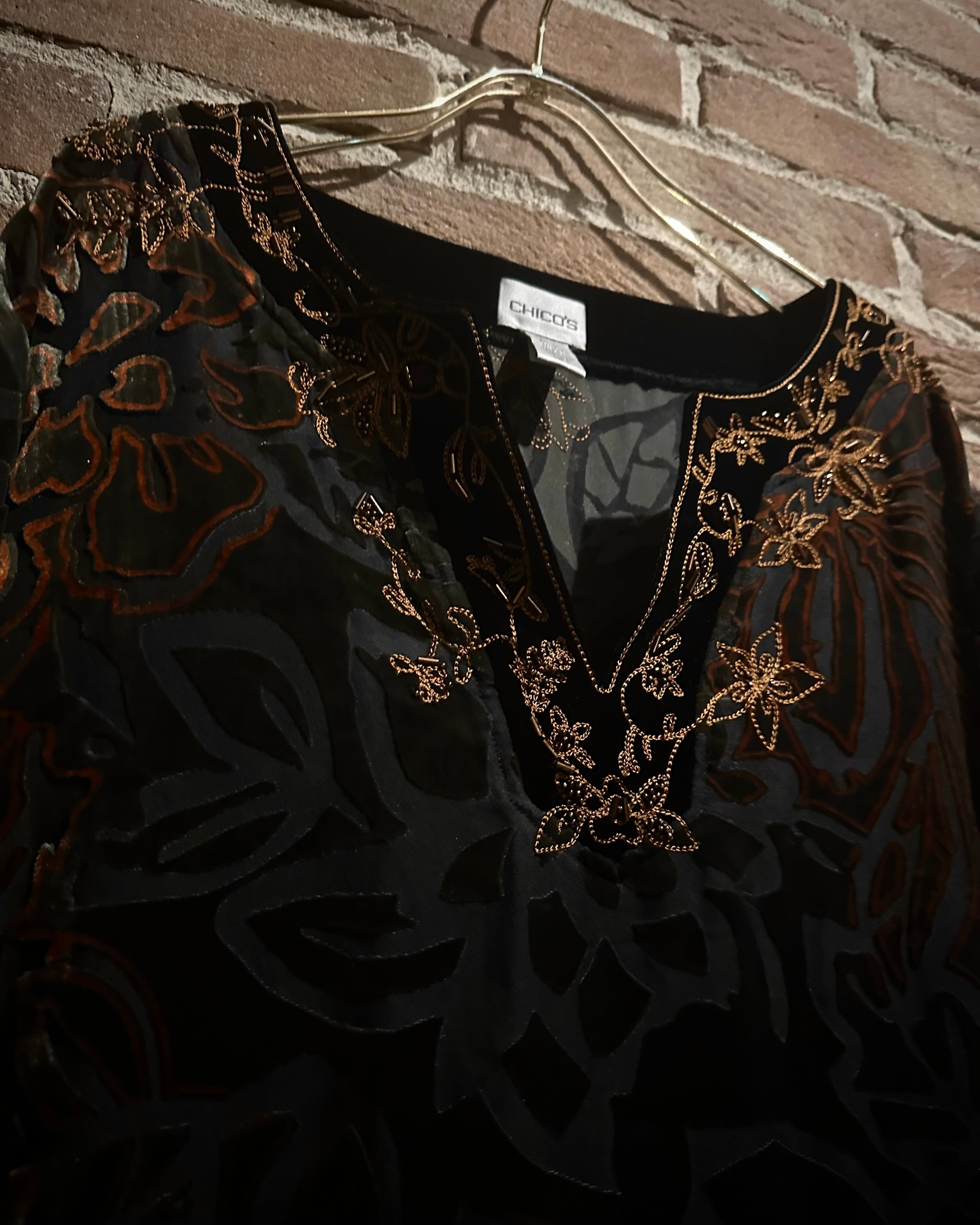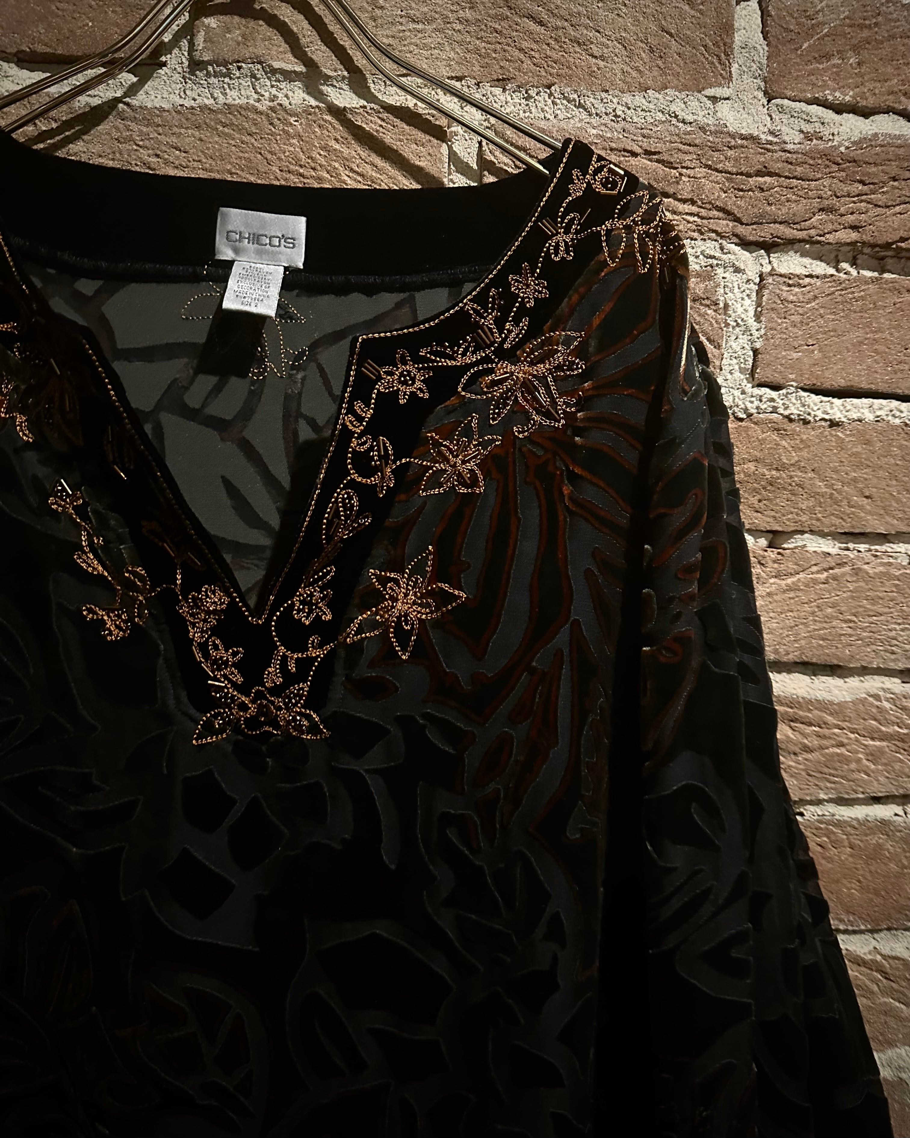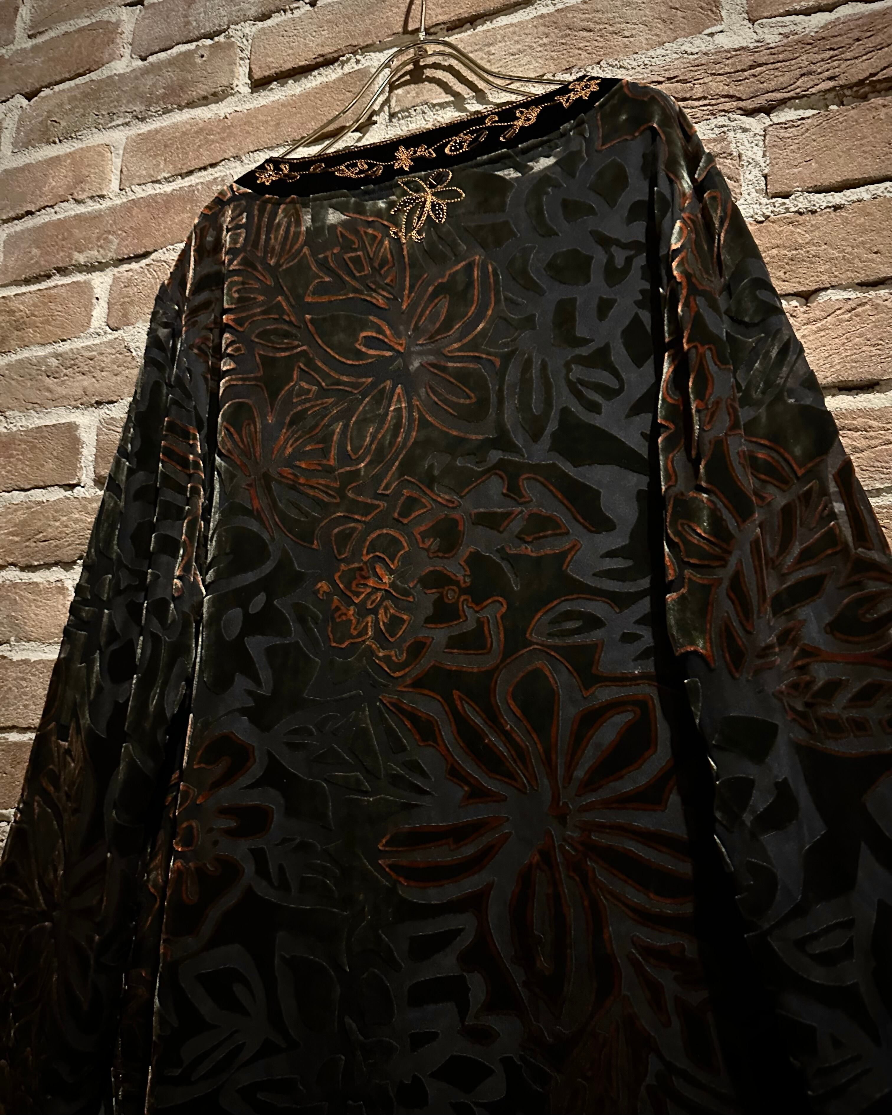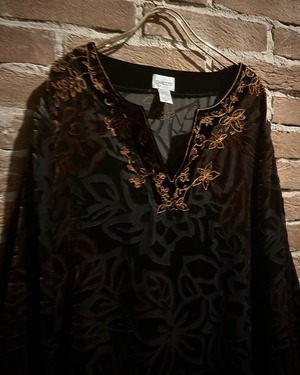 ブラックシアーのボディに、グラデーションがかったフロッキープリントで花柄を載せたスキッパーシャツ。