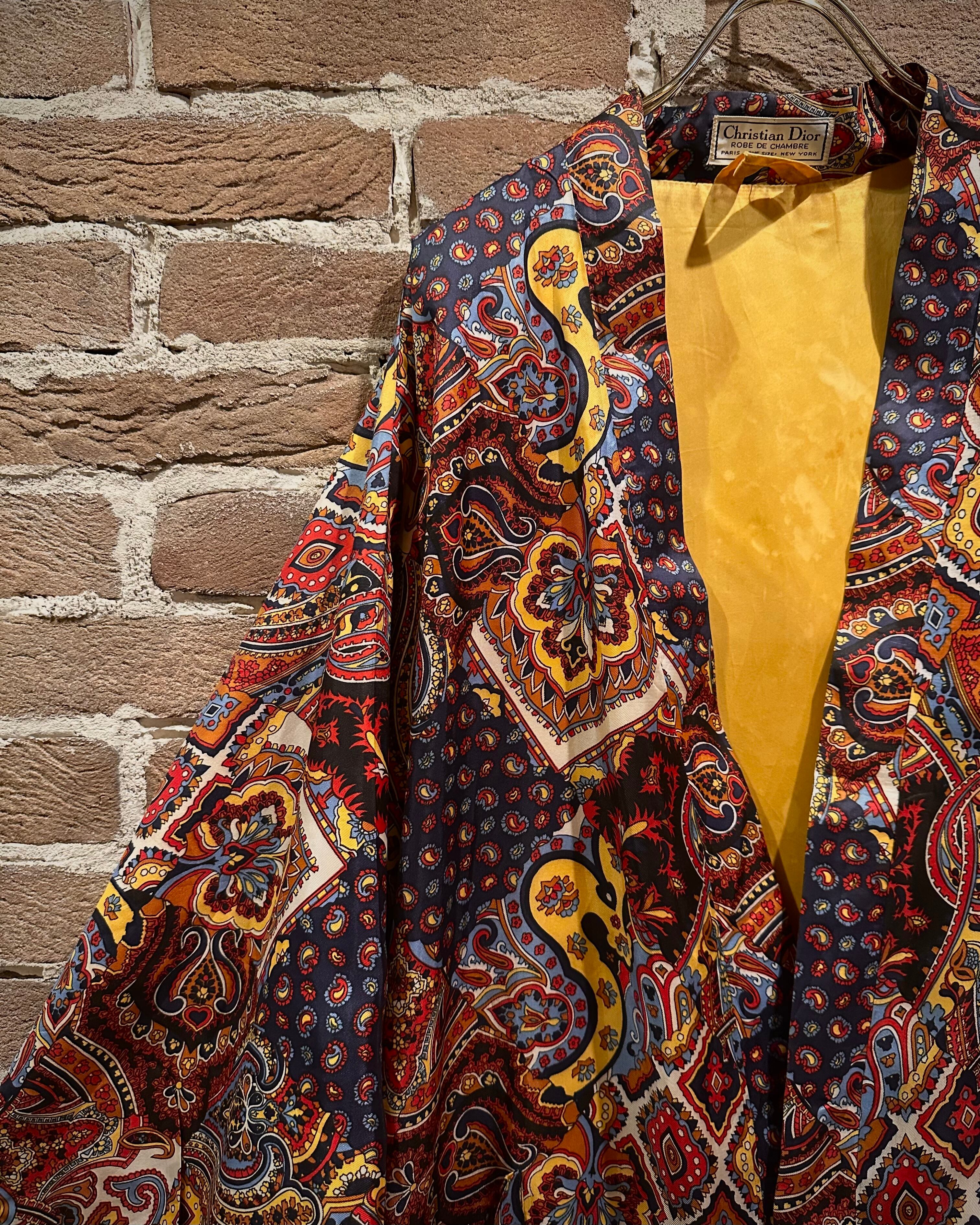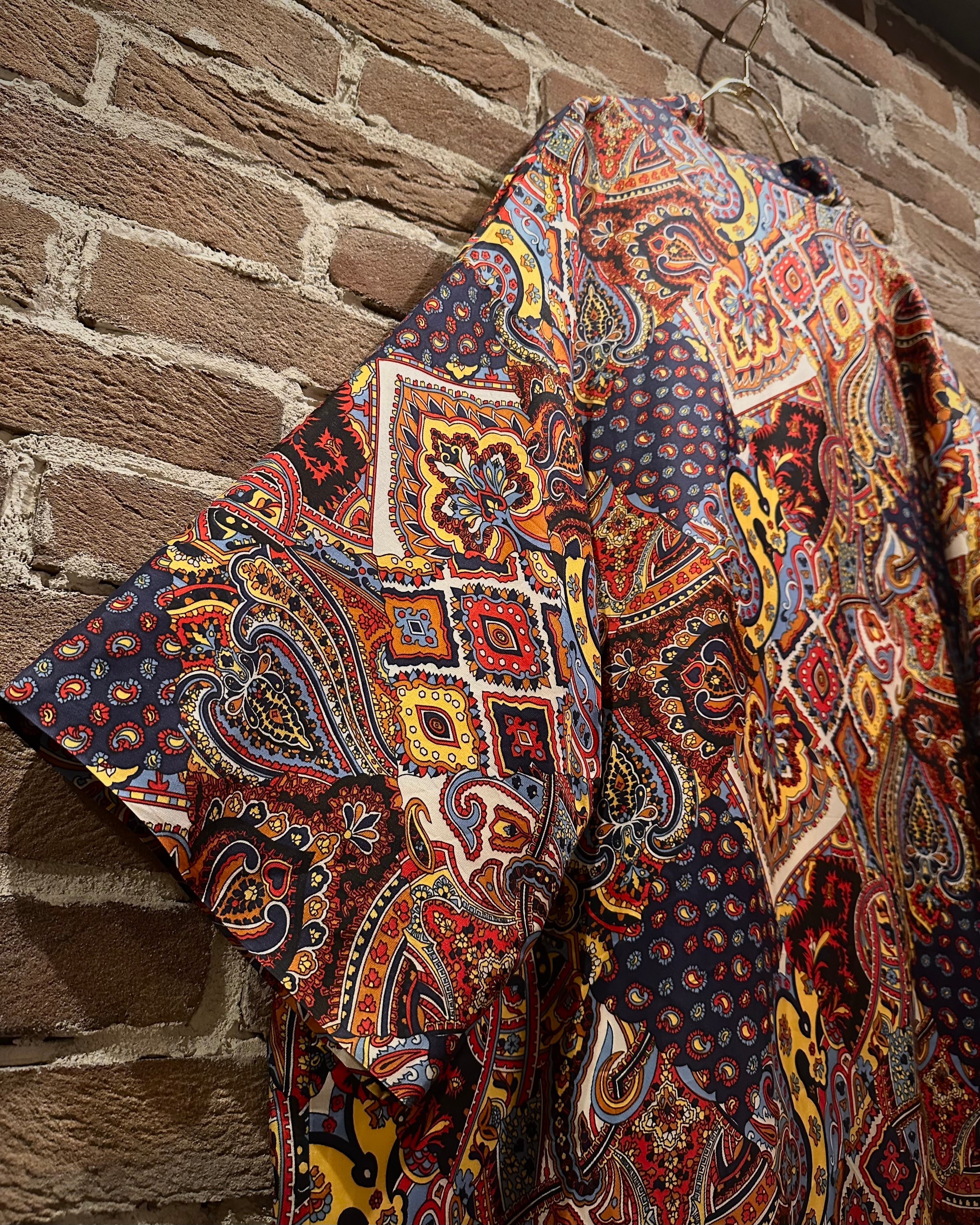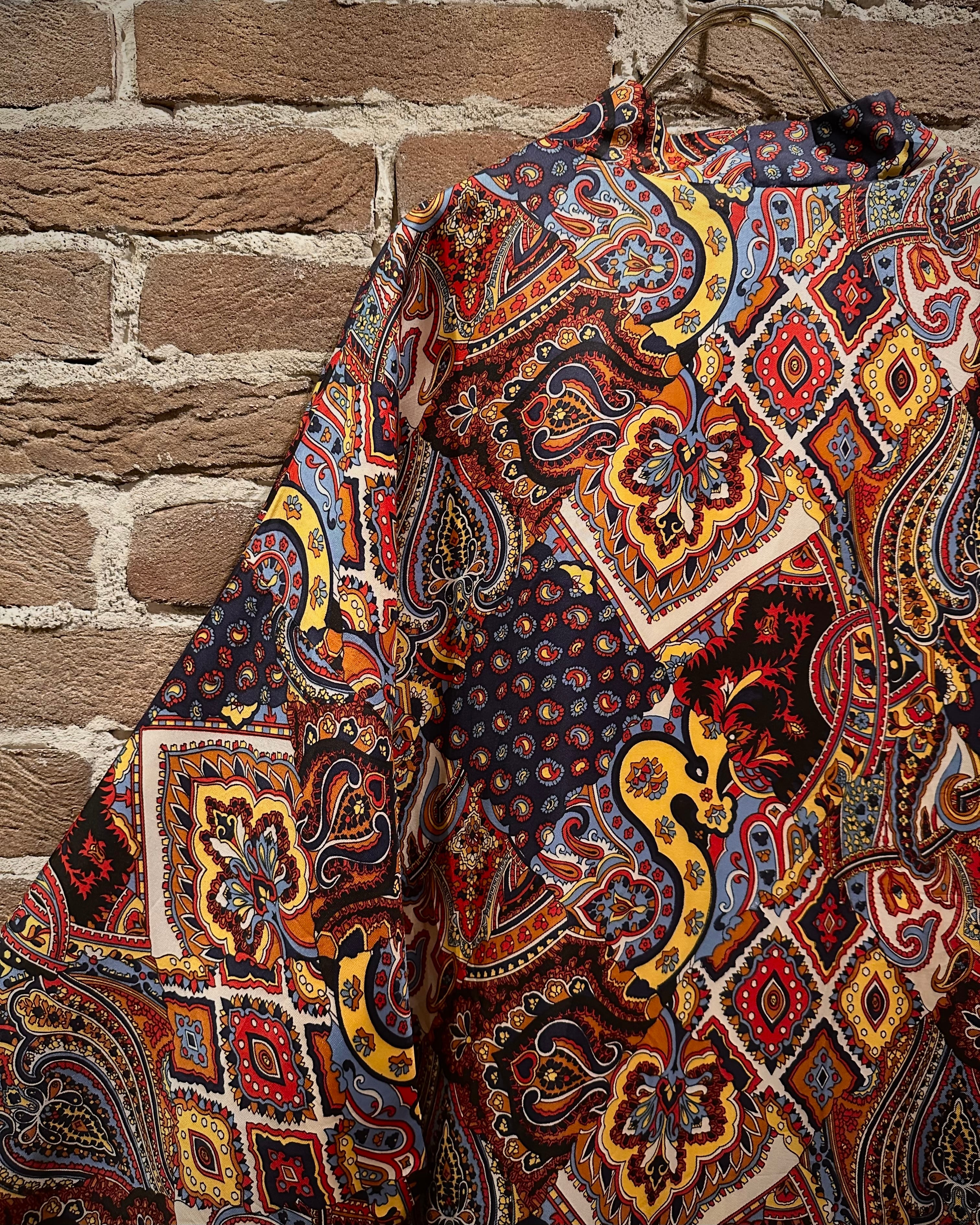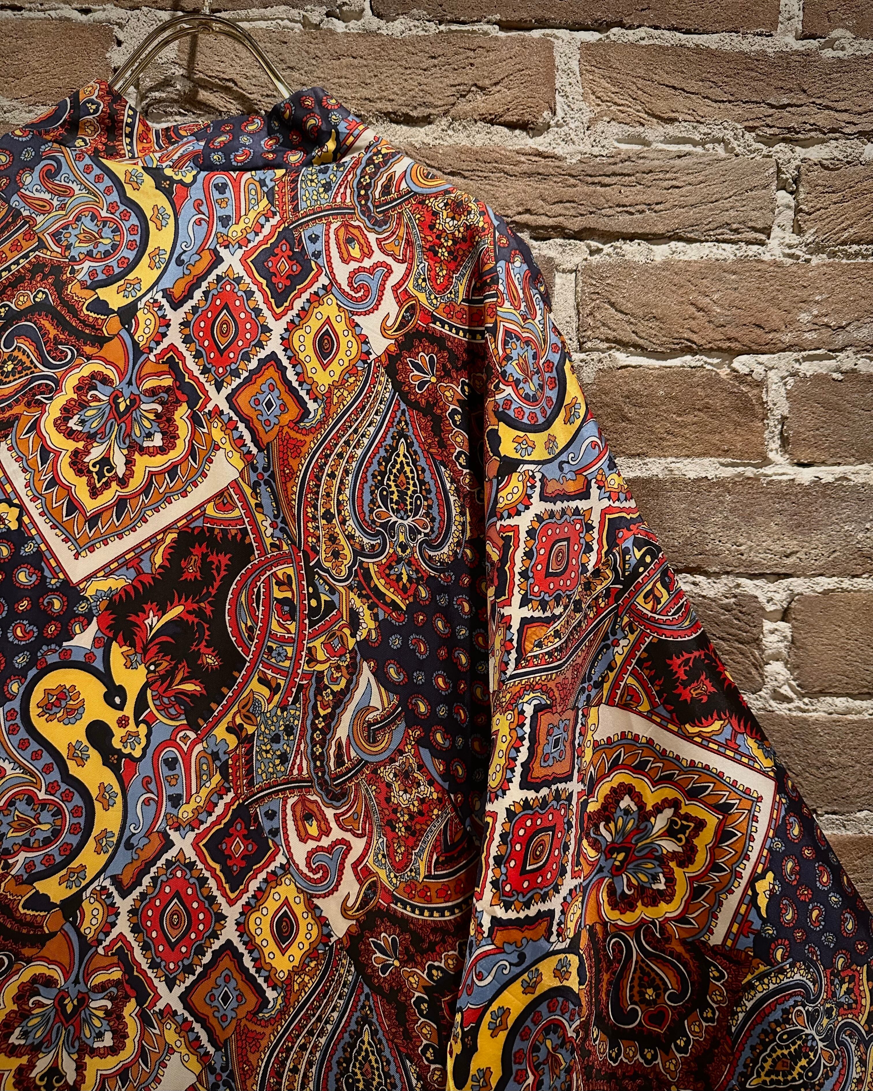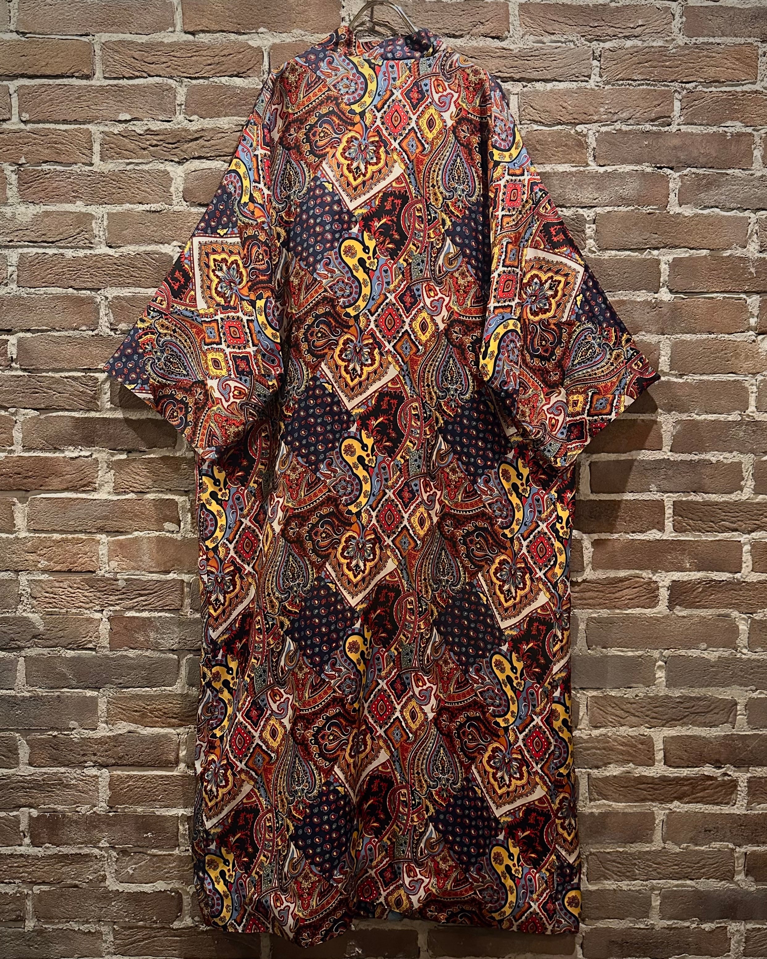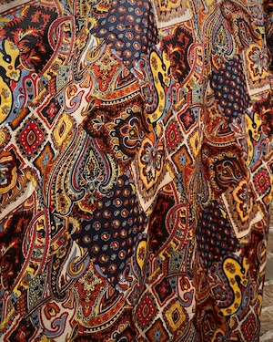 深みのあるマルチカラーを用いたペイズリーやジオメトリックを組み合わせた総柄のガウン。