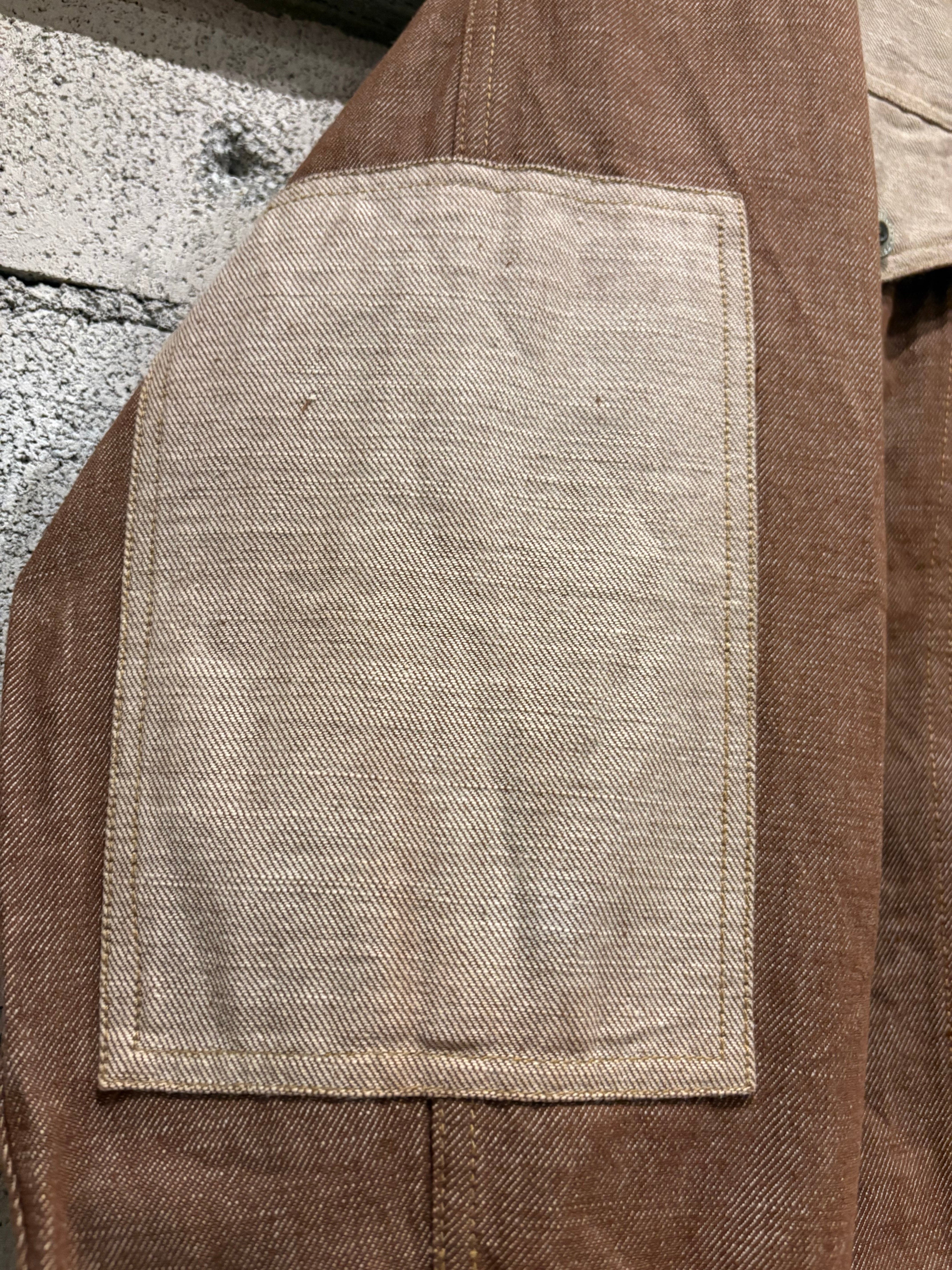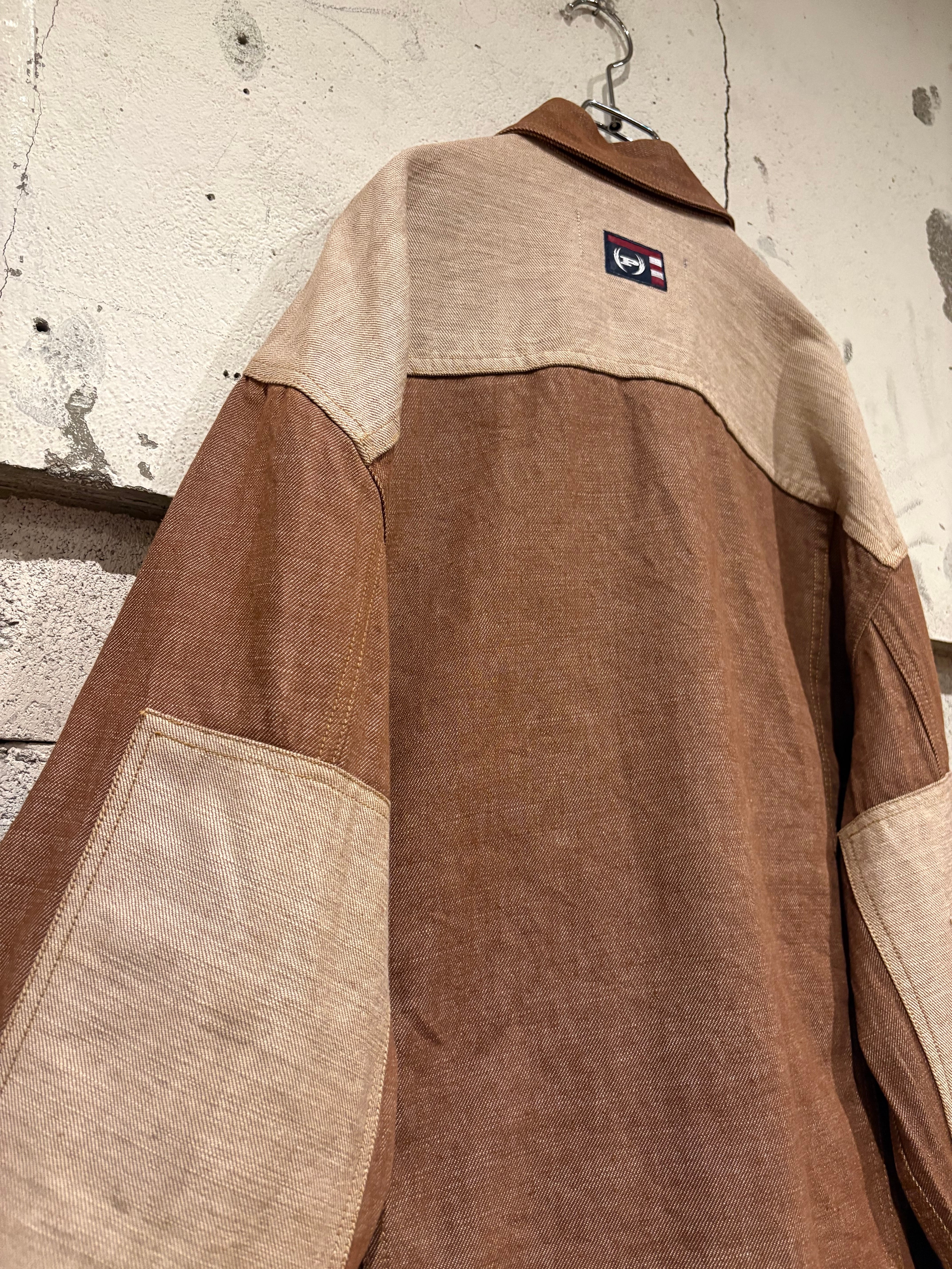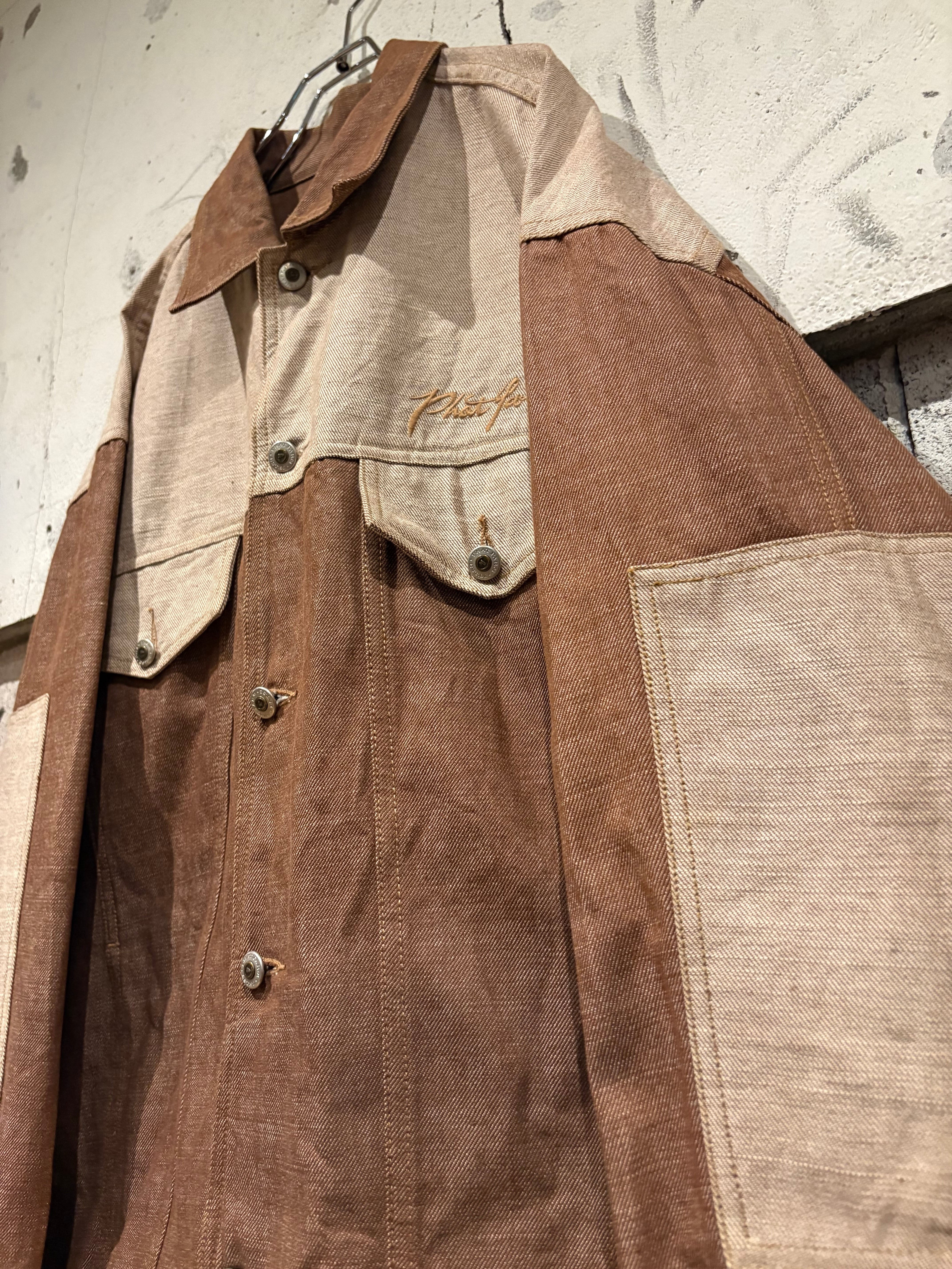 ブラウン×ベージュのデニム生地を用い、随所に切り替えを効かせた非常にデザイン性の高い逸品。ワークのディテールを踏襲しながらも、ストリートシーンでの存在感をしっかり放ちます。