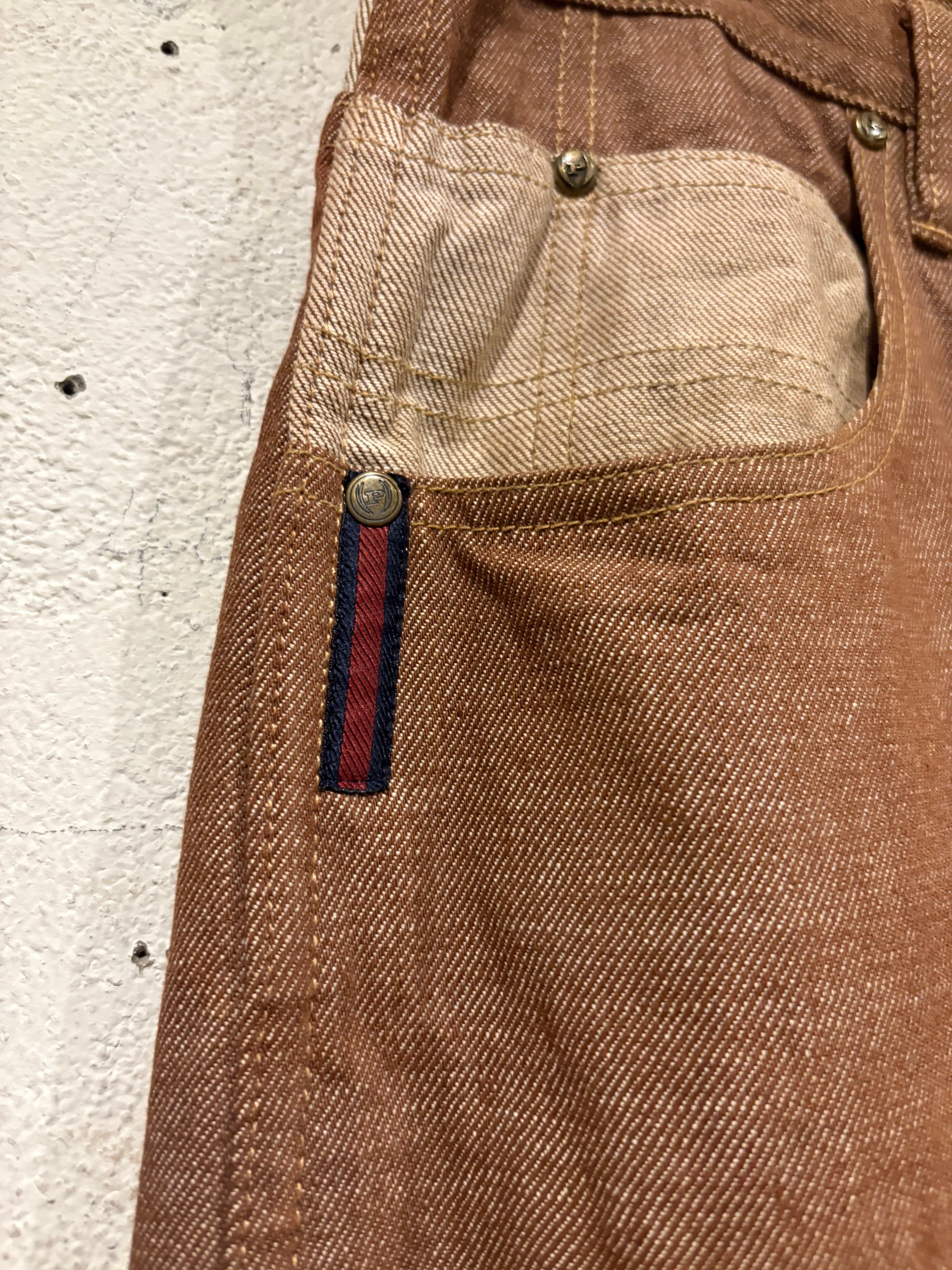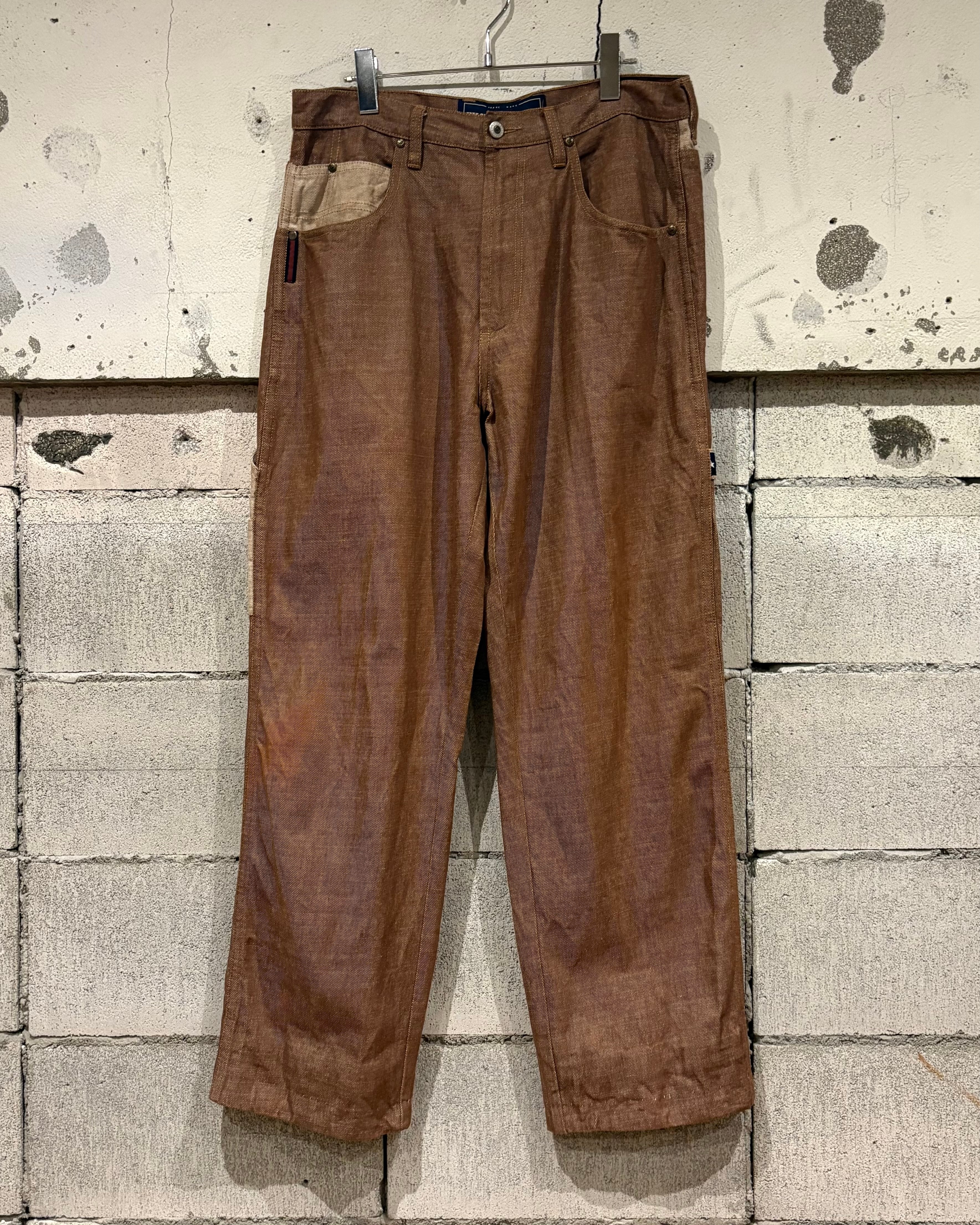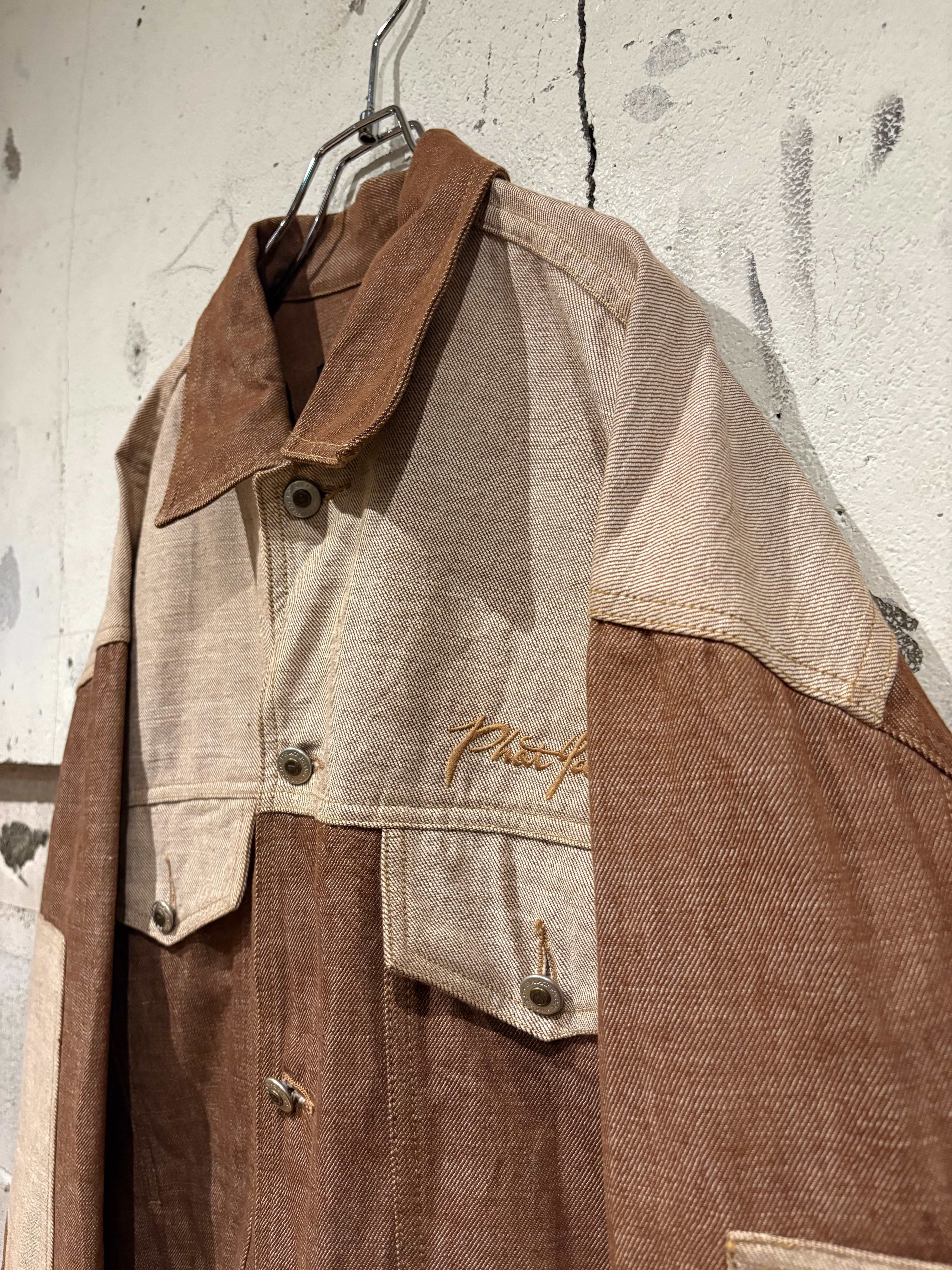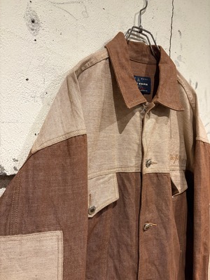 ブラウン×ベージュのデニム生地を用い、随所に切り替えを効かせた非常にデザイン性の高い逸品。ワークのディテールを踏襲しながらも、ストリートシーンでの存在感をしっかり放ちます。
