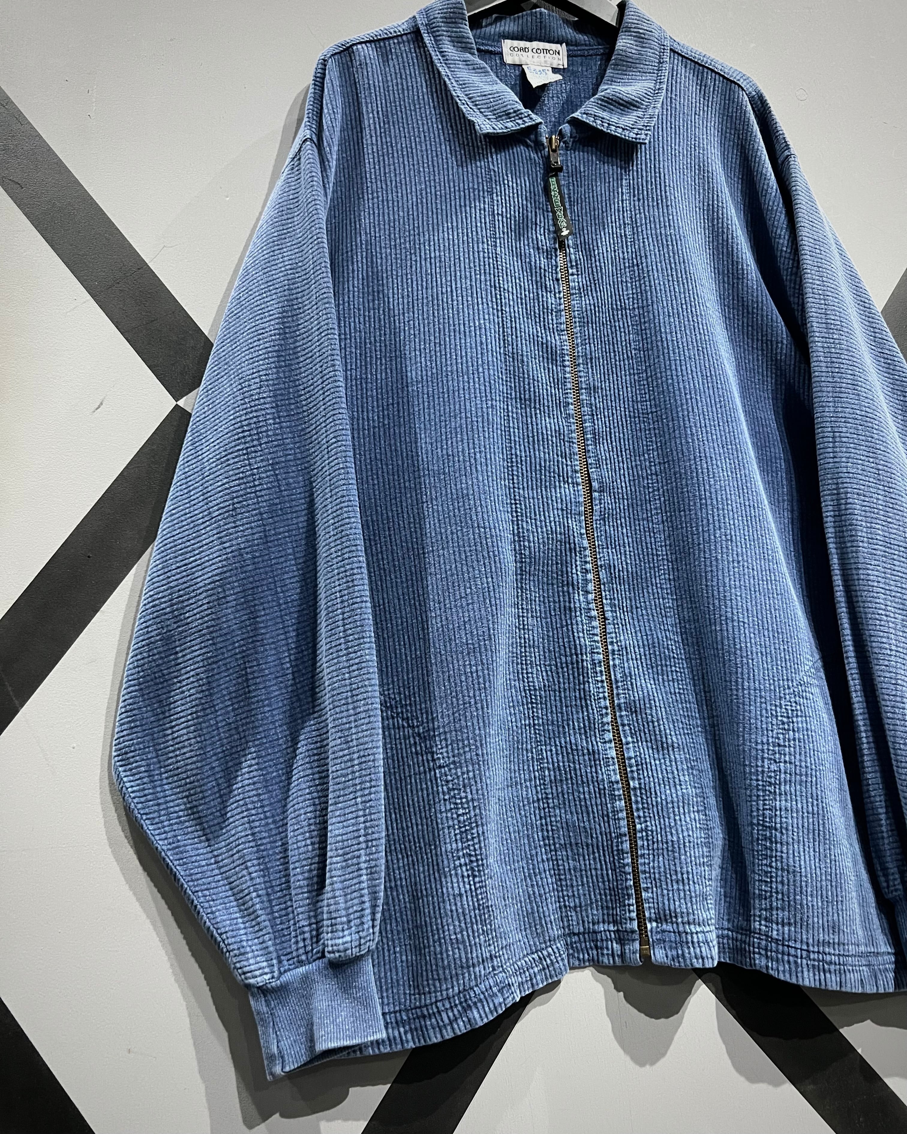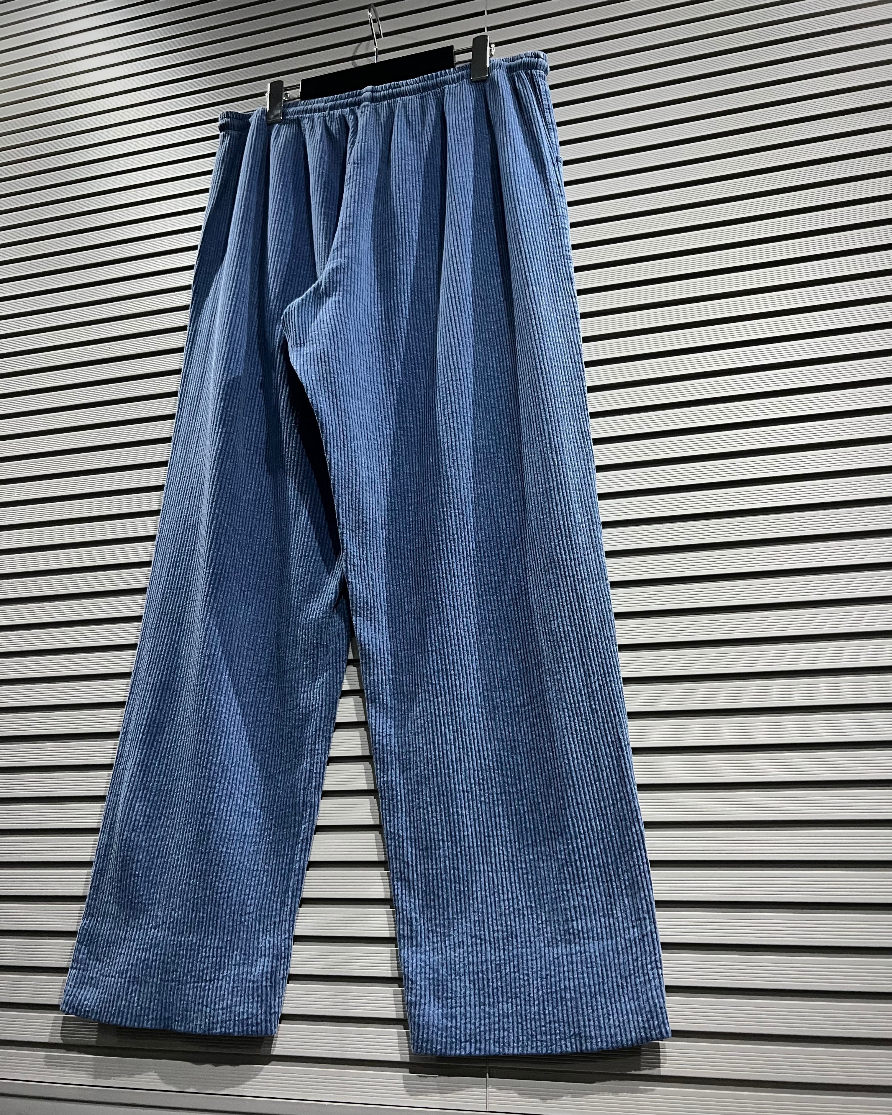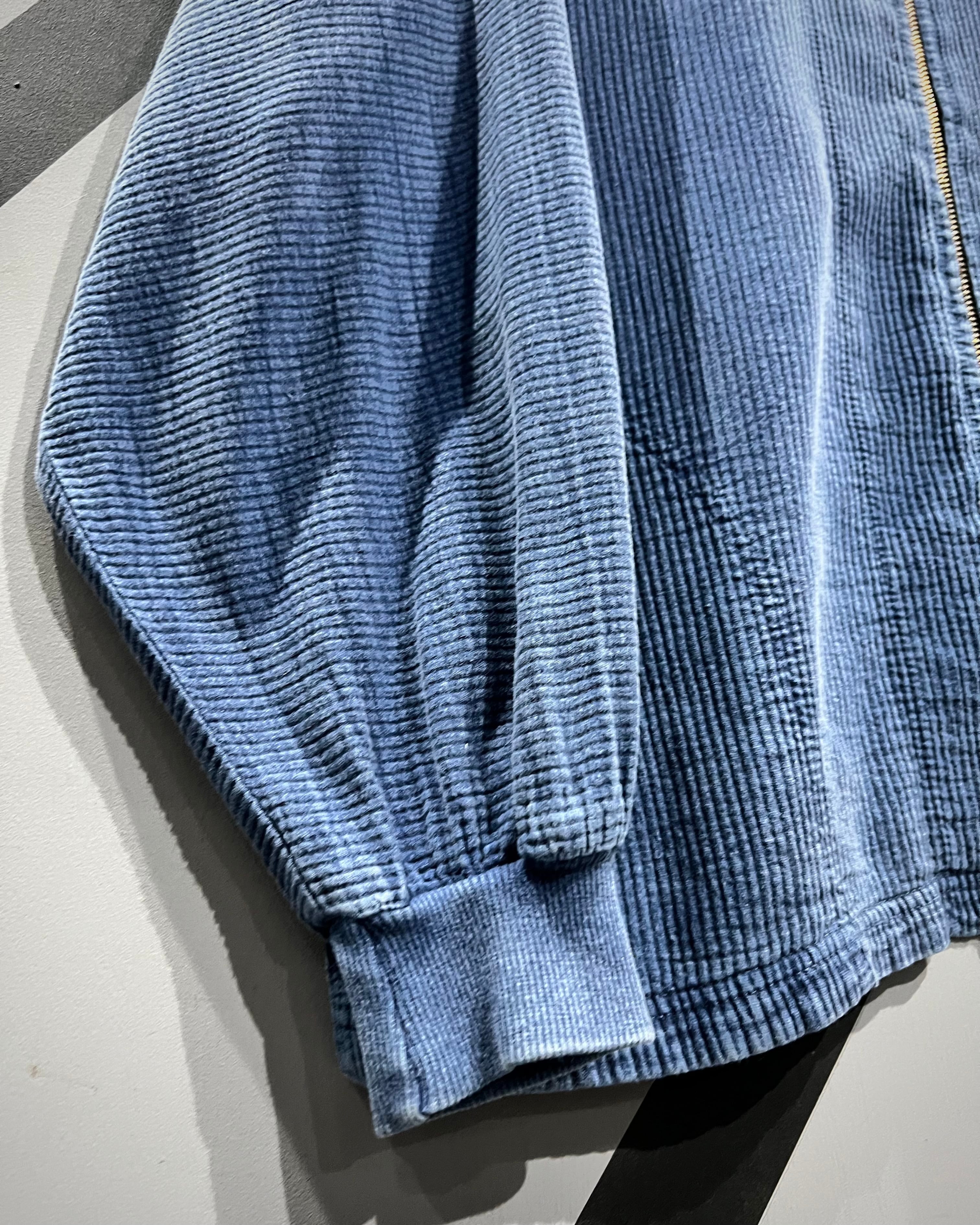 コーデュロイのような立体感のある素材を用いてジップアップジャケットのセットアップに仕上げた逸品。オールブルーの仕上がりですが、畝のある素材でのっぺりとせず、陰影が生まれます。