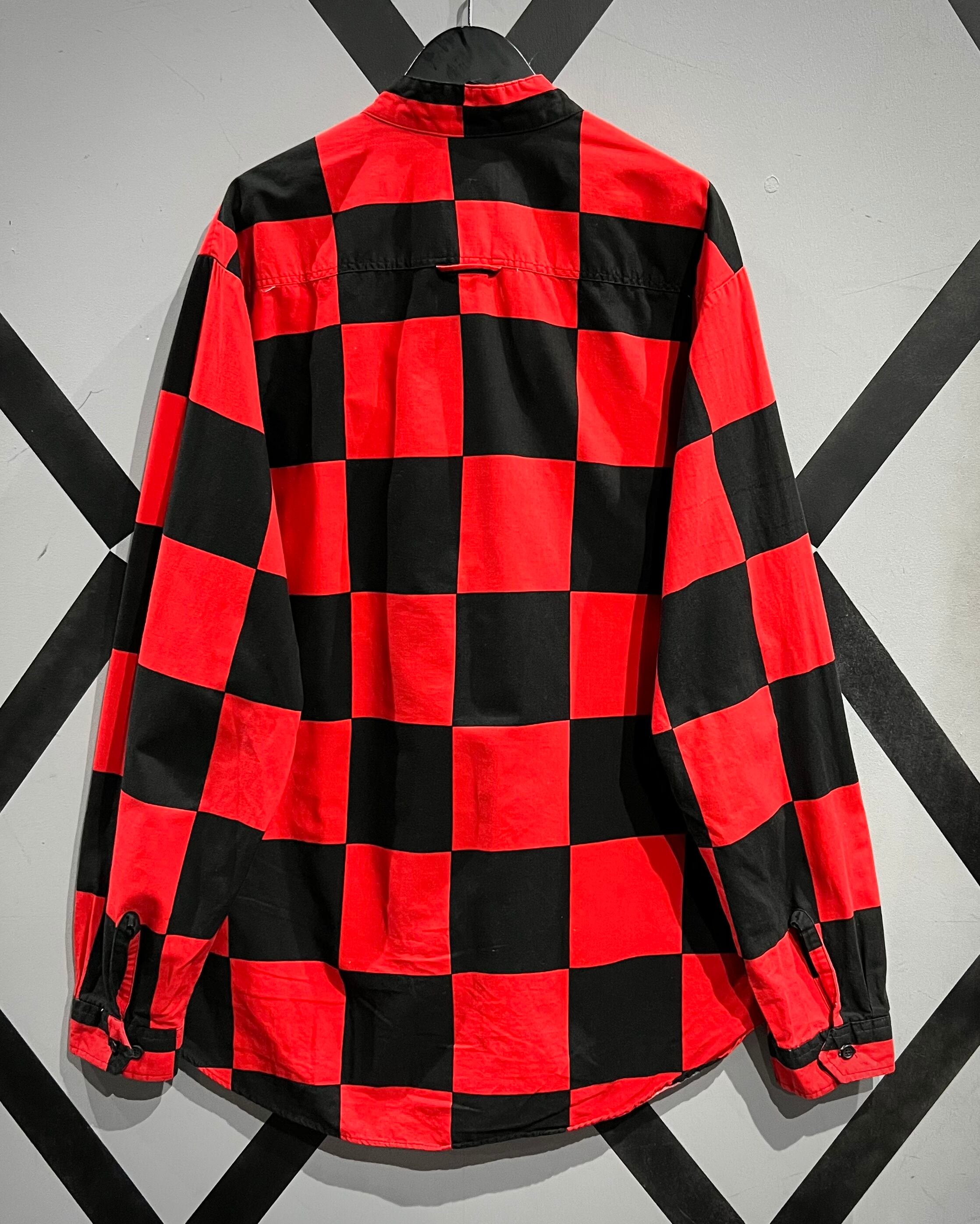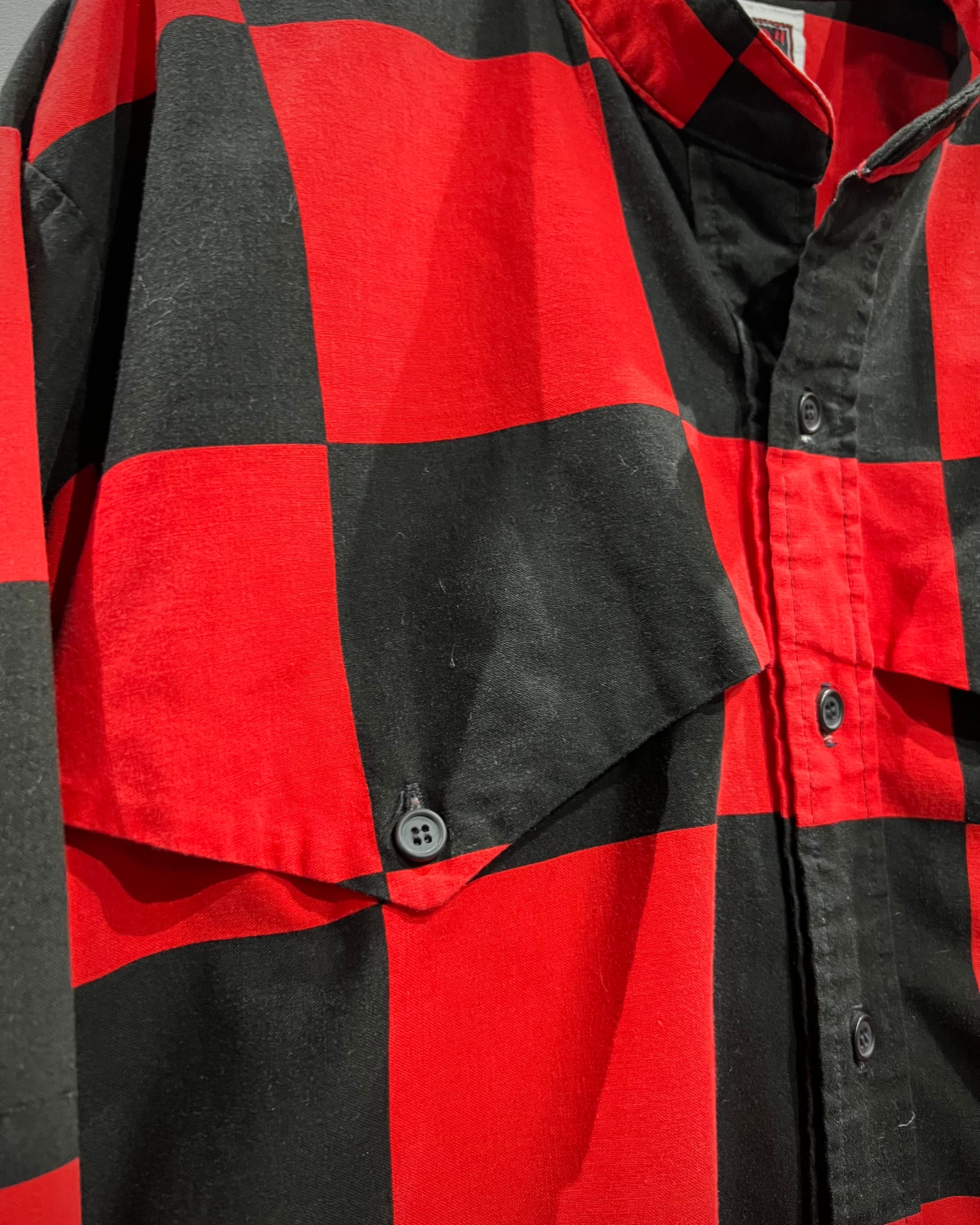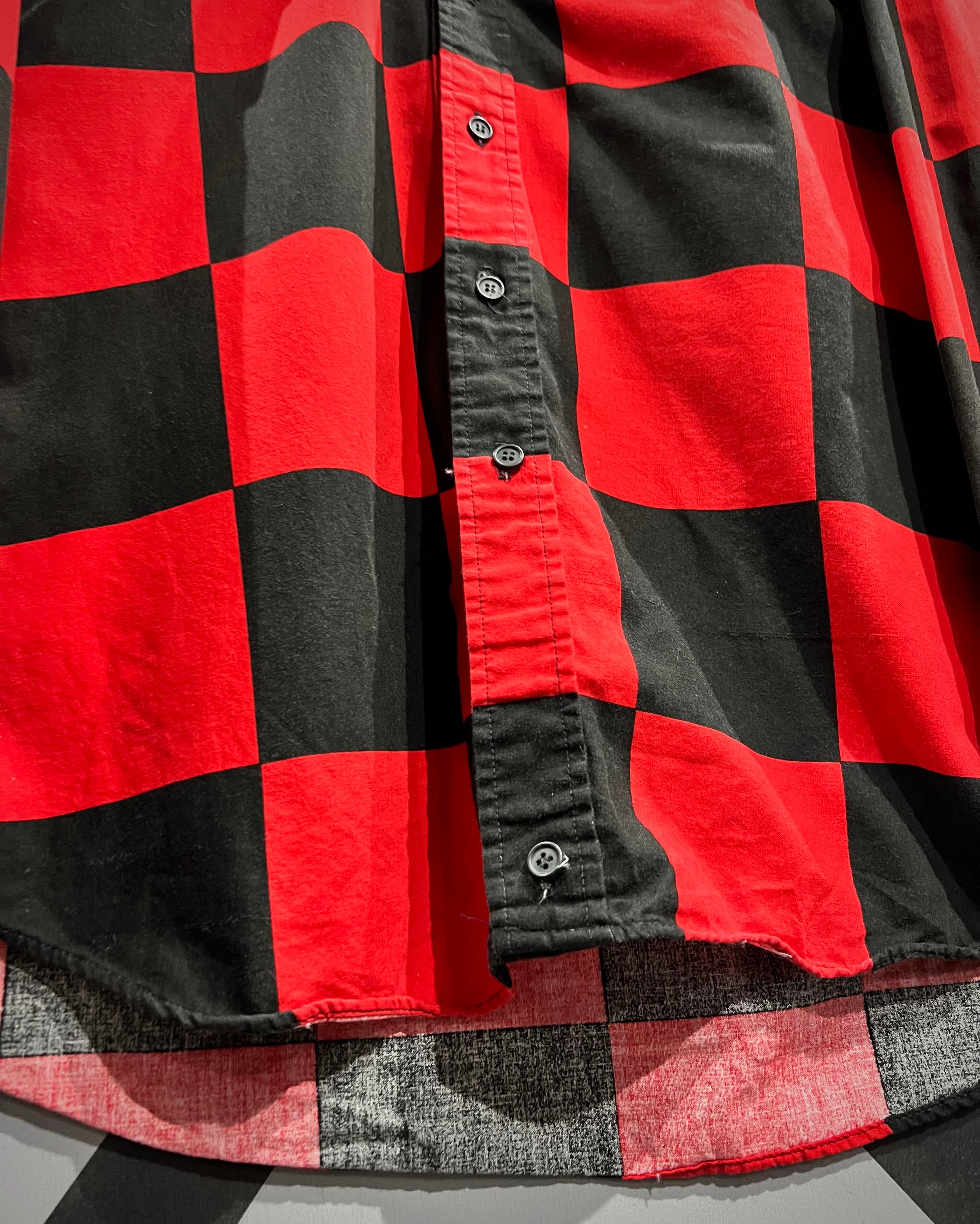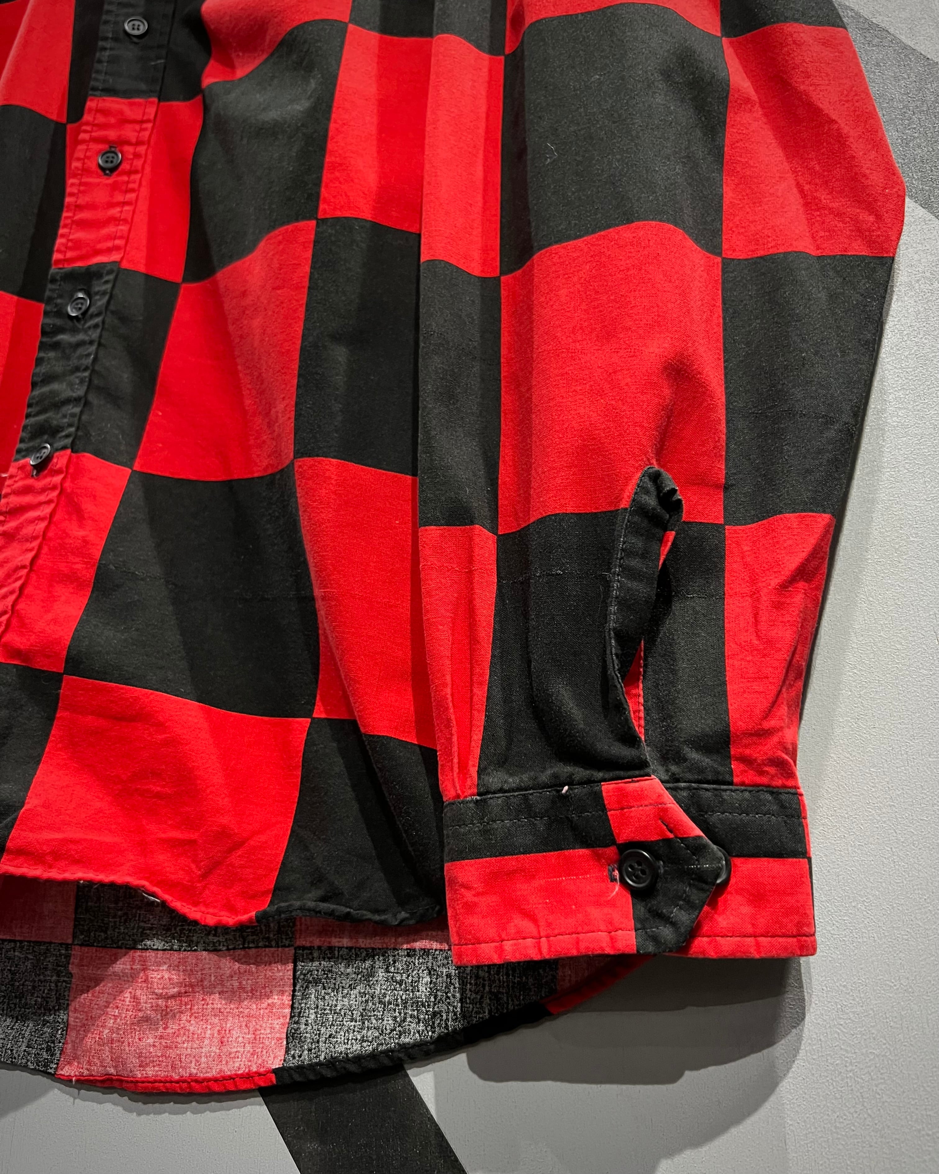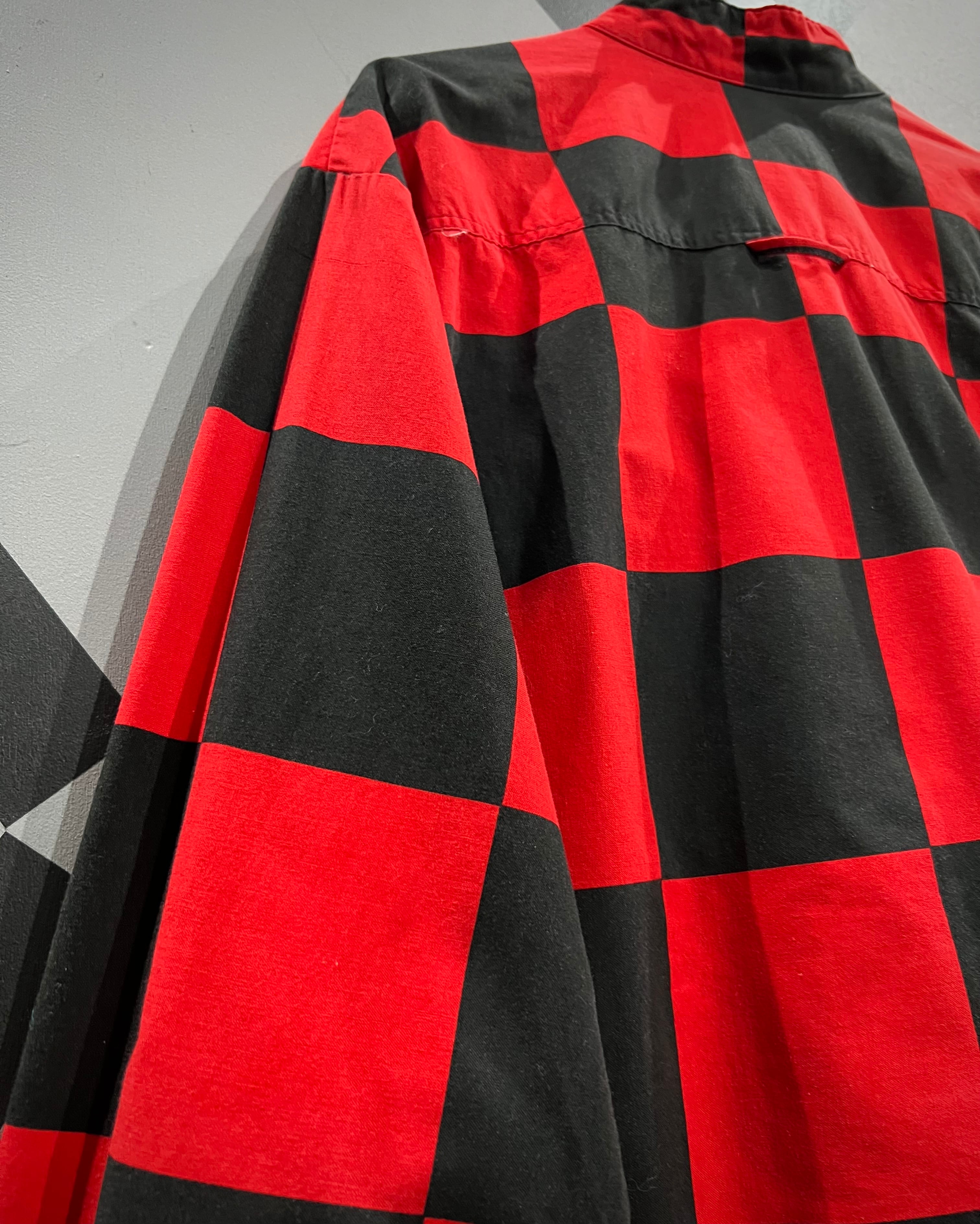 赤×黒のの大胆なブロックチェックを全面に配したインパクト抜群のデザインの長袖シャツ。